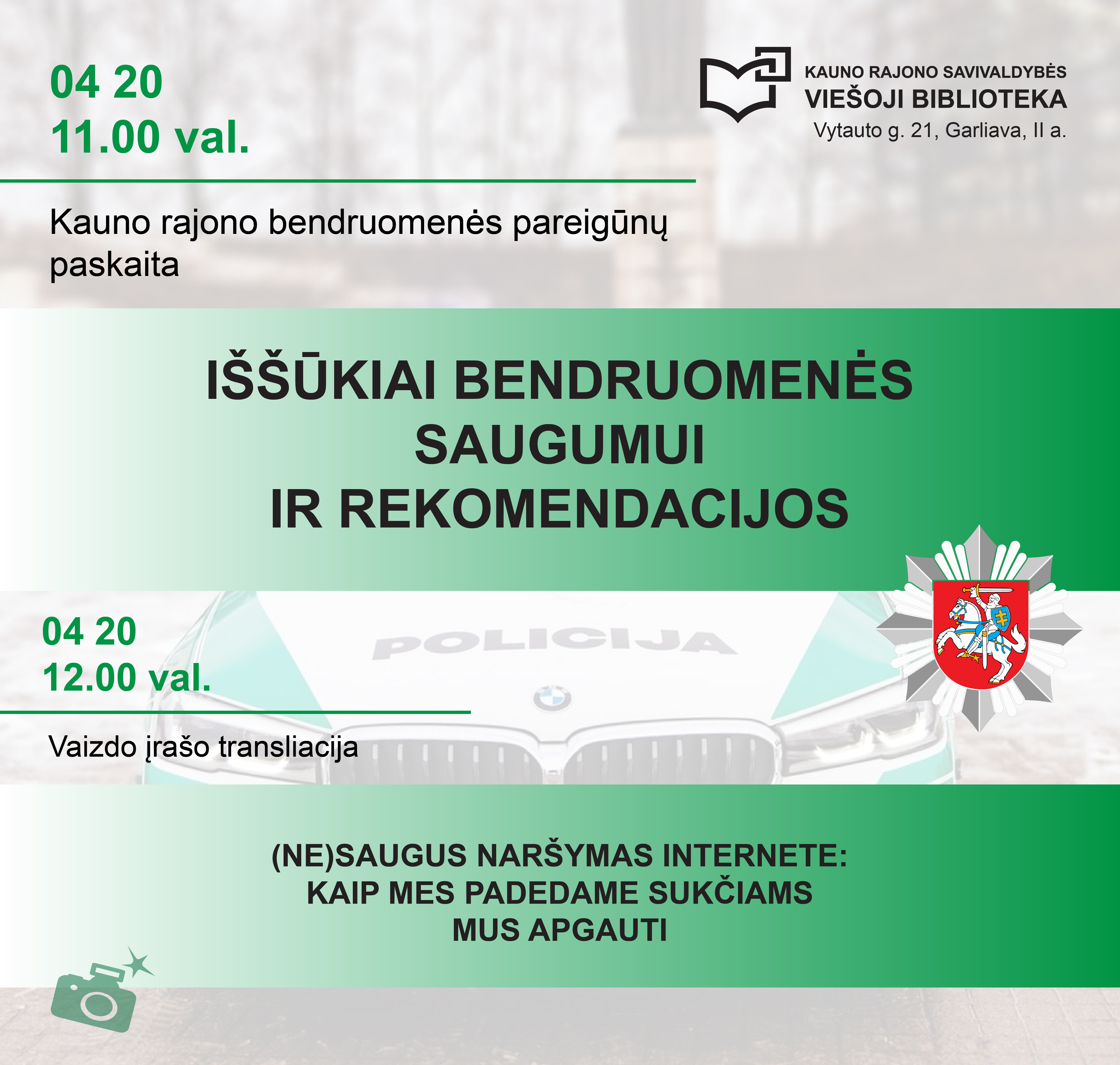 Ketvirtadienį, balandžio 20 d., Kauno rajono bendruomenės pareigūnai kviečia susitikti bibliotekoje. Kalbėsimės apie grėsmes, kylančias bendruomenės saugumui. Kokios nusikalstamumo formos labiausiai paplitusios Garliavos ir Garliavos apylinkių seniūnijose? Kokių sukčių reikia labiausiai saugotis ir į ką atkreipti dėmesį? Kaip išvengti telefoninių sukčių pinklių? Išgirsite atsakymus į šiuos klausimus ir daug naudingų rekomendacijų. Po pareigūnų paskaitos pakviesime žiūrėti vaizdo įrašą „[Ne]saugus naršymas internete: kaip mes padedame sukčiams mus apgauti“.
