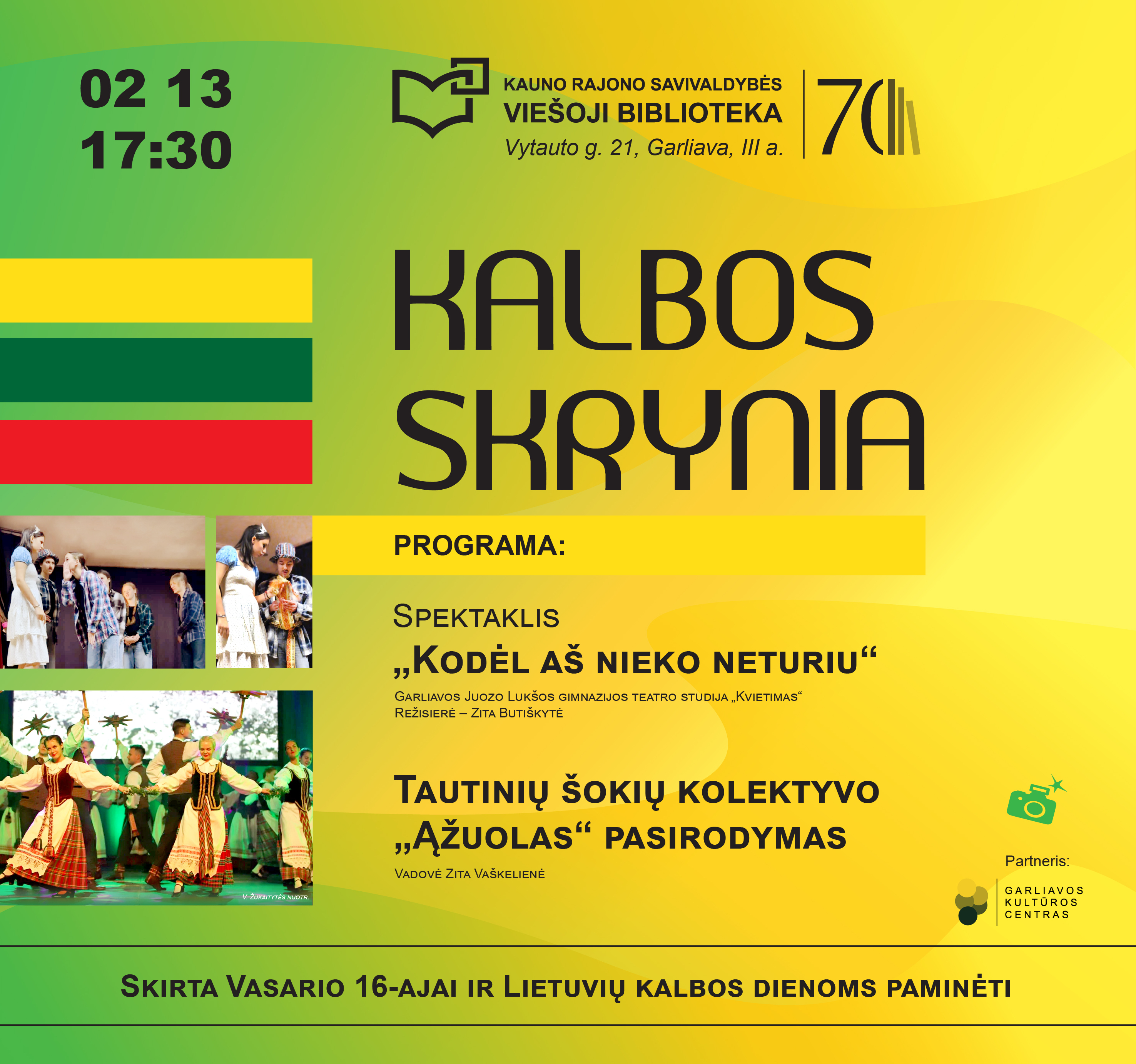Garliaviečius ir svečius kviečiame į bibliotekos renginį, skirtą Vasario 16-ajai ir Lietuvių kalbos dienoms paminėti. Džiaugiamės, kad turime lietuvišką žodį, lietuvišką rūbą, lietuvišką pasaką, lietuvišką melodiją ir daug kitų gėrybių. Tai puiki proga švęsti savo tautiškumą! Prisijungsite?