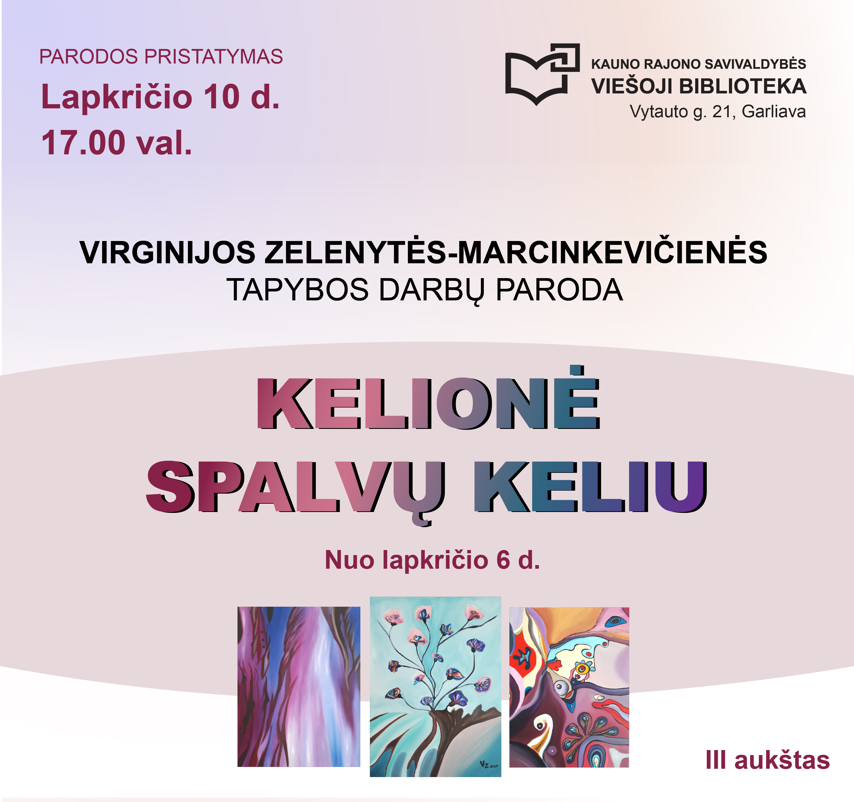 ▬ Kauno rajono savivaldybės viešoji biblioteka kviečia į penktąją Virginijos Zelenytės-Marcinkevičienės personalinę parodą „Kelionė spalvų keliu“.