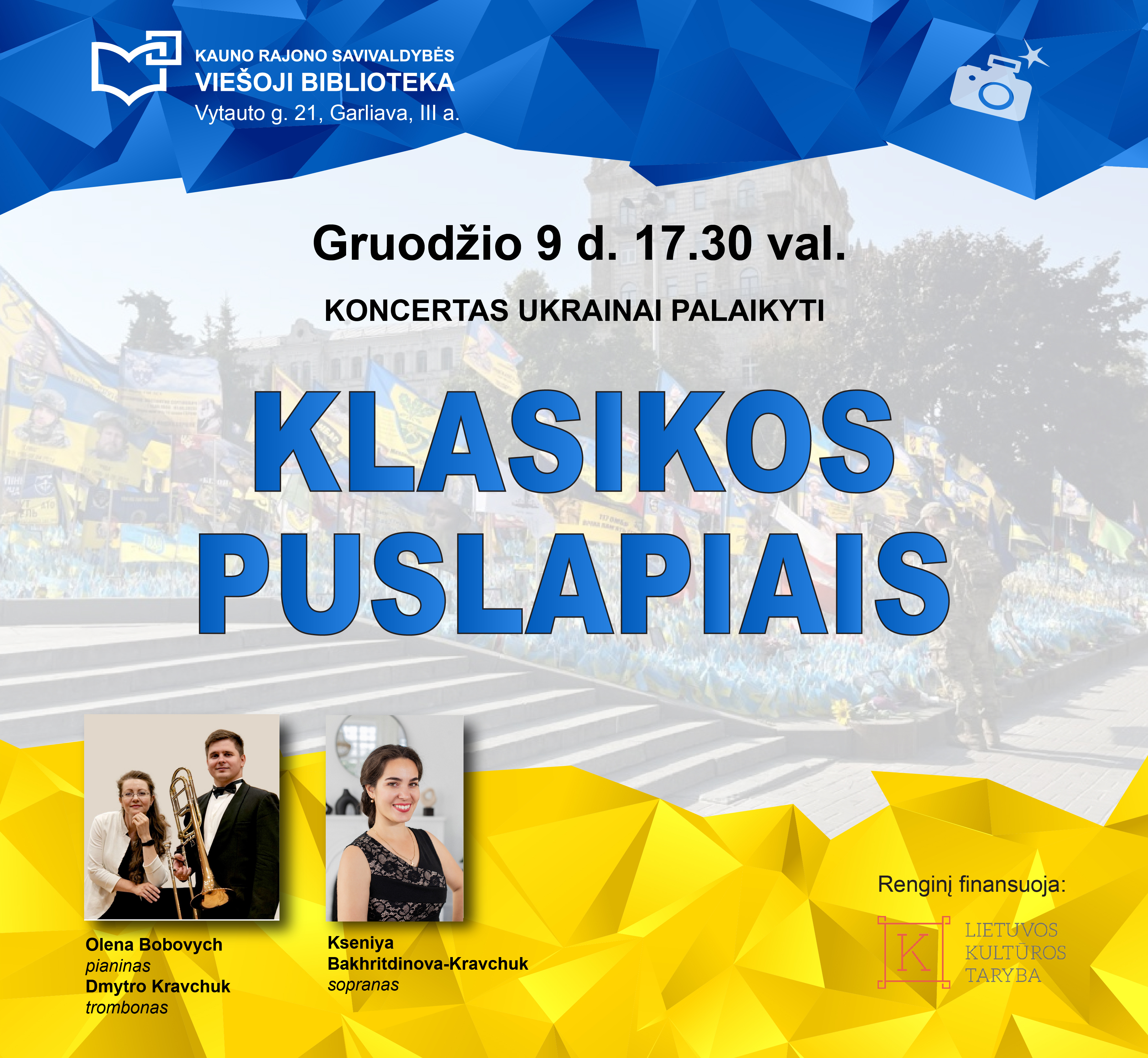 Gruodžio 9 d. 17.30 val. kviečiame Jus į klasikinės vokalinės ir instrumentinės muzikos koncertą „Klasikos puslapiais“, skirtą Ukrainai palaikyti. Skambės ukrainiečių autorių muzika ir žinomi kūriniai iš pasaulinės klasikos lobynų. Renginį finansuoja Lietuvos kultūros taryba (https://www.ltkt.lt/ ).