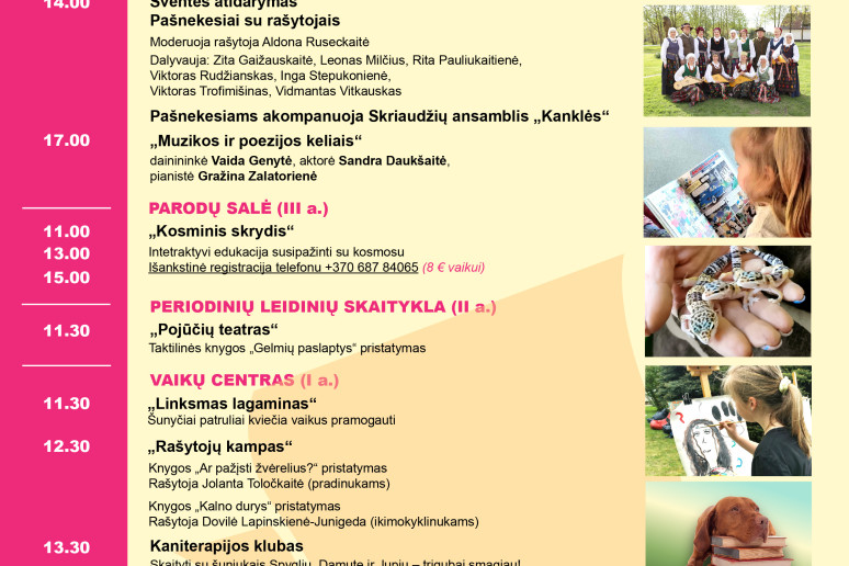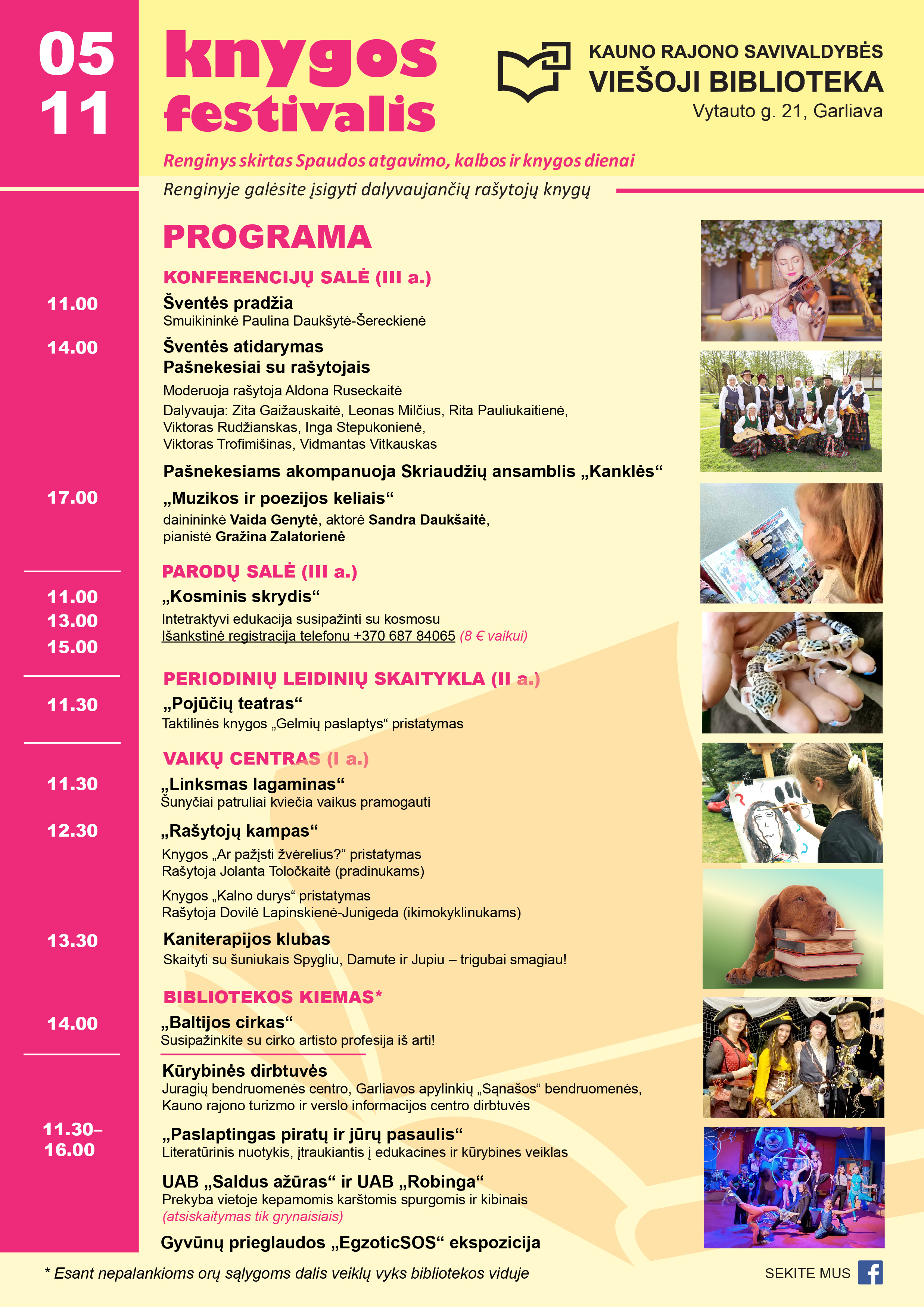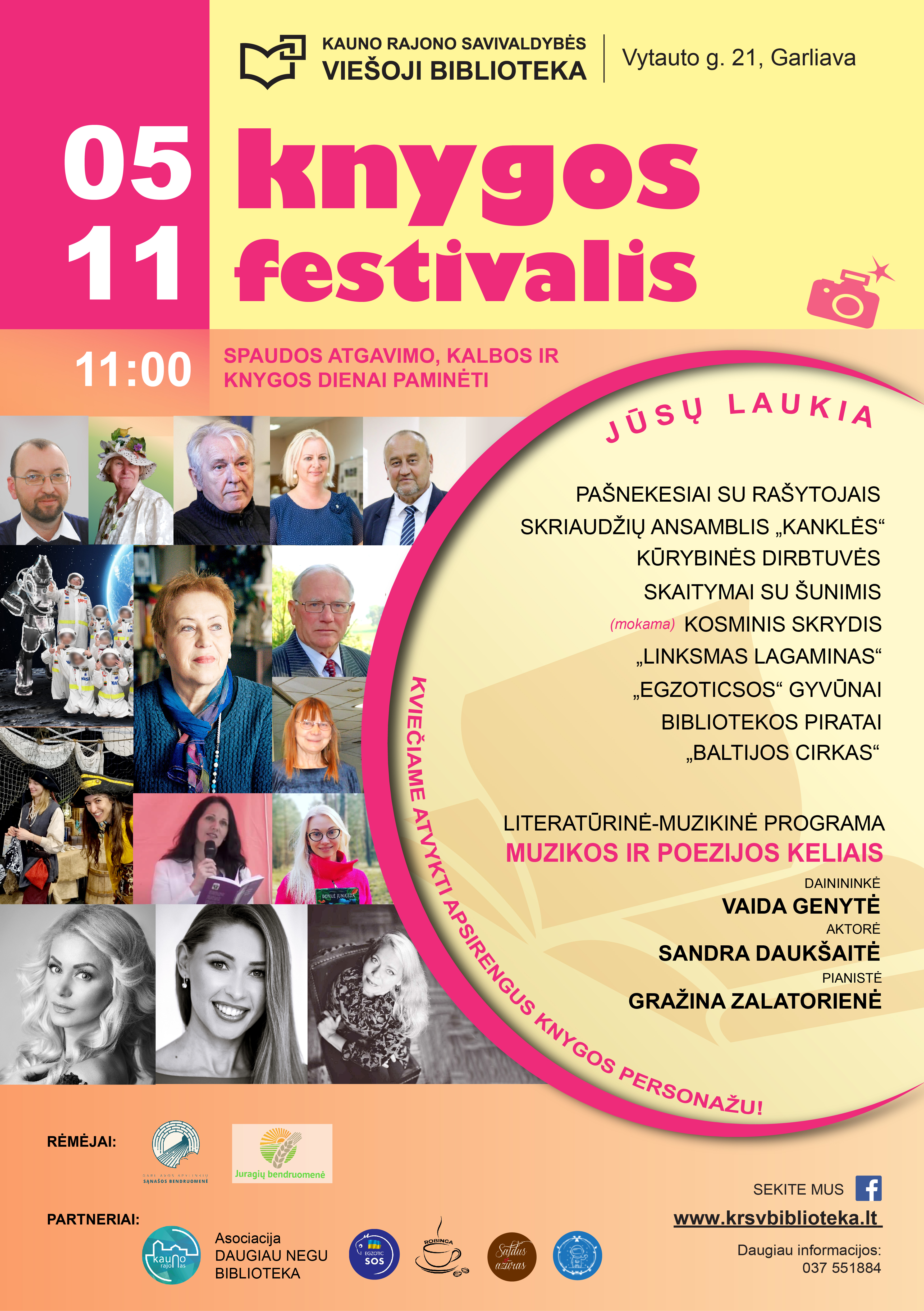 Kviečiame Jus į KNYGOS FESTIVALĮ – didžiausią knygų šventę Kauno rajone! Gausi ir įdomi literatūrinė programa, nenuspėjami ir atviri pašnekesiai su Kauno rajono rašytojais, edukacinės, pramoginės bei interaktyvios veiklos vyks visą dieną. Šventę užbaigs dainininkės Vaidos Genytės, aktorės Sandros Daukšaitės ir pianistės Gražinos Zalatorienės literatūrinė-muzikinė programa „Muzikos ir poezijos keliais“.