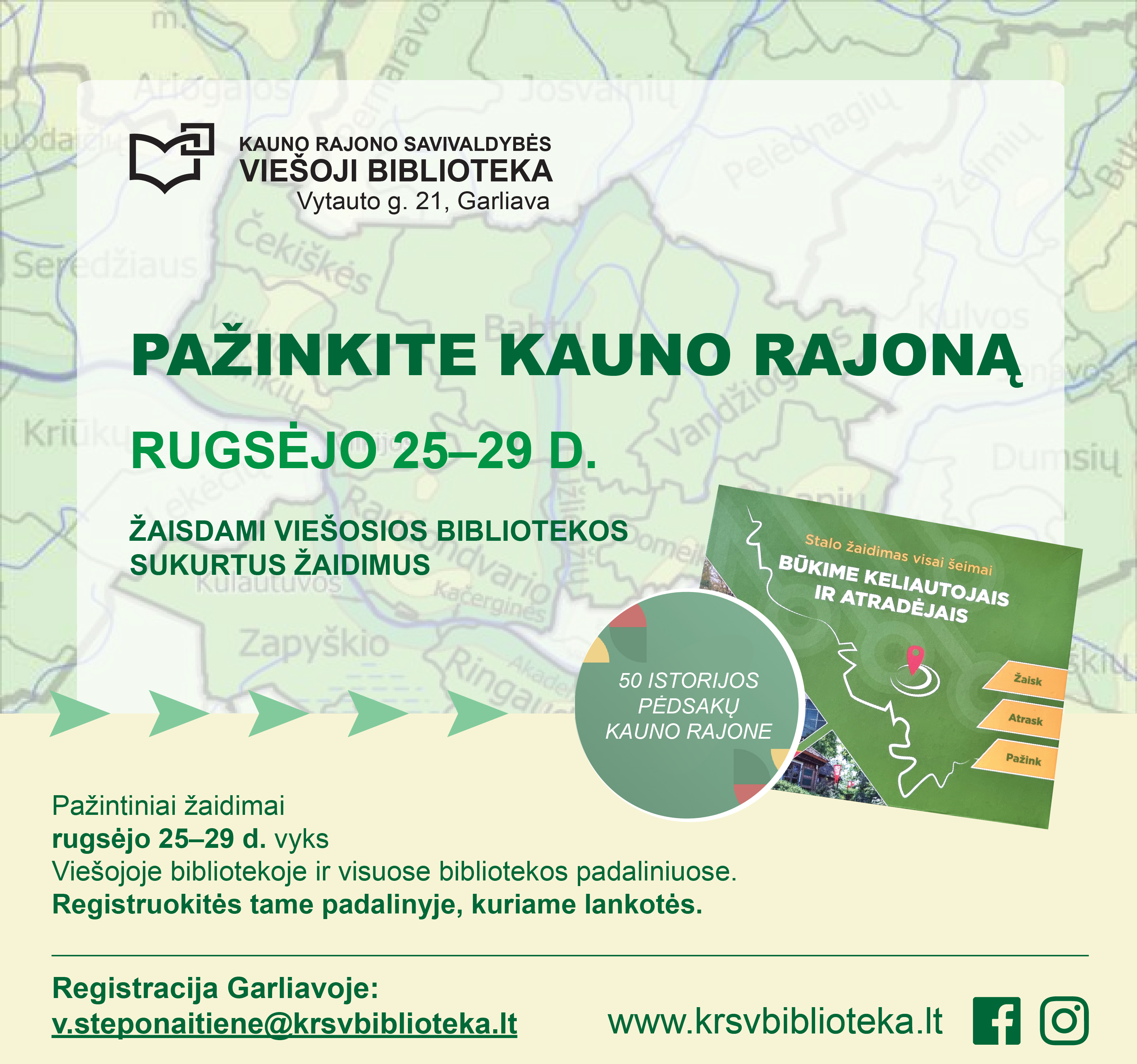 Pažintiniai žaidimai rugsėjo 25–29 d. vyks Viešojoje bibliotekoje (Garliavoje) ir visuose bibliotekos padaliniuose. Tad registruokitės tame padalinyje, kuriame lankotės. Visų padalinių kontaktus rasite bibliotekos interneto svetainėje: https://www.krsvbiblioteka.lt/padaliniai-kontaktai/