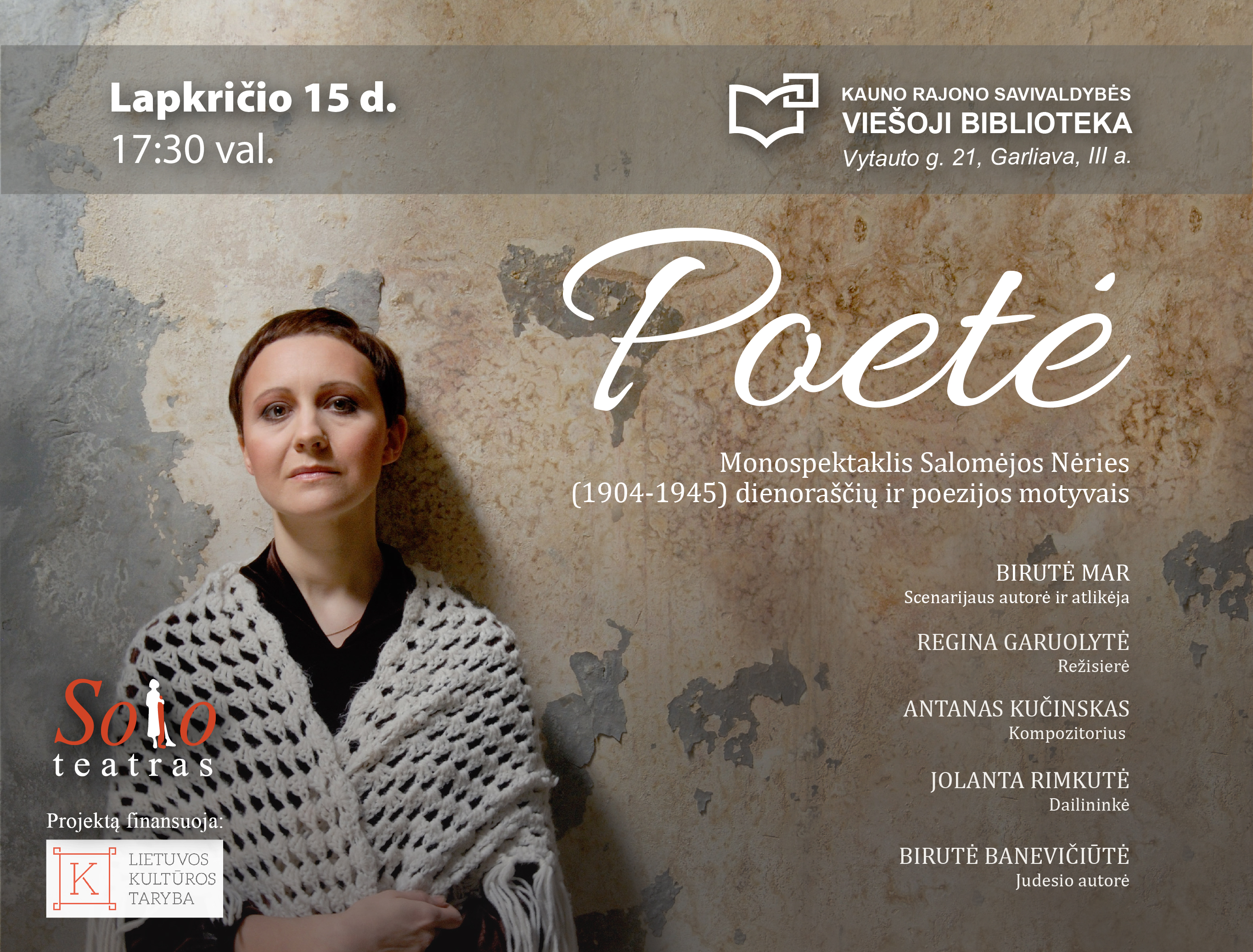 ▬ Birutės Mar monospektaklis „Poetė“ – apie ryškiausios praėjusio amžiaus lietuvių poetės S. Nėries likimą, jau virtusį universaliu XX a. menininko tragiškos lemties mitu.