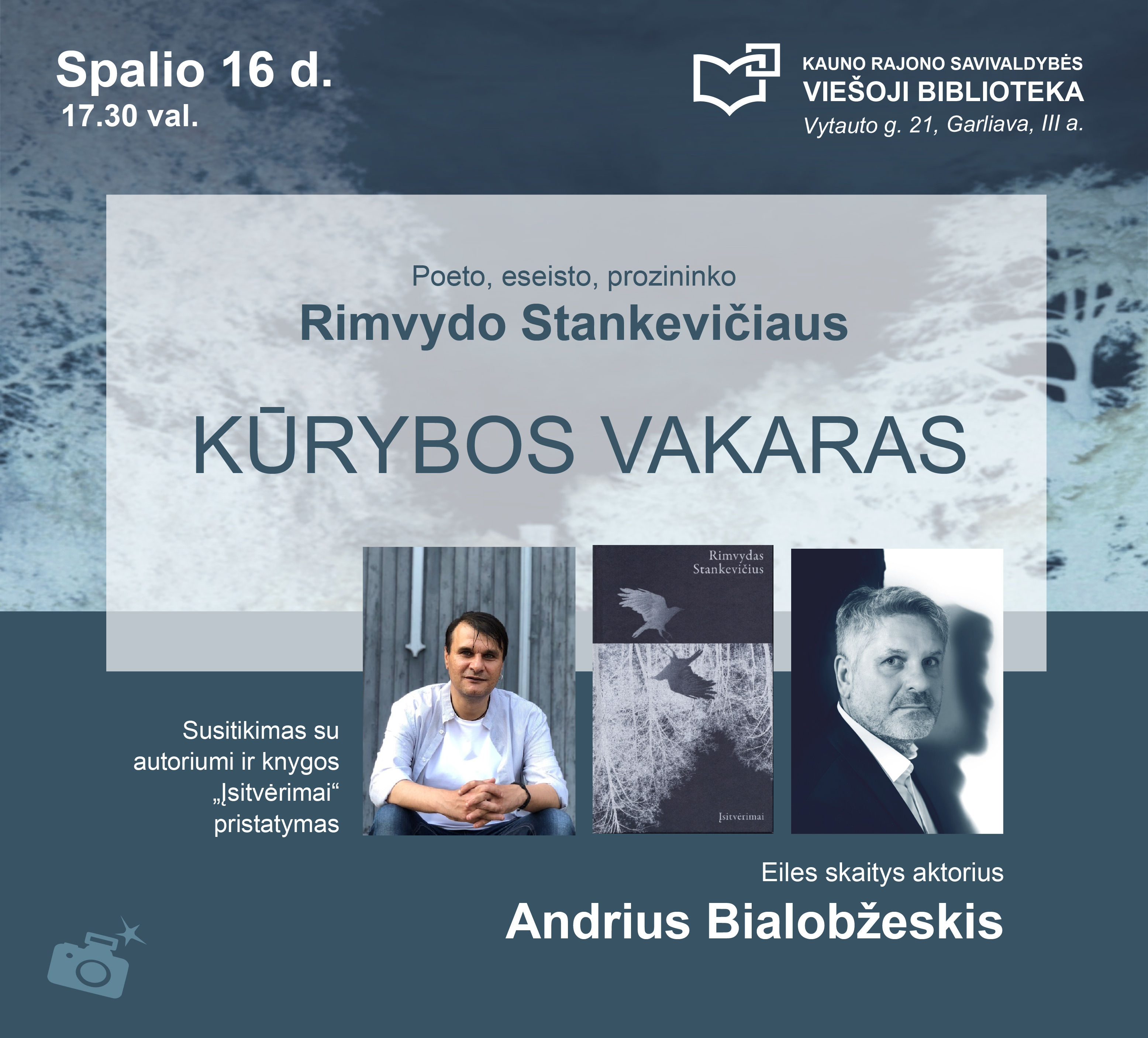 Spalio 16 d., trečiadienį, 17.30 val. Kauno rajono savivaldybės viešojoje bibliotekoje, III aukšte, Konferencijų salėje, susitiksime su poetu, eseistu, prozininku Rimvydu Stankevičiumi. Įvyks dešimtojo autoriaus poezijos rinkinio „Įsitvėrimai“ pristatymas. Eiles skaitys aktorius Andrius Bialobžeskis.
