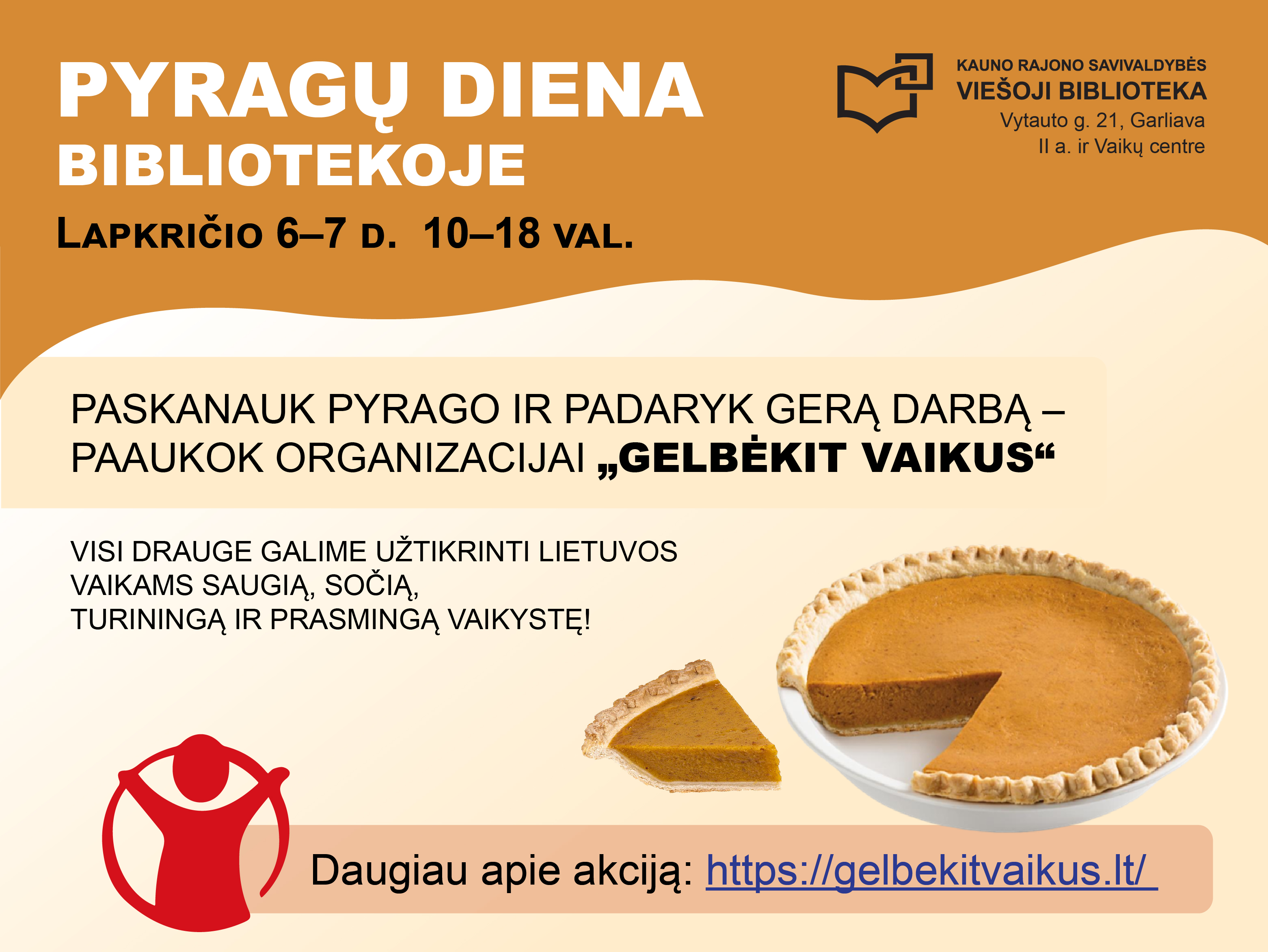 Lapkričio 6–7 d. 10.00–18.00 val. paskanaukite pyrago bibliotekoje ir padarykite gerą darbą – paaukokite organizacijai „Gelbėkit vaikus“.