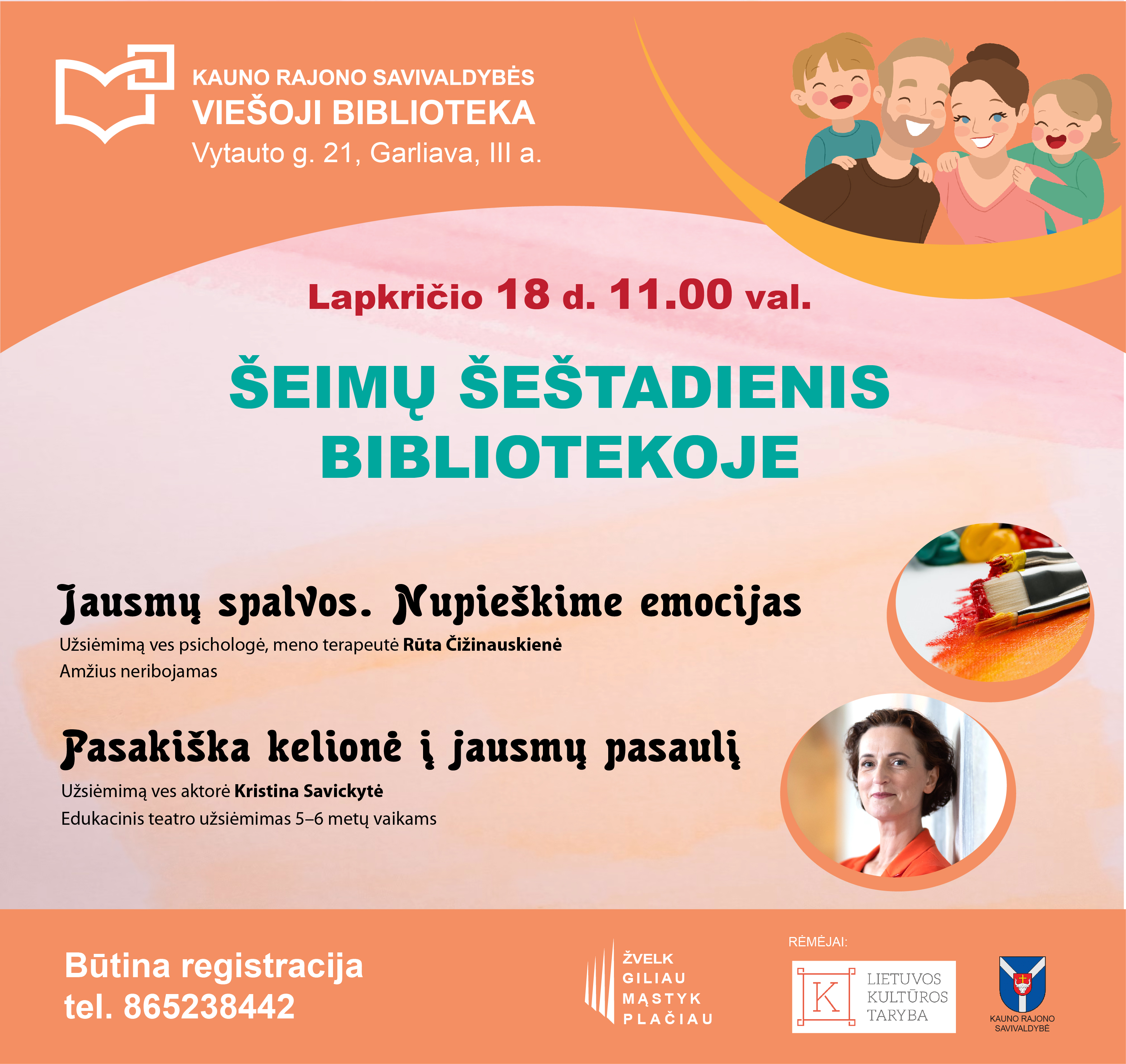 Lapkričio mėnesį Šeimų šeštadienis bibliotekoje bus jausmingas, pozityvus ir meniškas. Šeimos kasdienybę lydinčius jausmus aptarsime remdamiesi dviem meniniais rakursais – piešimu ir teatru. Jei sukate galvą, kaip kurti harmoningą ir saugią šeimos emocinę aplinką, kurioje vaikai augtų ir tobulėtų kaip asmenybės, ateikite į biblioteką – šie užsiėmimai padės Jums kūrybiškai siekti savo tikslo.