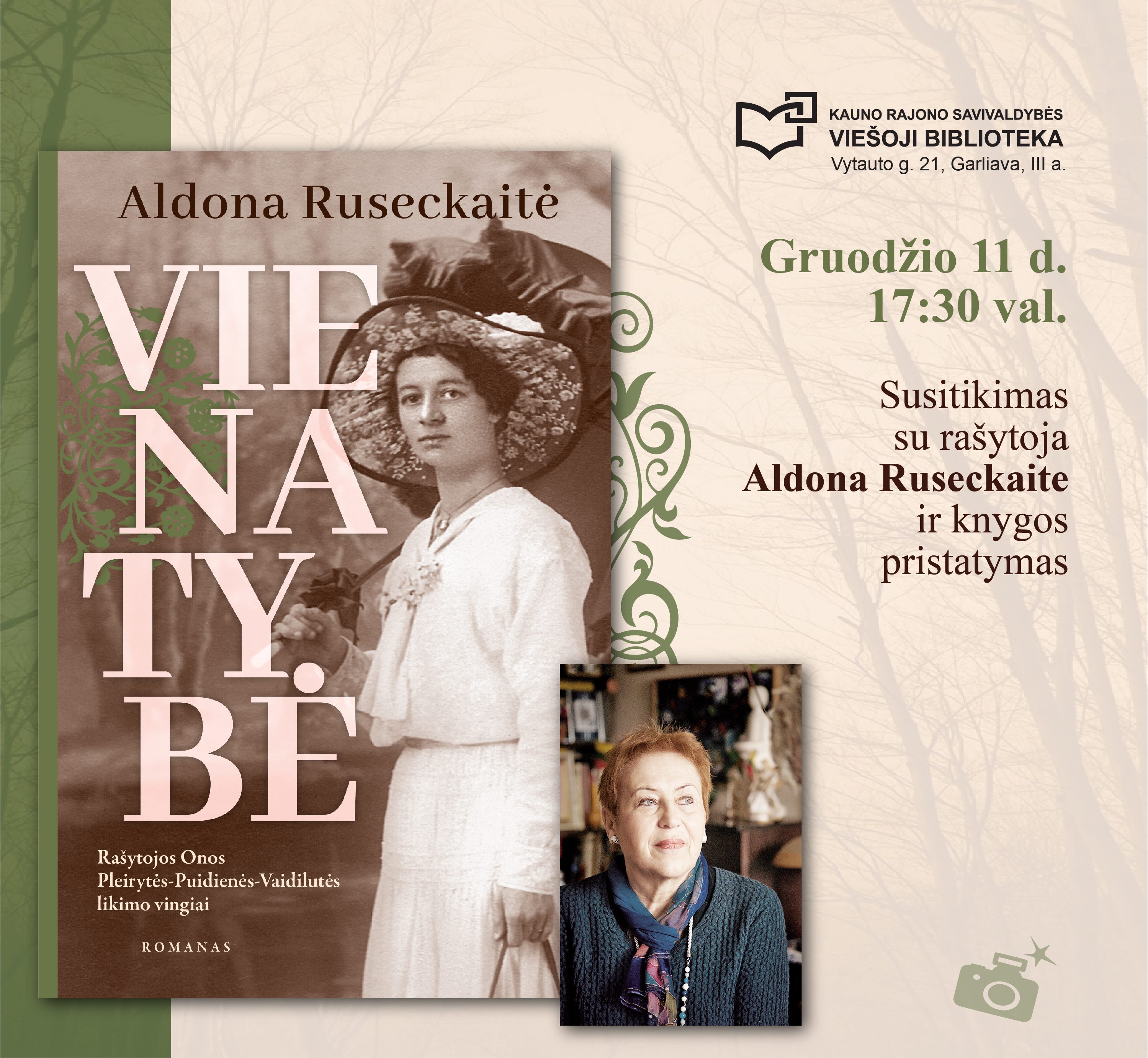 Lygiai prieš dvejus metus, 2022-ųjų gruodį, Kauno rajono savivaldybės viešojoje bibliotekoje rašytoja, poetė, muziejininkė, Trečiojo amžiaus universiteto Literatūros fakulteto dekanė, Lietuvos muziejų asociacijos garbės narė Aldona Ruseckaitė pristatė savo penktąją knygą – „EMMI: Vinco Mykolaičio-Putino gyvenimo moterys“. Ir anuomet paklausta apie ateities planus – galimą šeštąją knygą – ji paslaptingai šyptelėjo: „Gal užteks šių penkių. Kol kas.“ Bet autorė ilgai netruko ir štai jau gruodžio 11-ąją atvyksta į mūsų biblioteką pristatyti šeštosios savo knygos „Vienatybė“, kurioje pasakoja apie Onos Pleirytės-Puidienės-Vaidilutės (1882–1936) gyvenimą ir kūrybą.
