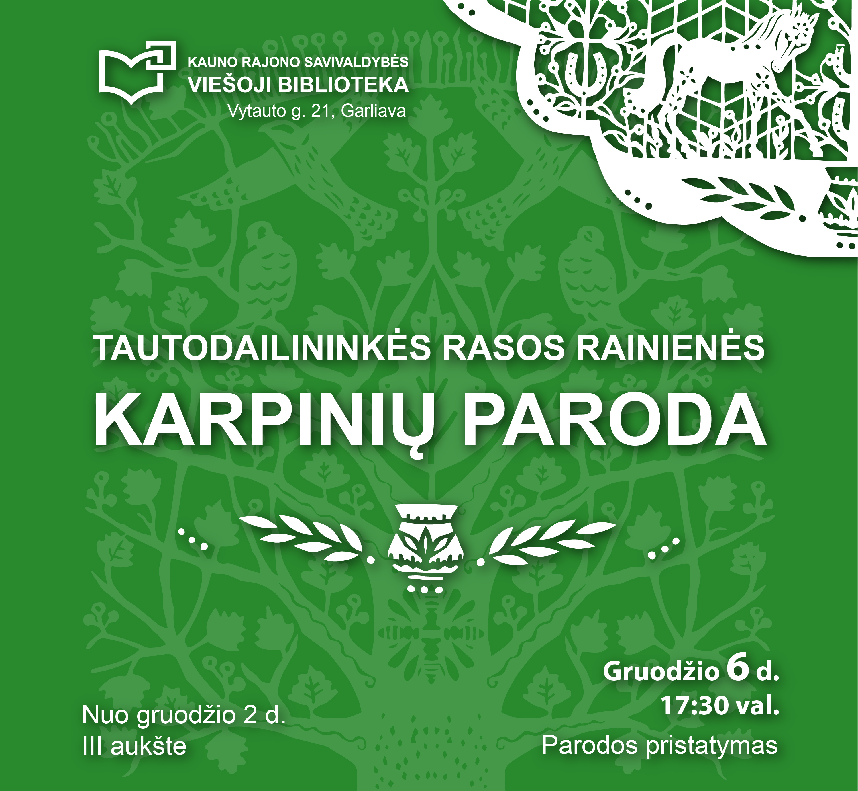 Gruodžio 6-ąją kviečiame Jus į tautodailininkės Rasos Rainienės karpinių parodos pristatymą bibliotekoje.
