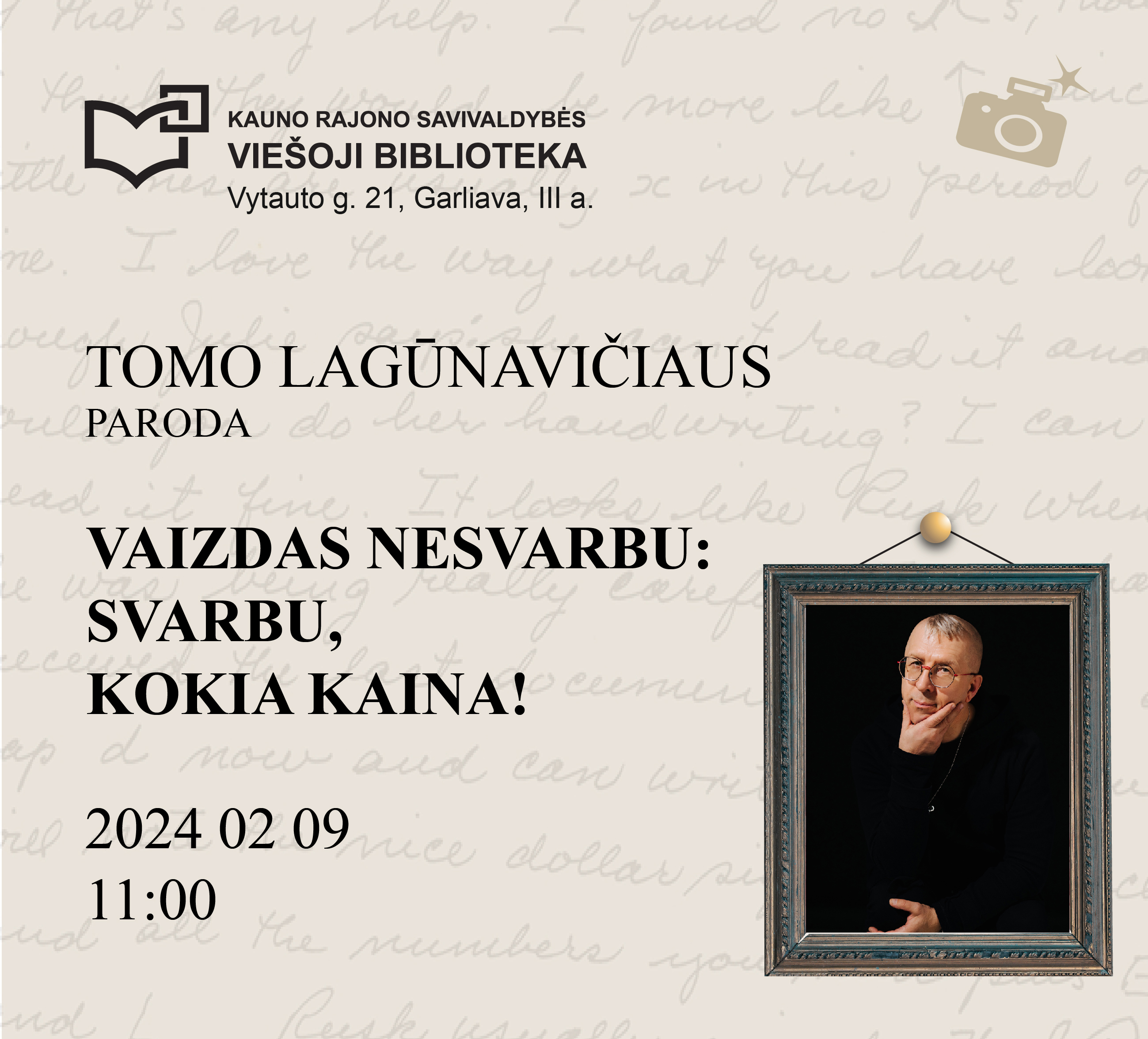 Vasario 9 d. 11.00 val. Kauno rajono savivaldybės viešojoje bibliotekoje vyks tarpdisciplininio meno atstovo Tomo Lagūnavičiaus parodos „Vaizdas nesvarbu: svarbu, kokia kaina!“ atidarymas.