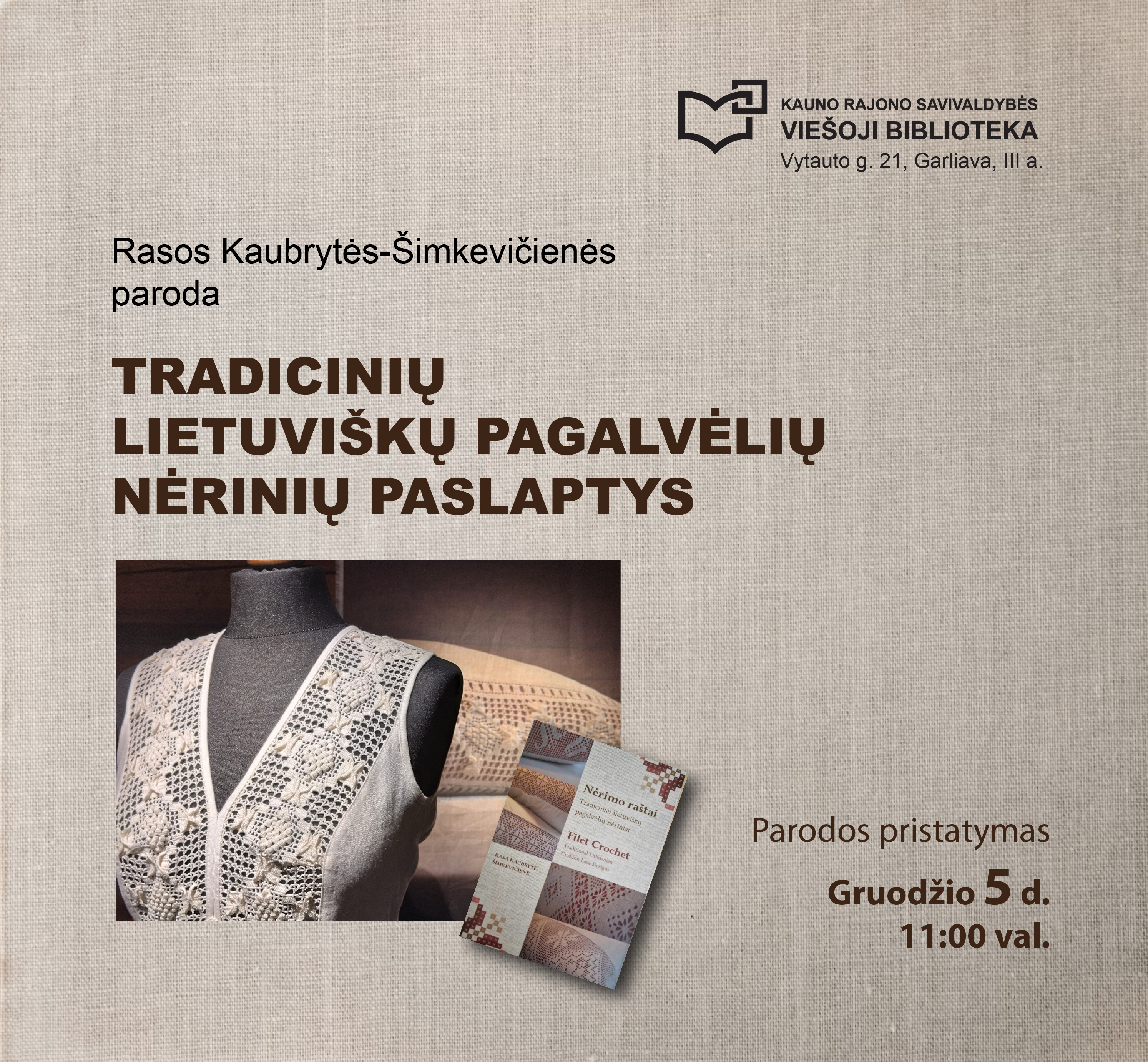 Parodos pristatymas įvyks gruodžio 5 d. 11.00 val., turėsite galimybę įsigyti R. Kaubrytės-Šimkevičienės knygą „Nėrimo raštai“, kurią autorė išleido savo lėšomis, siekdama užfiksuoti nėrimo technikas, kad jos nepražūtų užmarštyje. Visai neseniai Rasos Kaubrytės-Šimkevičienės nėrinių paroda jau buvo eksponuojama Kauno rajone: Antano ir Jono Juškų etninės kultūros muziejuje, taip pat Vilkijos bibliotekoje, o dabar atkeliavo į Garliavą – kviečiame grožėtis. Įėjimas nemokamas.