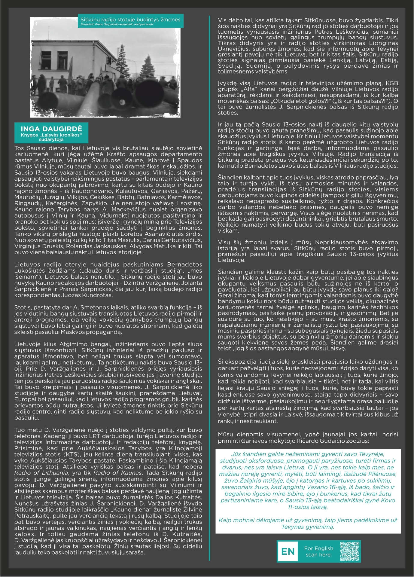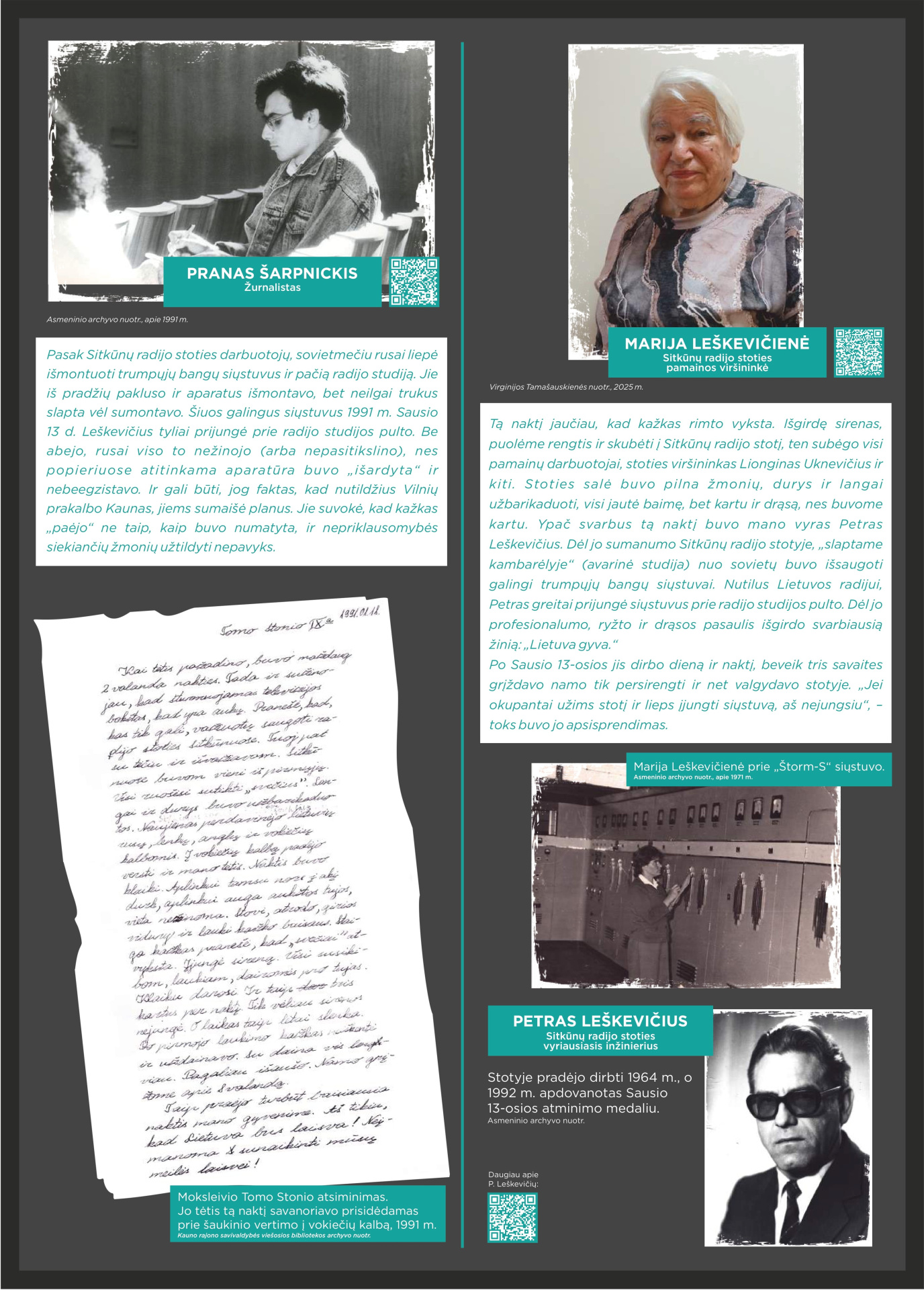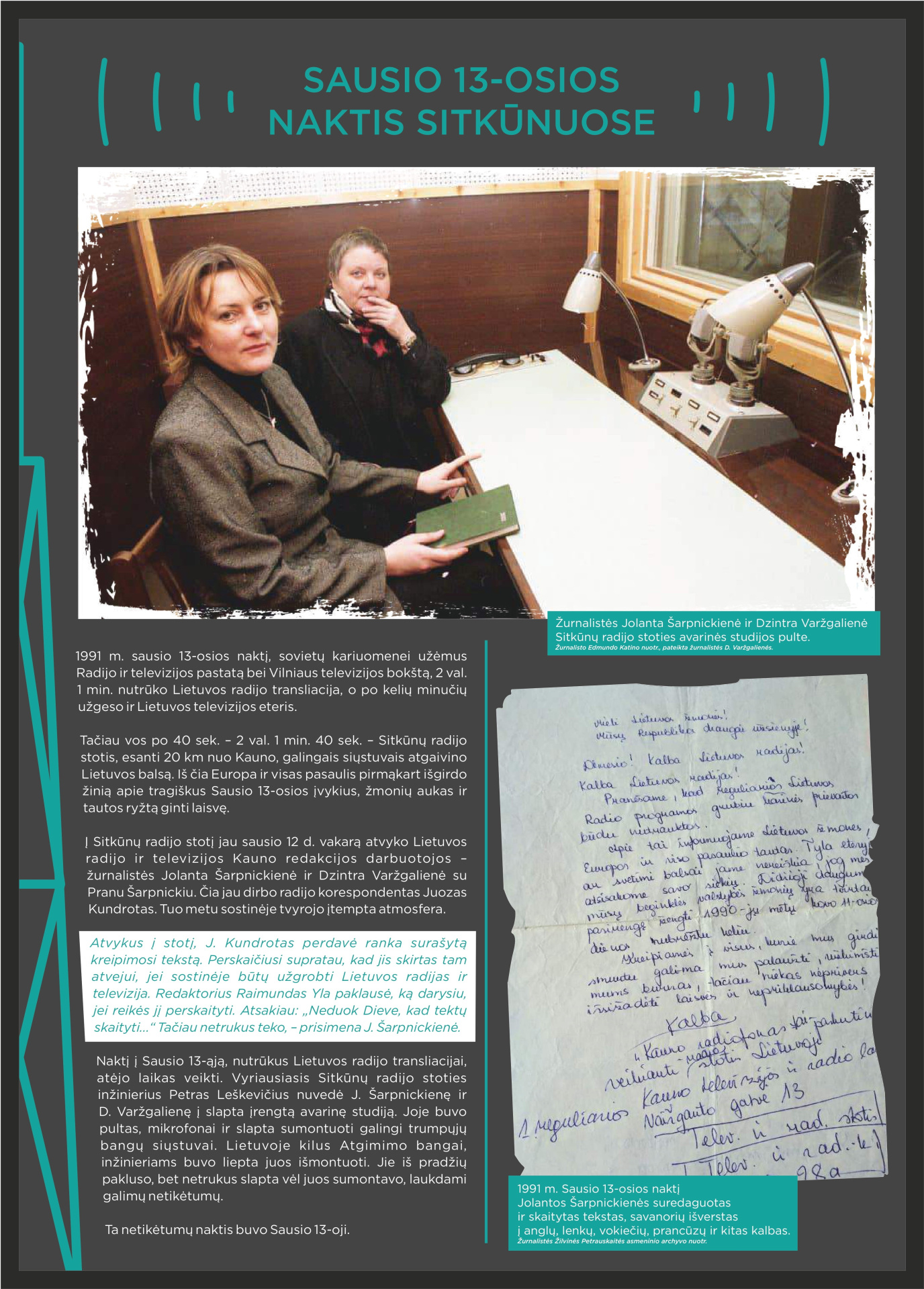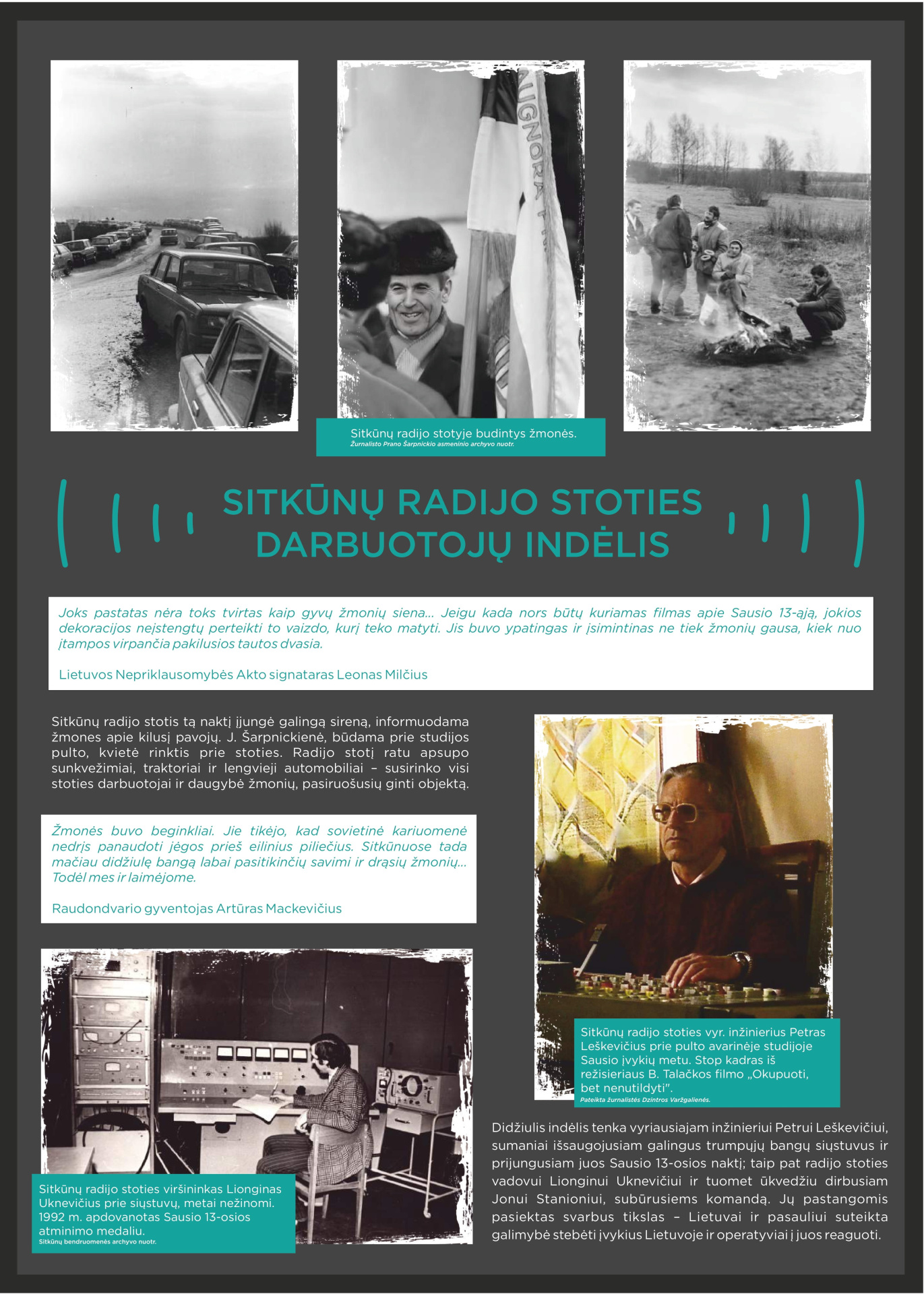 Prisimindami 1991-ųjų Sausio 13-ąją, klausomės tų, kurie tą naktį buvo Sitkūnuose. Radijo stotis čia tapo vienu iš strateginių Lietuvos laisvės taškų. Tuo metu Sitkūnuose dirbę žmonės prisimena įtampą, tylą ir ryžtą, lydimą vilties, kad Lietuva atsilaikys. Šiandien Sitkūnai tyliai liudija tą didžiulę drąsą. Šie žmonės – mūsų istorijos dalis, gyvi liudininkai, kurie savo pasakojimais perduoda laisvės vertę naujoms kartoms.