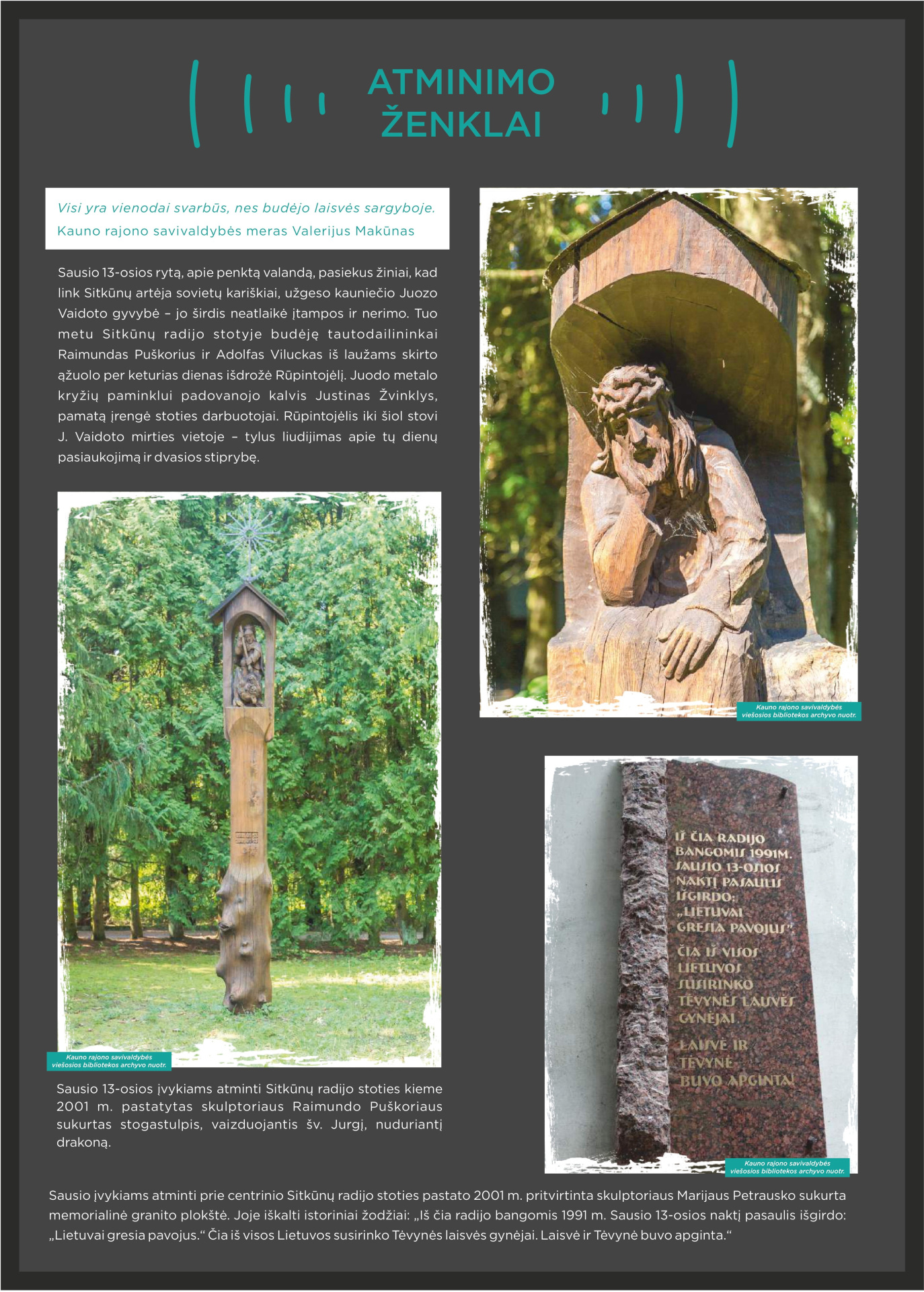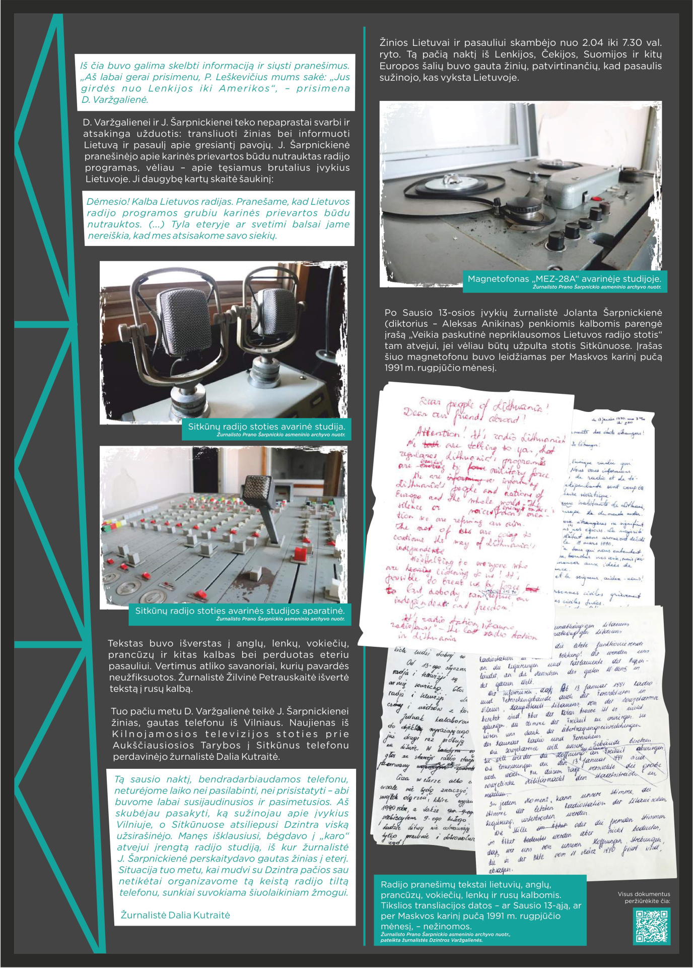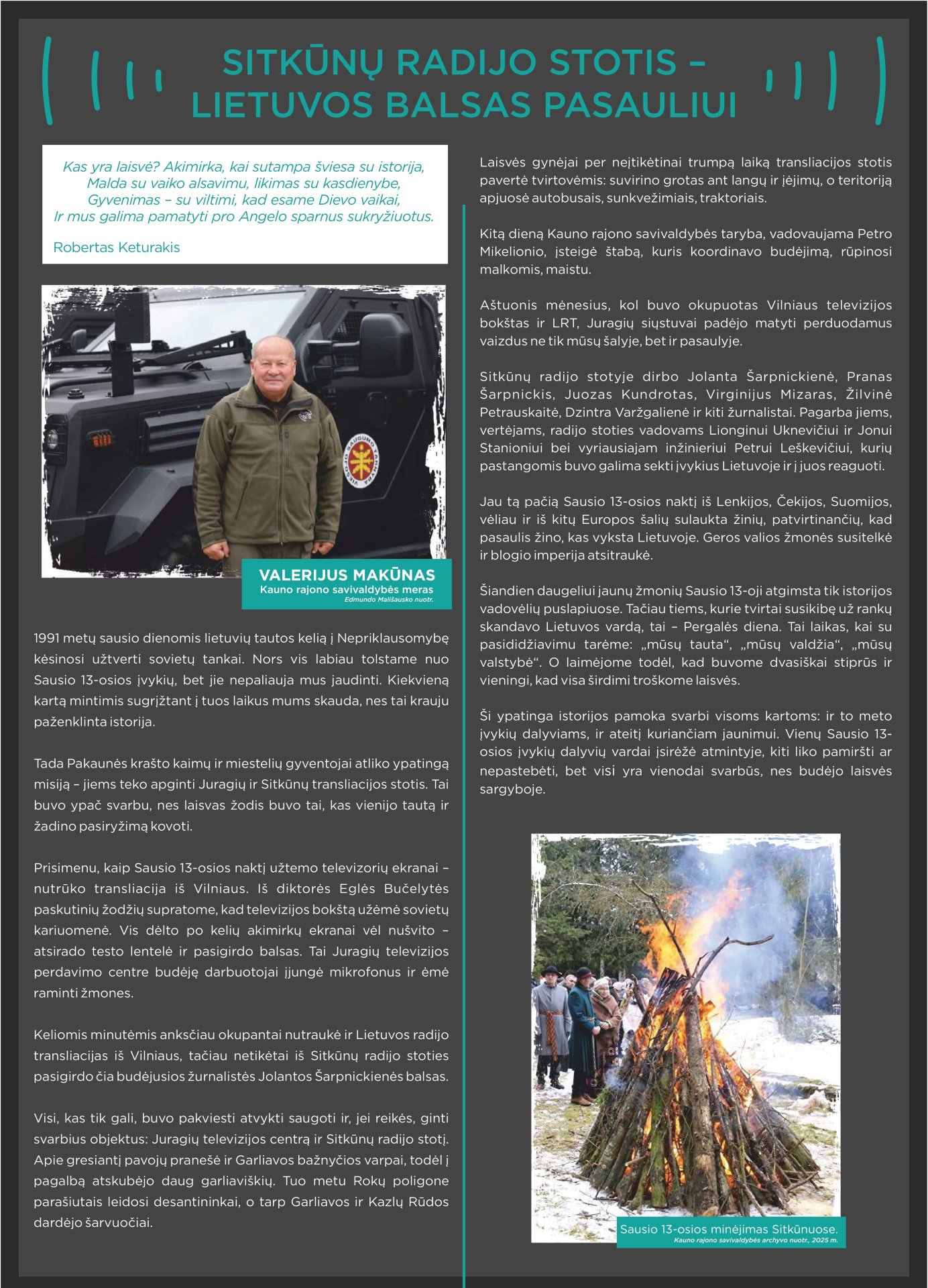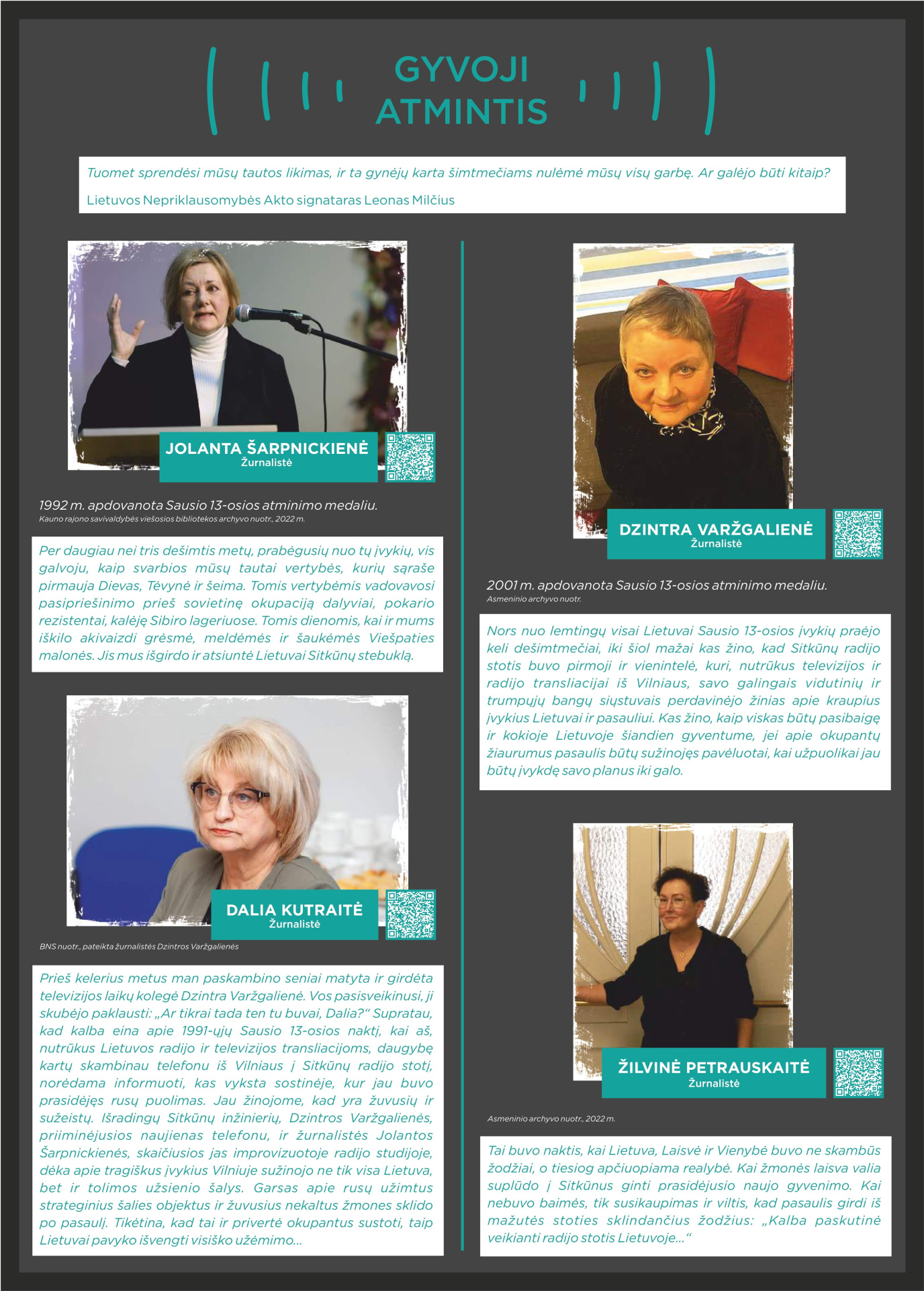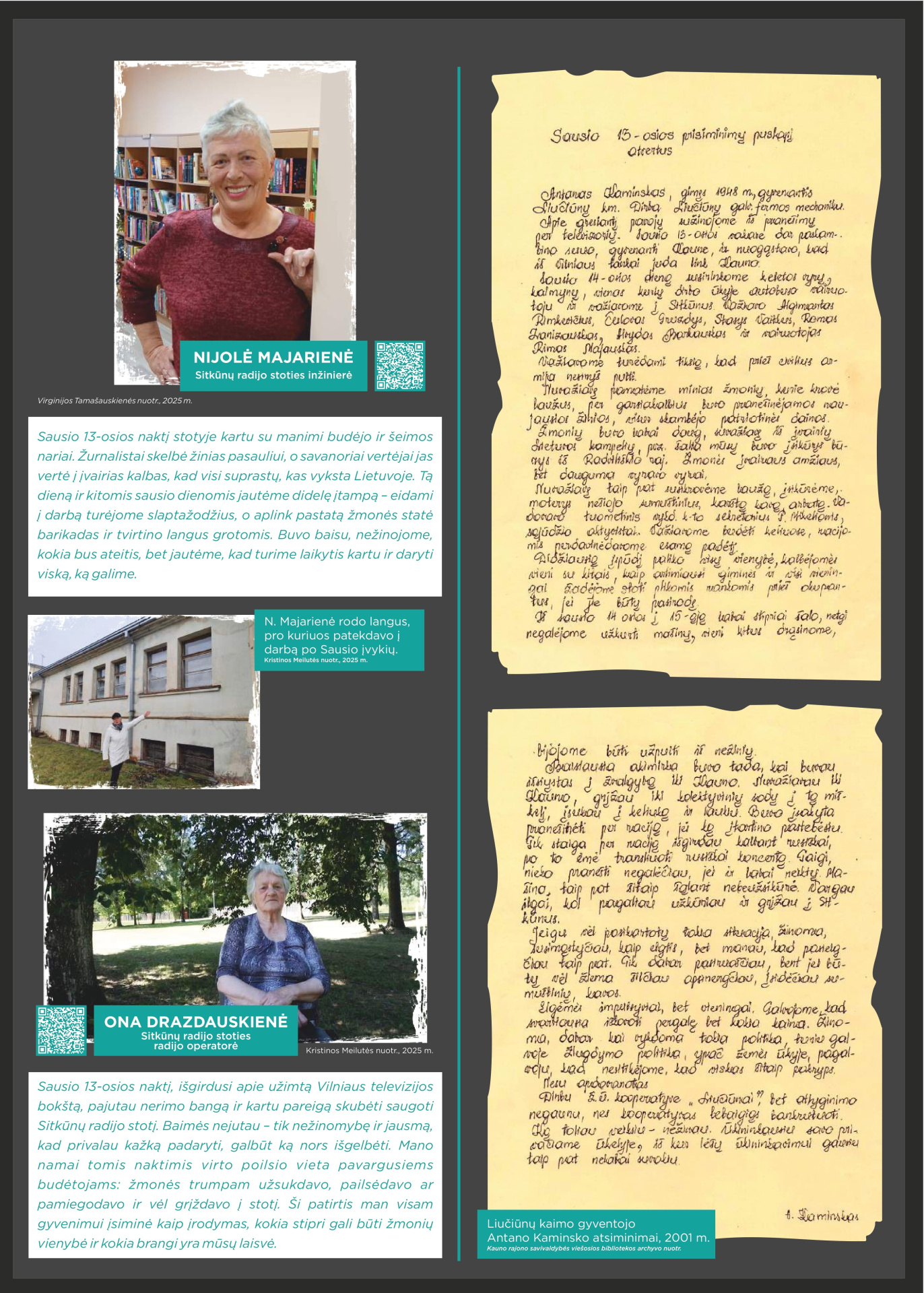 Prisimindami 1991-ųjų Sausio 13-ąją, klausomės tų, kurie tą naktį buvo Sitkūnuose. Radijo stotis čia tapo vienu iš strateginių Lietuvos laisvės taškų. Tuo metu Sitkūnuose dirbę žmonės prisimena įtampą, tylą ir ryžtą, lydimą vilties, kad Lietuva atsilaikys. Šiandien Sitkūnai tyliai liudija tą didžiulę drąsą. Šie žmonės – mūsų istorijos dalis, gyvi liudininkai, kurie savo pasakojimais perduoda laisvės vertę naujoms kartoms.