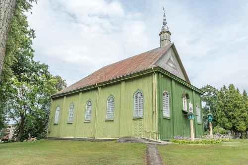 1853 m. bažnyčia jau buvo pastatyta, bet neįrengta. Stogas dengtas čerpėmis. Pastatas medinis, pailgo plano, su dvišlaičiu stogu, be bokštų. Yra tik mažas bokštelis priekyje ant kraigo. Virš didžiųjų durų iš lauko pusės didžiulis krucifiksas. Priekiniai ir šoniniai langai dideli, su pusiau apskritomis arkomis