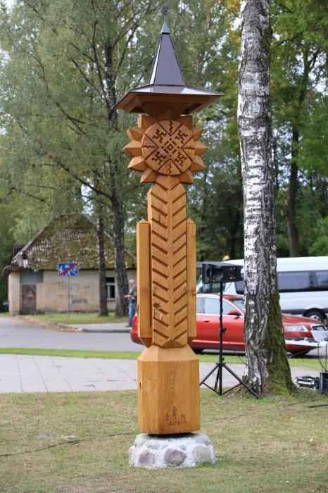Medinė skulptūra dengta skardiniu stogeliu ir papuošta etnokultūriniais simboliais. Pasak autoriaus A. Sakalausko, „be simbolių, kurie puošia stogastulpį, nebūtų tokios Lietuvos, kurią turime šiandien.“ Menininkas pasakojo, kokie elementai žymi skulptūrą. Iš priekinės jos pusės matomas Išminčius, rankose laikantis Aušrinę, o ji simbolizuoja šviesos pergalę prieš tamsą. A. Sakalauskas pabrėžė, kad tokį simbolį galima prilyginti įvykiui, kai prieš 100 metų Lietuva atkūrė nepriklausomybę. Prie išminčiaus kojų stūkso Gedimino stulpai, o virš jo galvos išdrožta saulė reiškia šviesą, sklindančią per visą pasaulį. Kitoje stogastulpio pusėje galima pamatyti išdrožtą gyvybės medį.