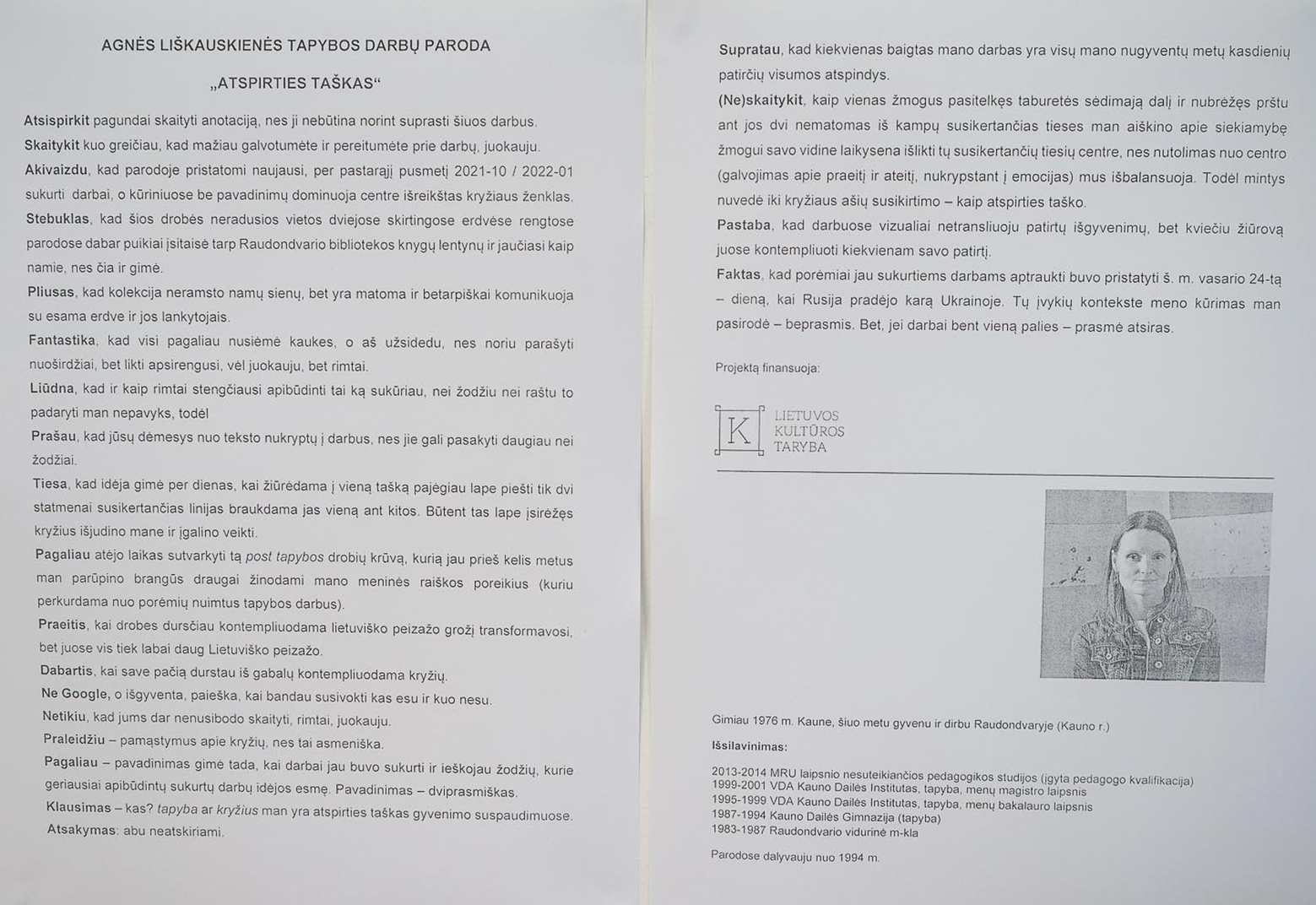 „Atspirties taškas“ tampa reikalingas, kai prislegia gyvenimo realybė ir tarsi sustingsti, kai negali pajudėti – veikti, išsivaduoti iš įkyrių minčių. Patirtų išgyvenimų svoris užgula mūsų pečius ir kartais mes nebepajėgiame jų pakelti. Buvo dienų, kai galėjau lape piešti tik dvi statmenai susikertančias linijas, braukdama jas be atvangos... Būtent tas lape įsirėžęs kryžius išjudino mane ir dabar gydo.