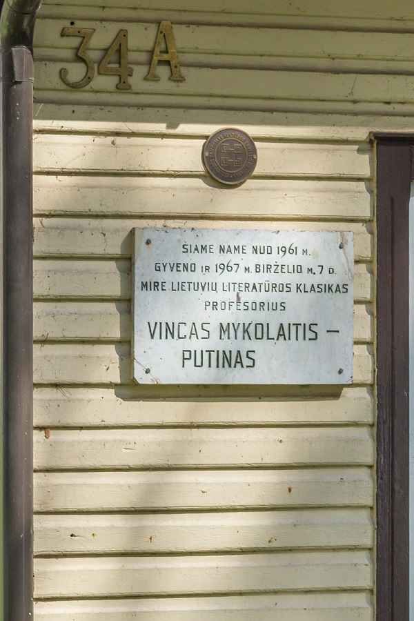 „Šiame name nuo 1961 m. gyveno ir 1967 m. birželio mėn. 7 d. mirė lietuvių literatūros klasikas, profesorius Vincas Mykolaitis-Putinas“.