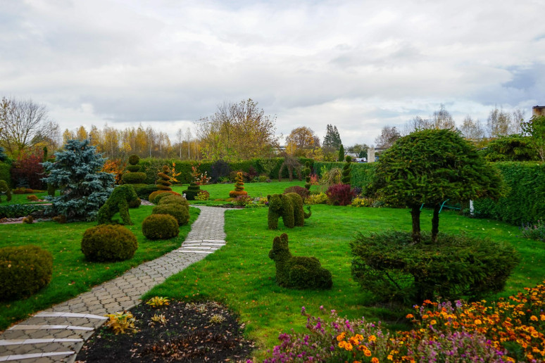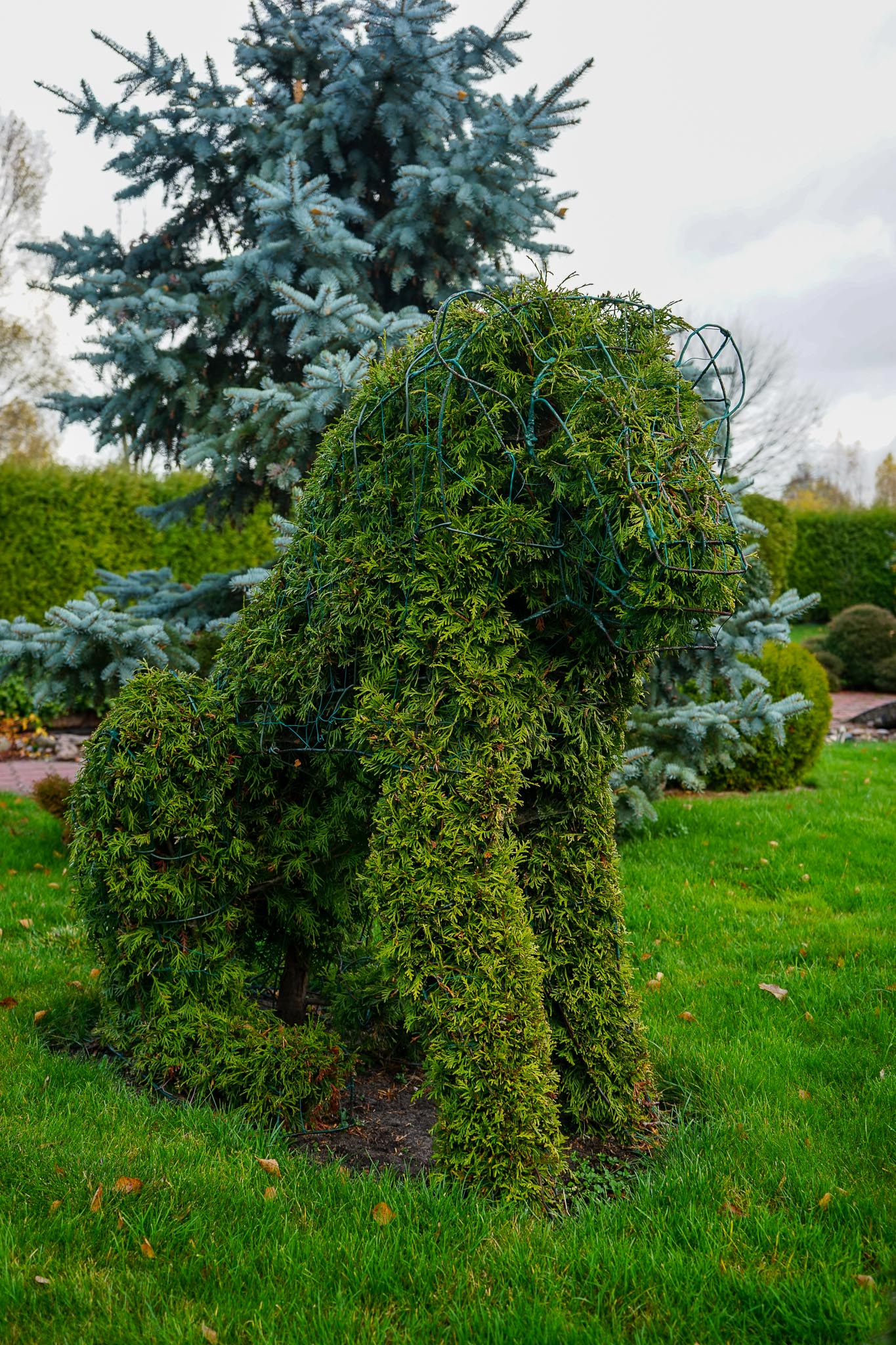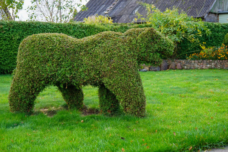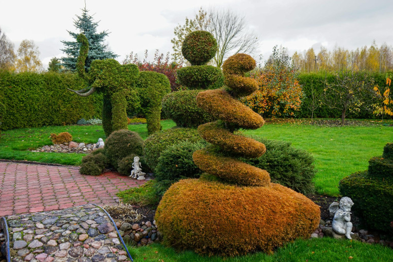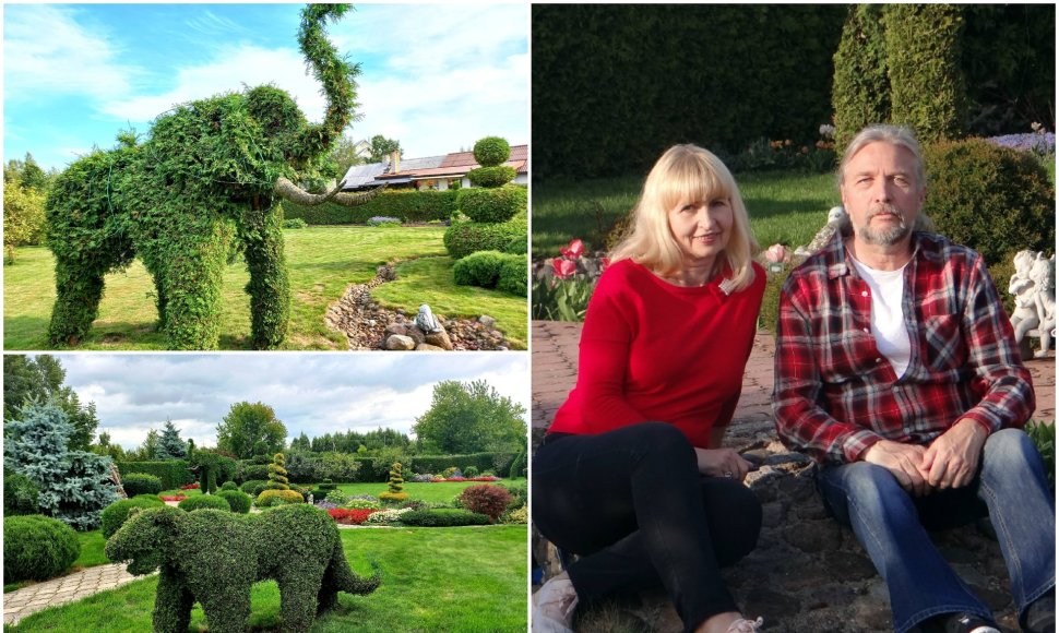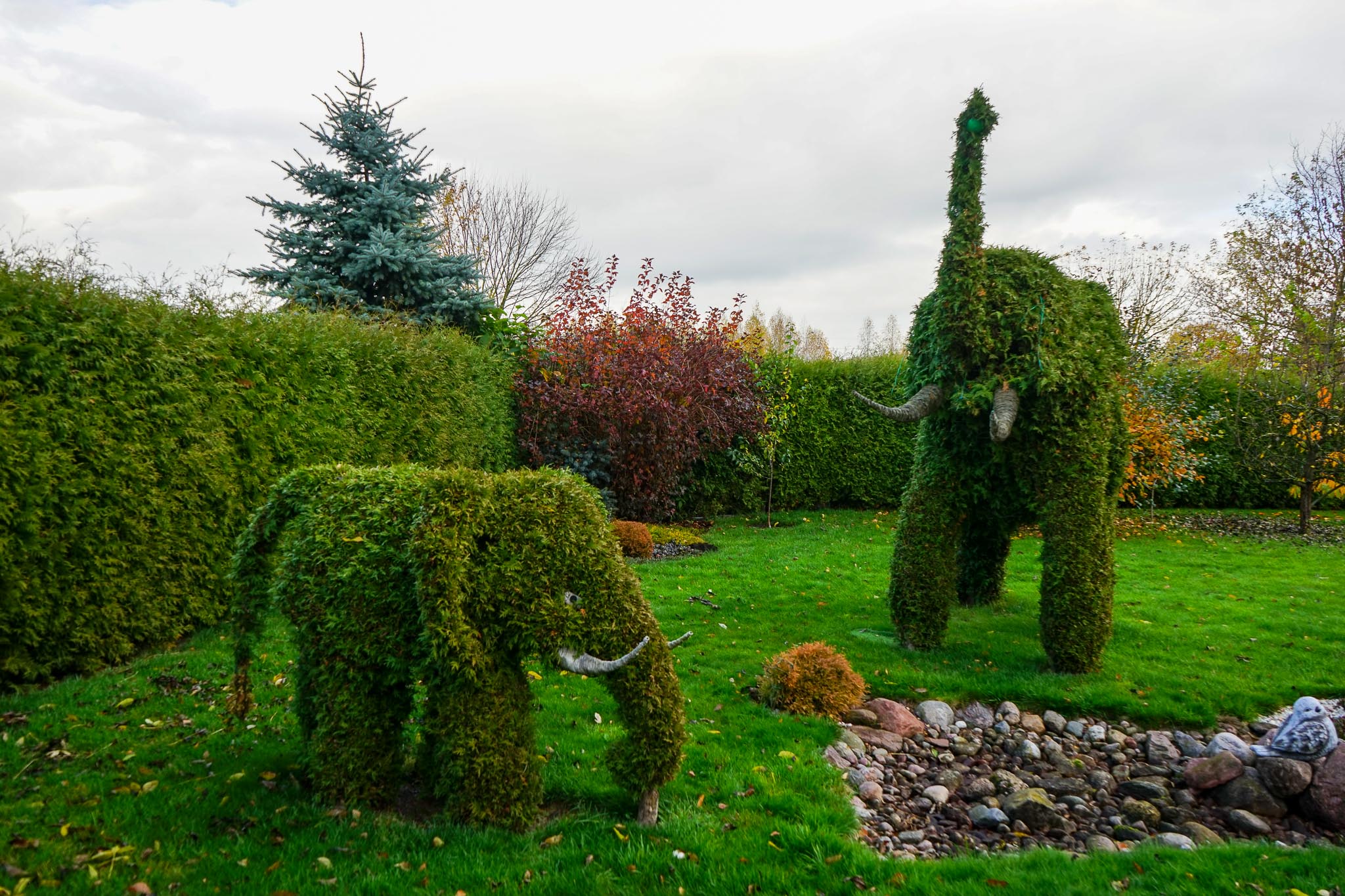 Topiarai gali būti ir geometrinės figūros, ir gyvūnų, žmonių siluetai. Pas mus yra šiek tiek geometrinių figūrų, bet daugiausia – gyvūnų. Kieme turime du dramblius – mamą ir vaiką, du tigrus, žirafą, liūtą, raganosį, elniuką, kurį dabar visi kiškiu vadina...