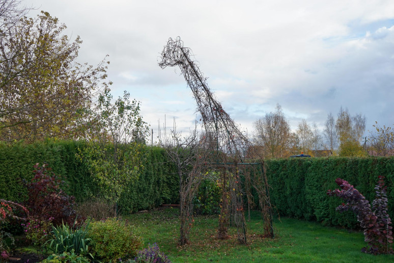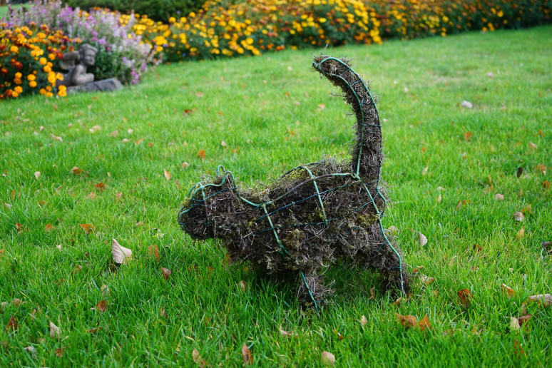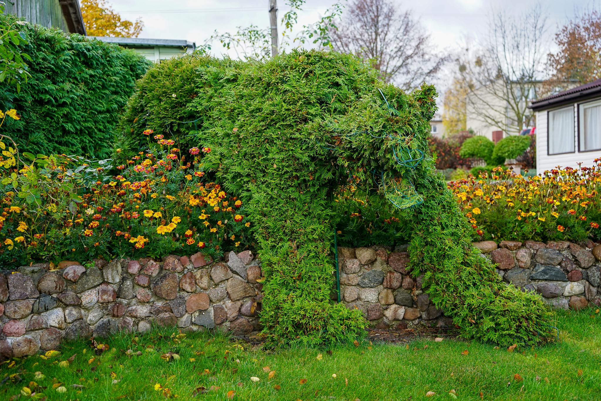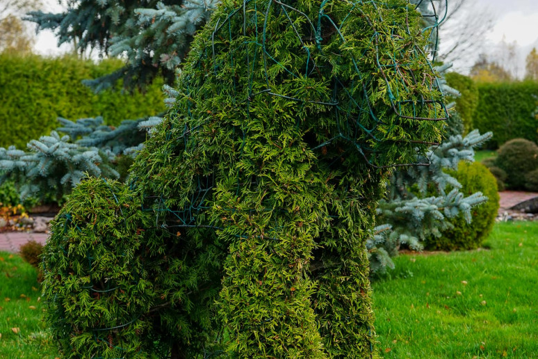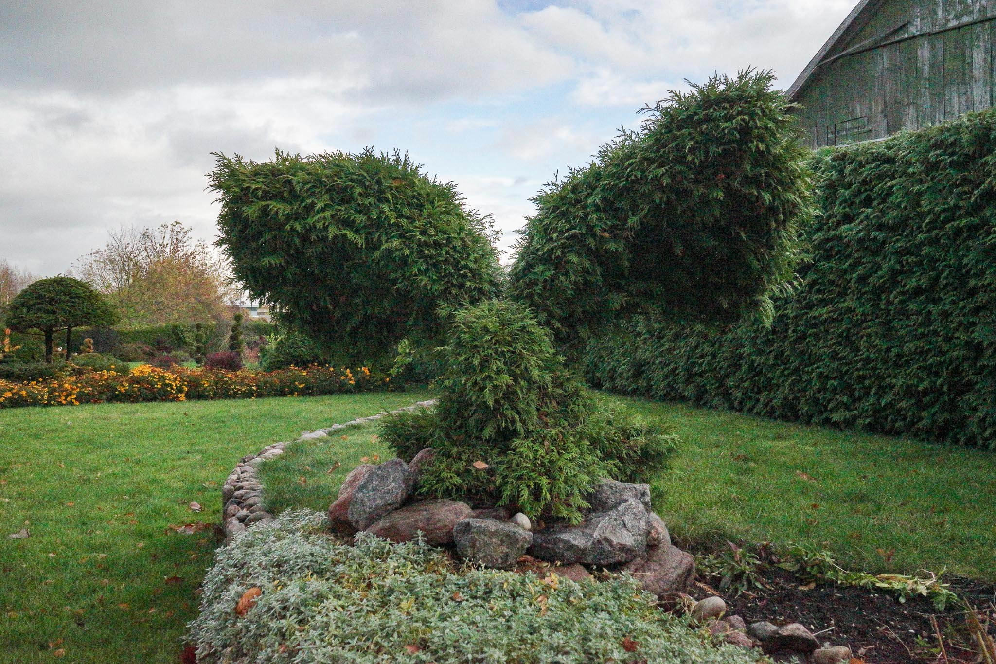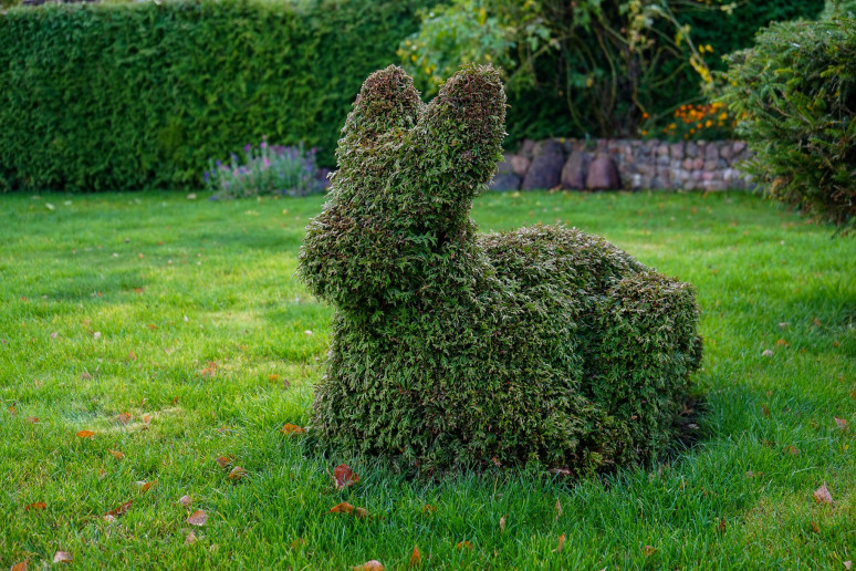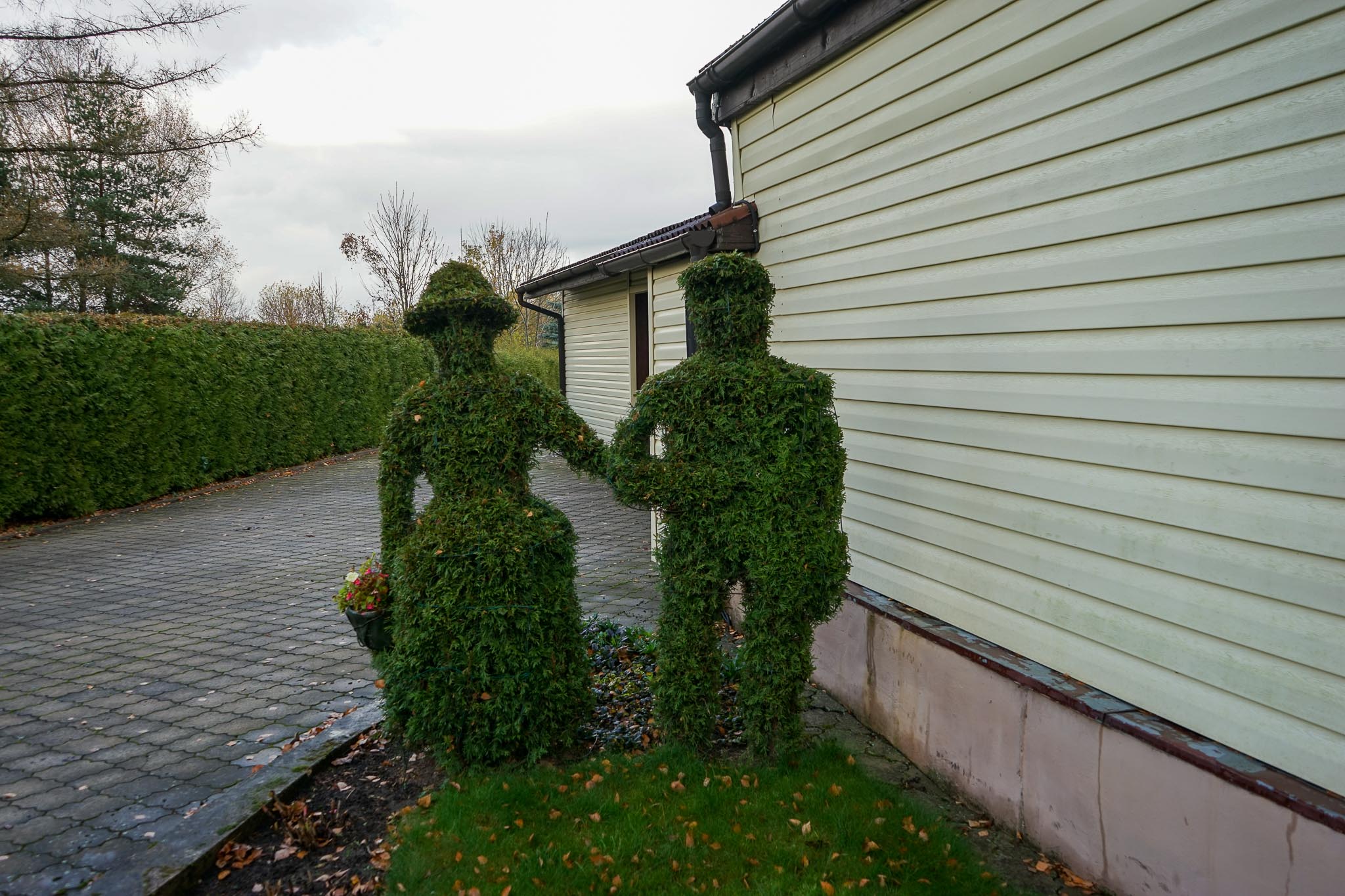 Topiarai gali būti ir geometrinės figūros, ir gyvūnų, žmonių siluetai. Pas mus yra šiek tiek geometrinių figūrų, bet daugiausia – gyvūnų. Kieme turime du dramblius – mamą ir vaiką, du tigrus, žirafą, liūtą, raganosį, elniuką, kurį dabar visi kiškiu vadina...