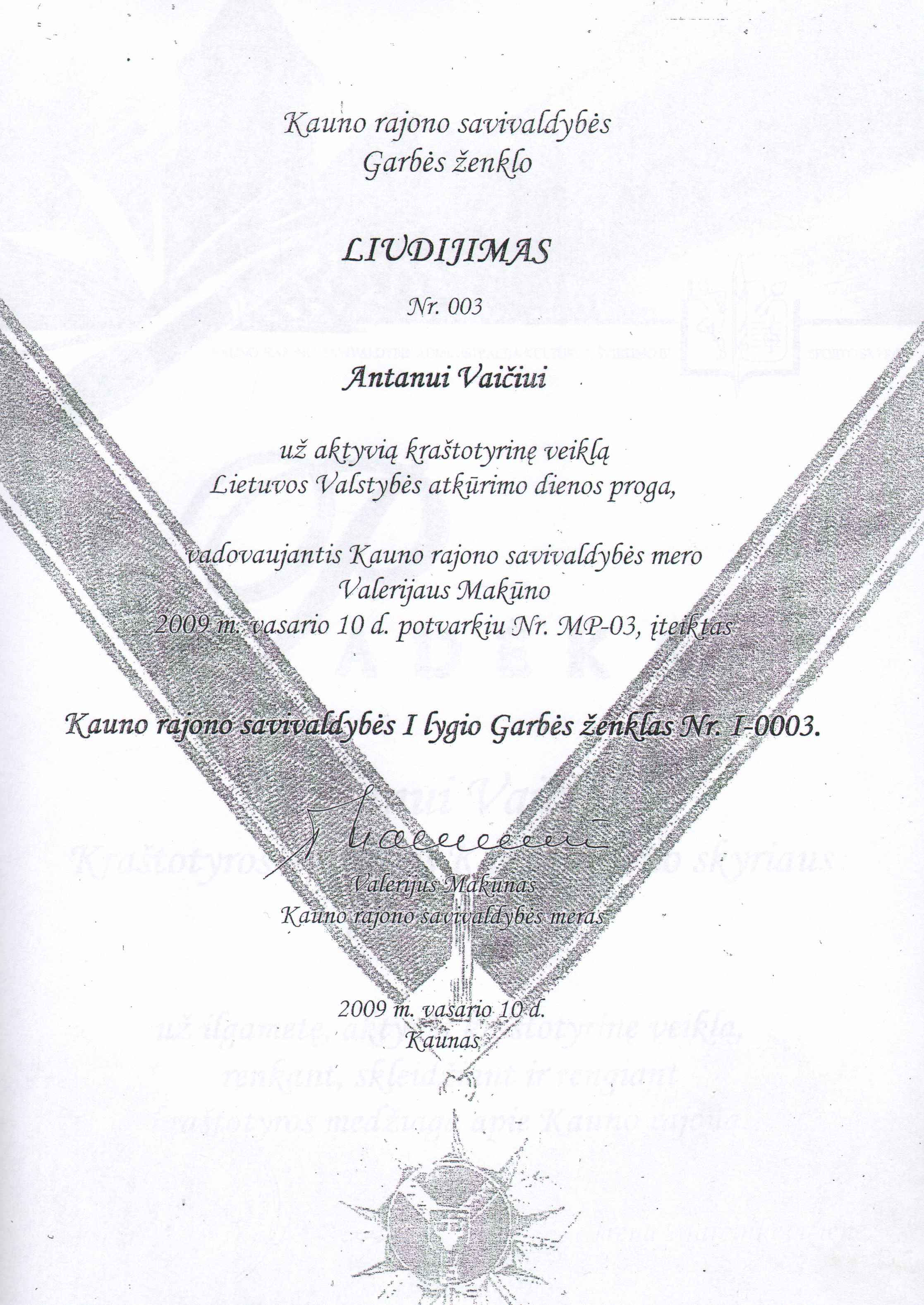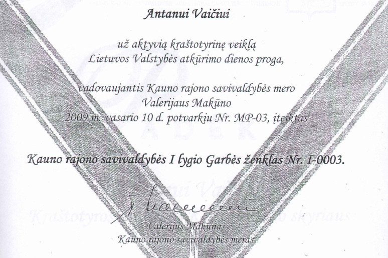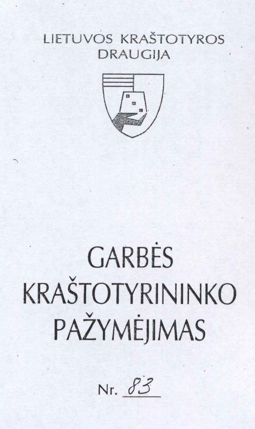 2009 m. vasario l d. už aktyvią kraštotyrinę veiklą Lietuvos valstybės atkūrimo dienos apdovanotas Kauno rajono savivaldybės I lygio Garbės ženklu Nr. 1-003.