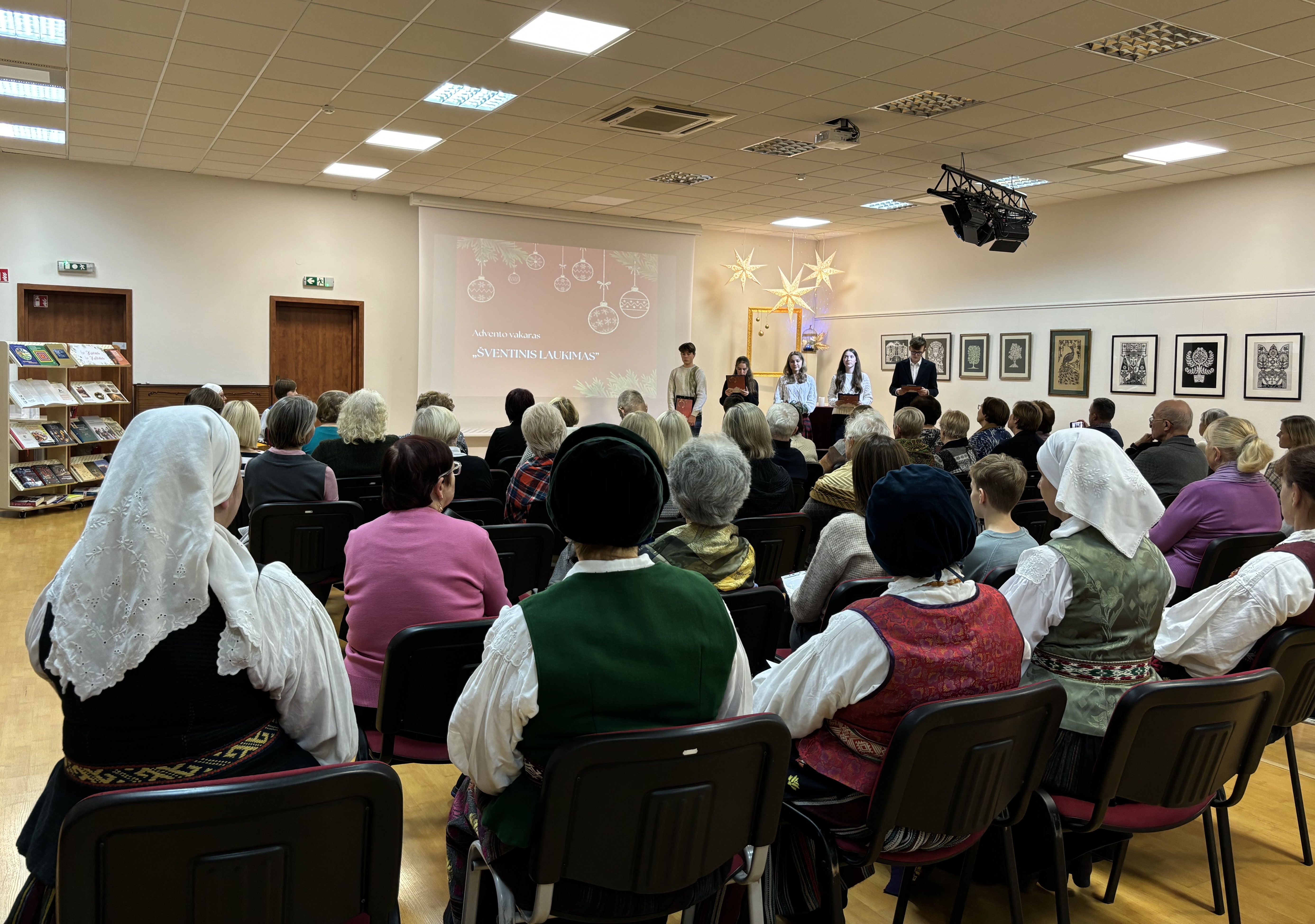 Ar žinote, kad kasmet advento laikotarpis prasideda vis kitą dieną? Ir net jo trukmė nevienoda. Taip yra todėl, kad advento pradžia – sekmadienis, kai lieka keturios savaitės iki Kūčių. Adventas simbolizuoja laukimą ir naujų liturginių metų pradžią. Šiemet advento laikotarpis prasidėjo gruodžio 1-ąją ir netrukus bibliotekoje paminėjome advento vakarą „Švenčių laukimas“. Viena renginio dalis – tautodailininkės Rasos Rainienės karpinių parodos pristatymas. Kita dalis – Skriaudžių ansamblio „Kanklės“ programa. Nors adventas – ramybės ir susikaupimo laikotarpis, vis dėlto senosiose lietuvių tradicijose nuo jo neatsiejami ir įvairūs šokiai bei žaidimai. Adventiniai lietuvių liaudies šokiai bibliotekoje įtraukė visus – nuo moksleivių iki senjorų.
