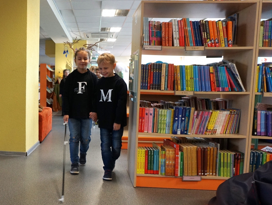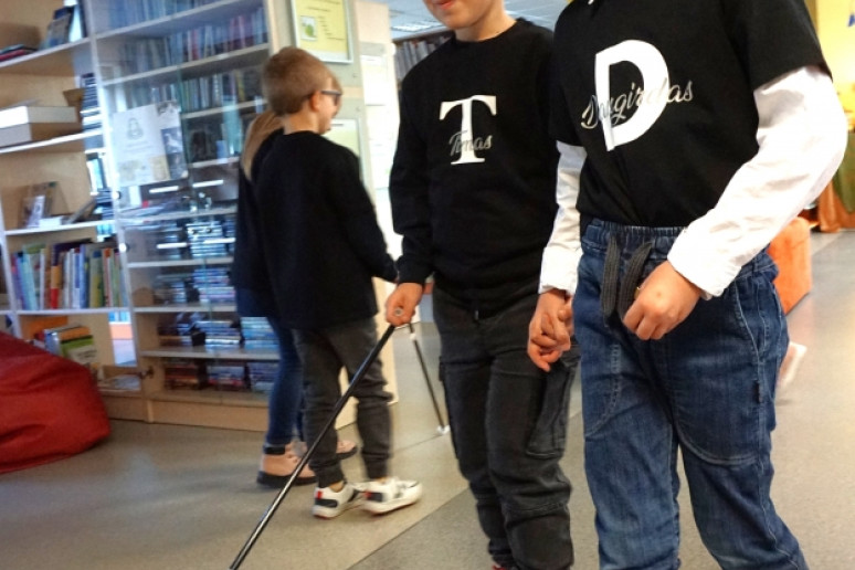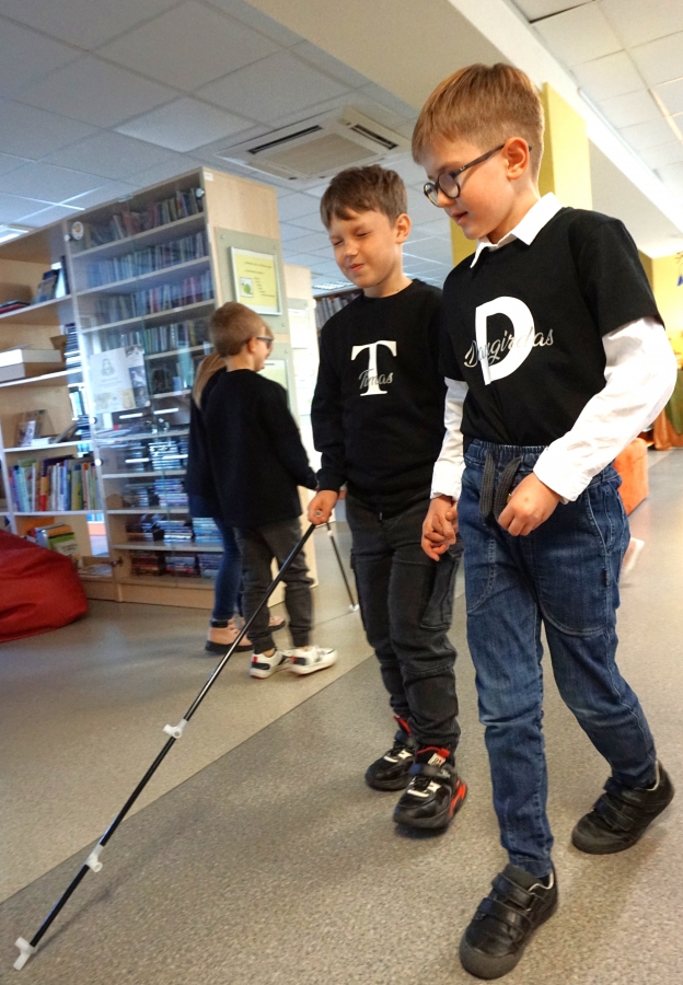Vaikai pažiūrėjo informatyvų trumpametražį filmą apie tai, kaip naudojama baltoji lazdelė, su kokiomis problemomis susiduria neregiai ir silpnaregiai, integruodamiesi į reginčiųjų pasaulį. Kaip žinome, žmogus geriausiai įsisąmonina informaciją ne teoriniu keliu, o praktiniu, todėl moksleiviams pasiūlėme patiems pasigaminti lazdeles, panašias į neregių, tuomet pasiskirsčius poromis (neregys ir vedlys) pasivaikščioti bibliotekoje. Taip pat pristatėme vaikams dvi bibliotekoje esančias knygas, tinkamas skaityti tiek regintiesiems, tiek ir neregiams. Norėtumėte pavartyti? Laukiame Jūsų bibliotekoje!