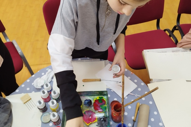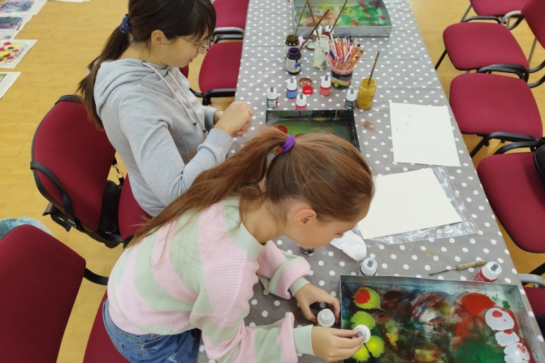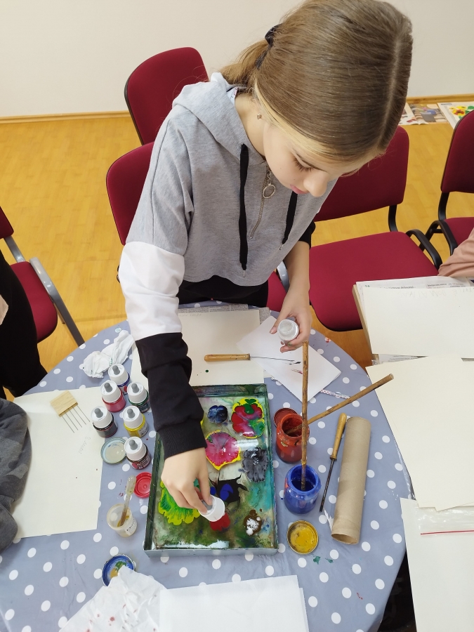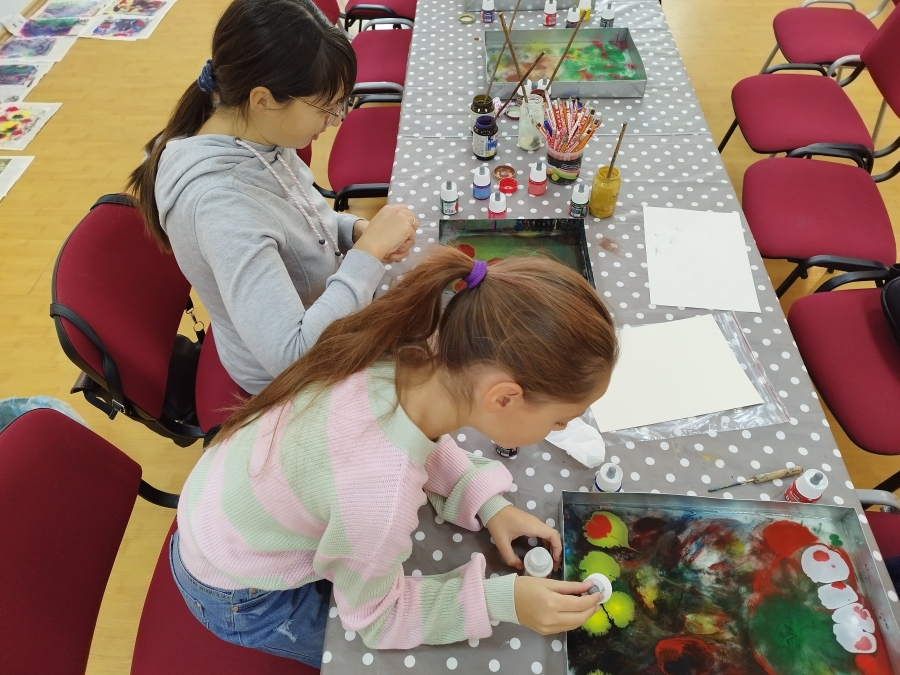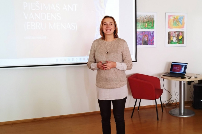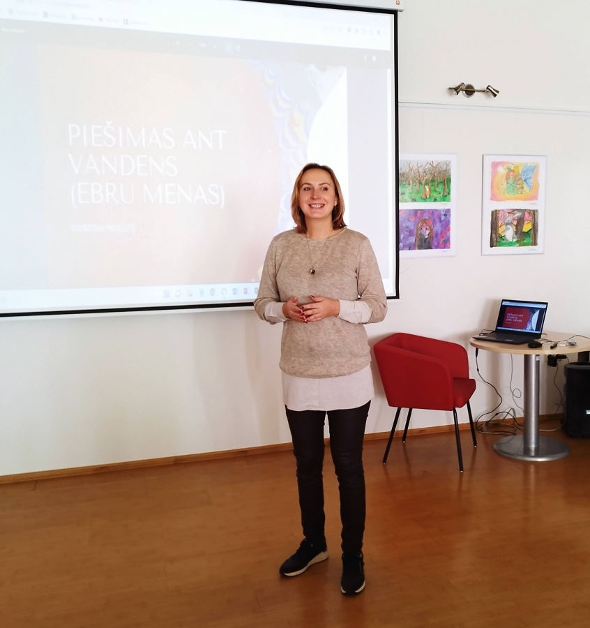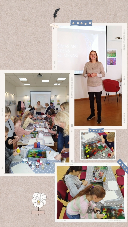 Bibliotekos lankytojai išbandė tūkstančius metų gyvuojančią techniką – tapybą ant vandens. Jie eksperimentavo taškydami teptukais, piešė pagaliukais ir specialiais įrankiais, piešinius nuo vandens perkėlė ant popieriaus. Ornamentuose derino skirtingas ir kontrastingas spalvas.