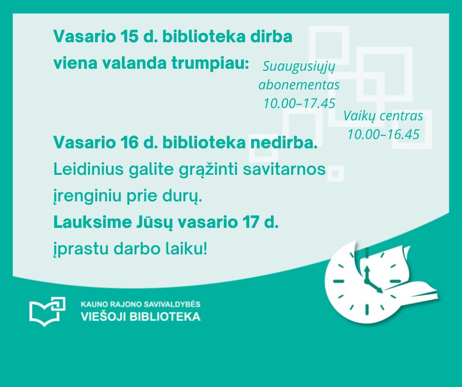 Vasario 15 d. biblioteka dirba viena valanda trumpiau: