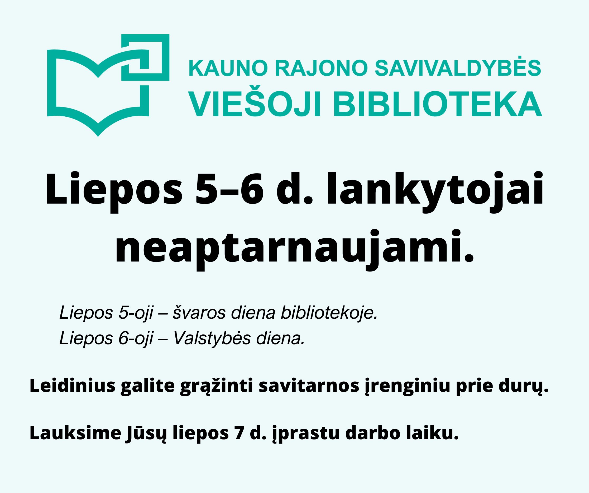 Šios savaitės trečiadienį ir ketvirtadienį, liepos 5–6 d., bibliotekoje lankytojai neaptarnaujami.