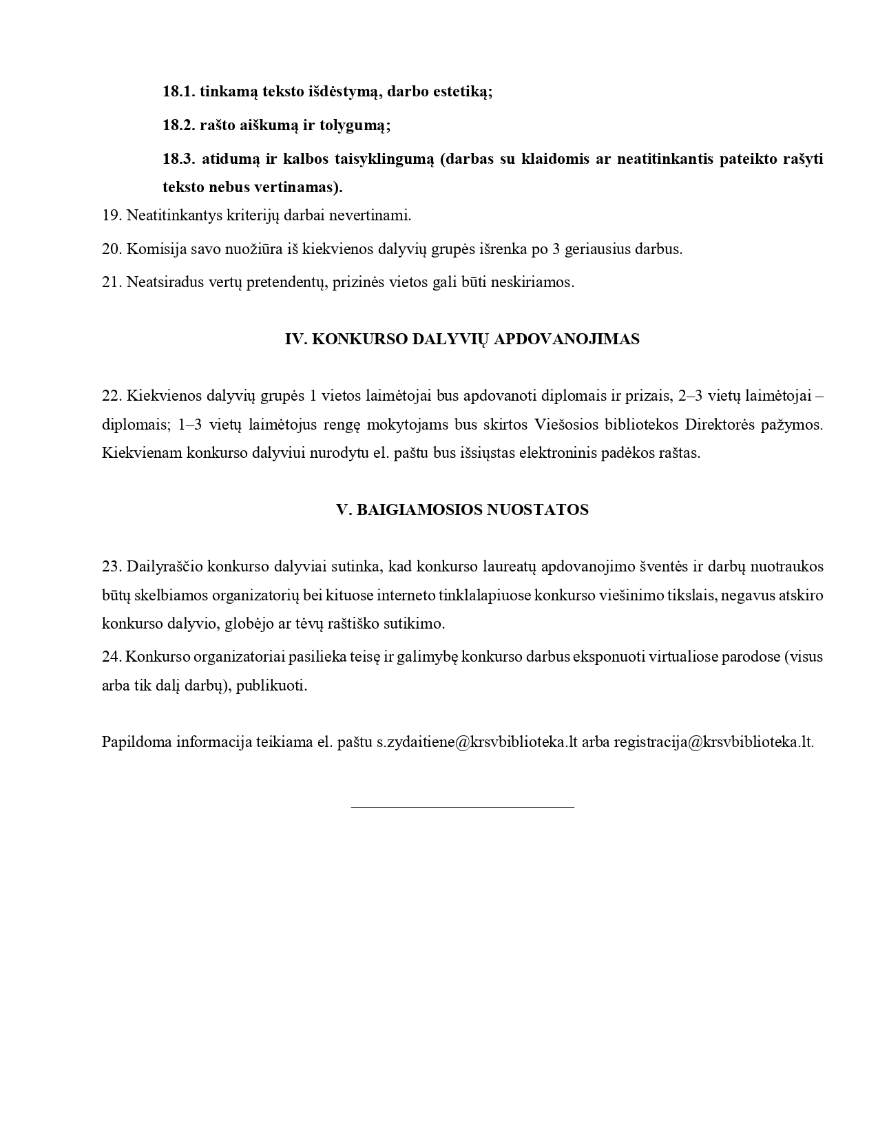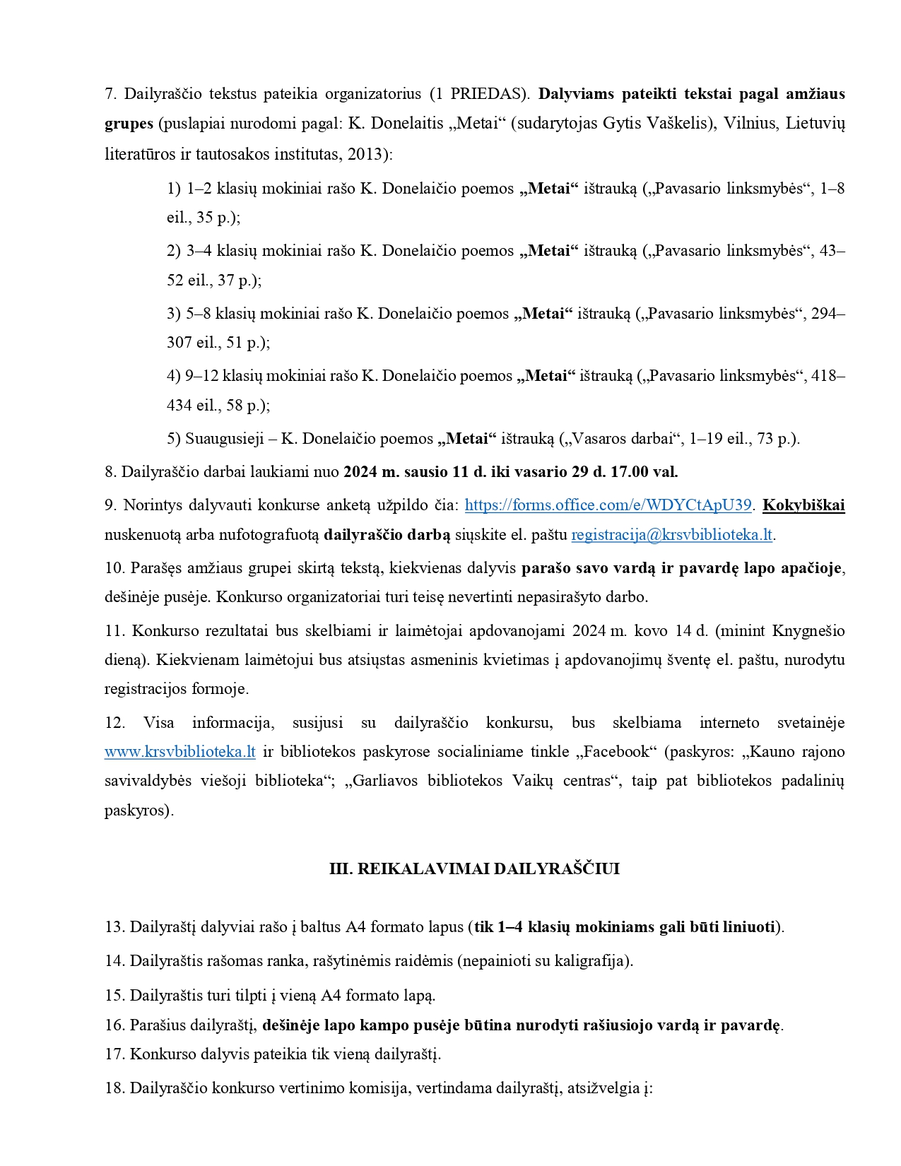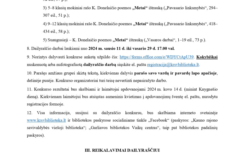Prisimename, kaip entuziastingai ir gausiai dalyvavote ankstesniuose bibliotekos organizuotuose dailyraščio konkursuose. Šie prisiminimai šildo širdis ir įkvepia viltį, jog šiemet bus dar geriau ir dar daugiau darb7. O mums, darbuotojams, – dar daugiau galvos skausmo ir dvejonių, kaip išrinkti tuos pačius geriausius. Bet nesiskundžiame, priešingai: su džiaugsmu skelbiame konkurso pradžią ir nekantriai laukiame Jūsų dailyraščio darbų iki vasario 29 d. 17.00 val.