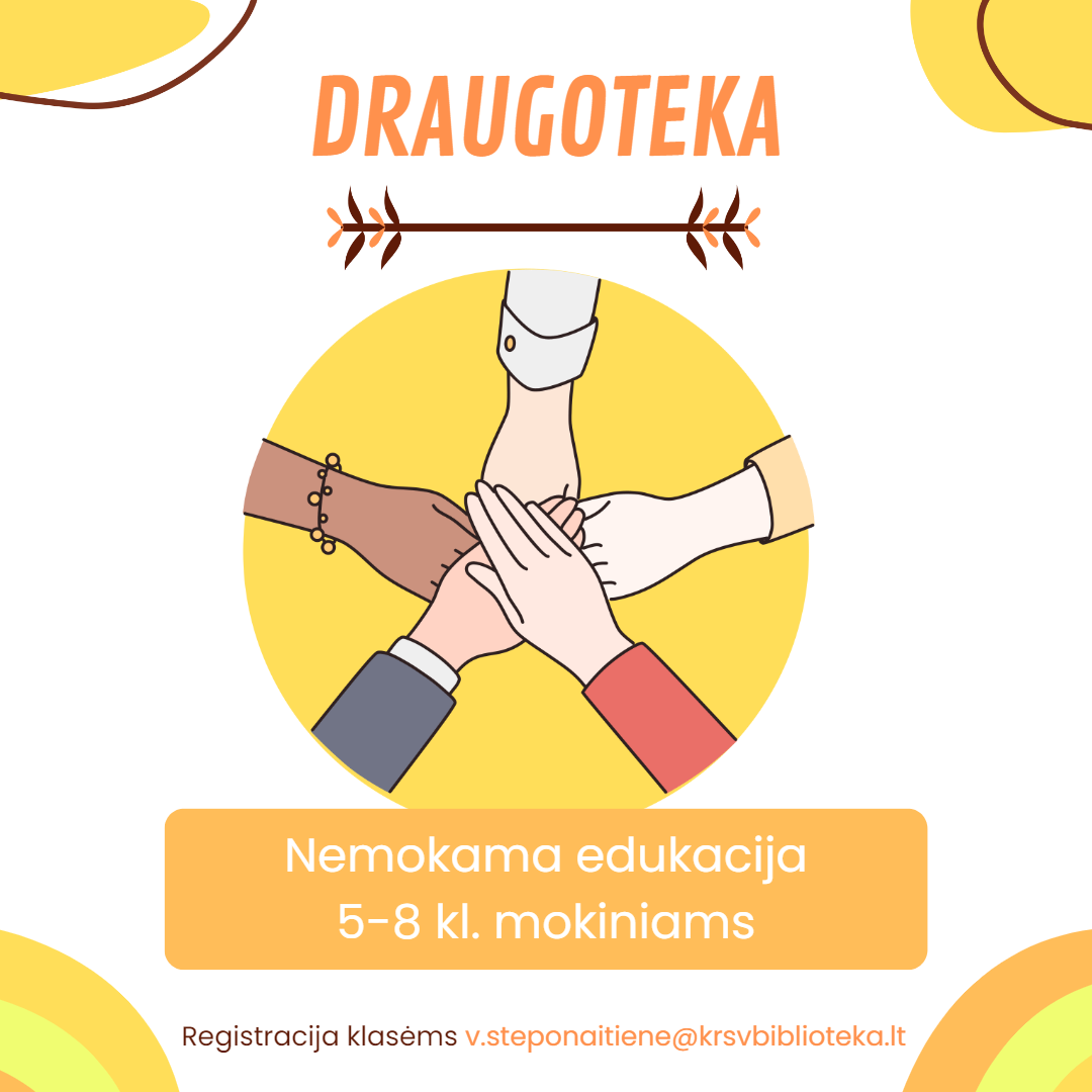 Išmaniųjų technologijų amžiuje vaikus ir jaunimą darosi vis sunkiau sudominti knygų skaitymu. Projekto „Inovatyvūs Lietuvos bibliotekų skaitymo skatinimo sprendimai vaikų ir jaunimo socialinių santykių kūrimui su aplinka“ iniciatoriai nusprendė skatinti vaikus ir jaunimą skaityti patrauklia forma – virtualiu žaidimu „Draugoteka“. Mokiniai žaisdami ir virtualiai klajodami bibliotekos erdvėse sutiks penkis nepažįstamus paauglius. Žaidimo tikslas – su jais susidraugauti ir surinkti kuo daugiau tikrą draugystę žyminčių širdelių. Nepažįstamieji, tapę žaidėjo draugais, papasakos savo istorijas, kaip jie sprendė sunkius gyvenimo klausimus ir kaip knygos padėjo suprasti svarbius dalykus. Vienos edukacijos metu mokiniai susipažins su vienu iš penkių (Saulė, Klaudija, Elijas, Jonas ir Luna) virtualaus žaidimo „Draugoteka“ herojų ir jų gyvenimo istorija. Atlikdami kūrybines užduotis edukacijų dalyviai turės iš gautų herojaus savybių kurti pasakojimus, koliažus, dirbti komandomis.
