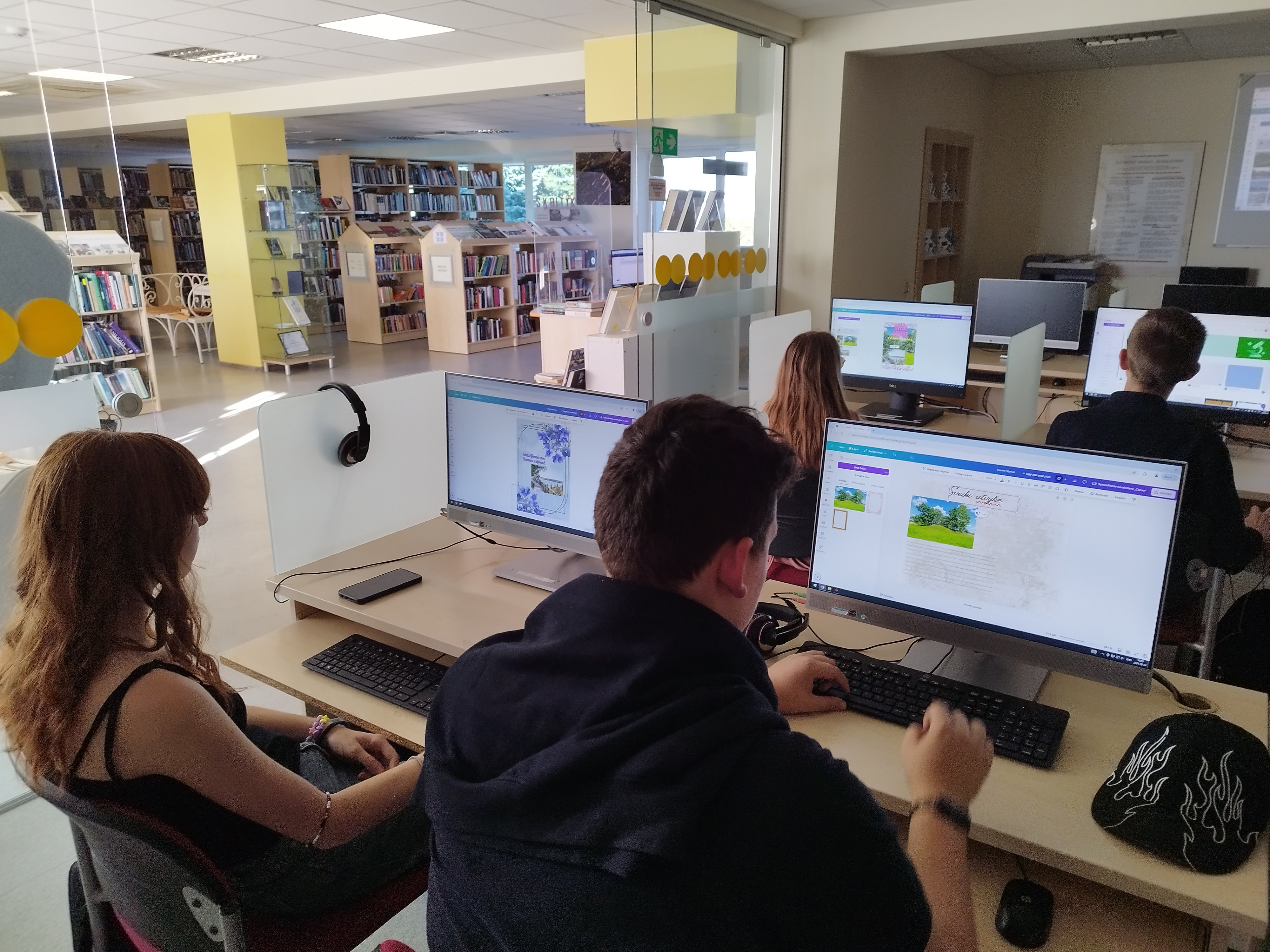 Su edukatore Kristina Meilute moksleiviai kūrė atvirukus naudodami Kauno rajono nuotraukas iš bibliotekos projekto – virtualaus gido „Išmanusis kultūros kelias Kauno rajone“.