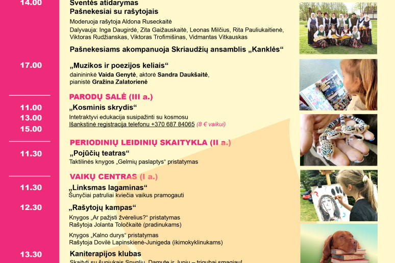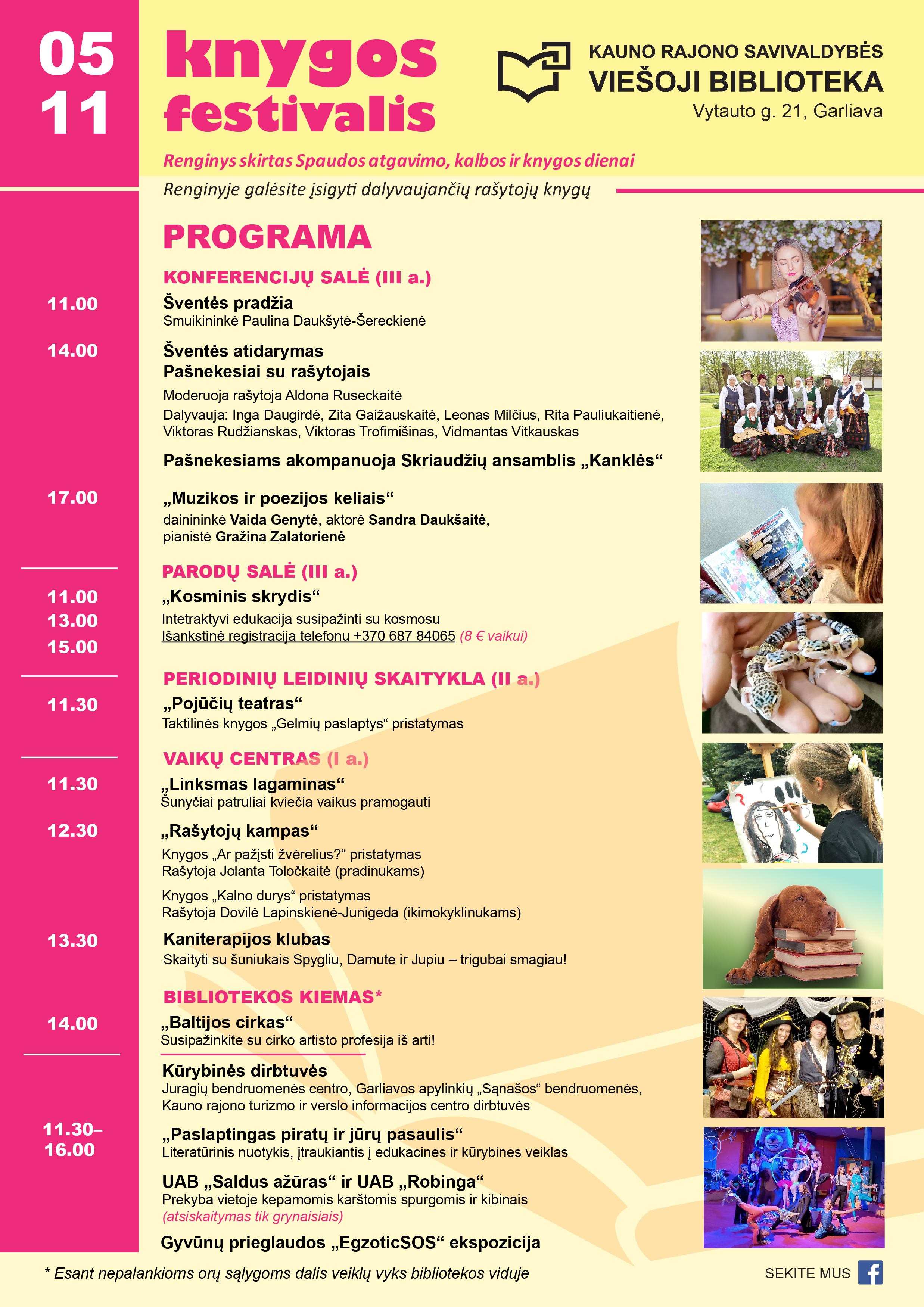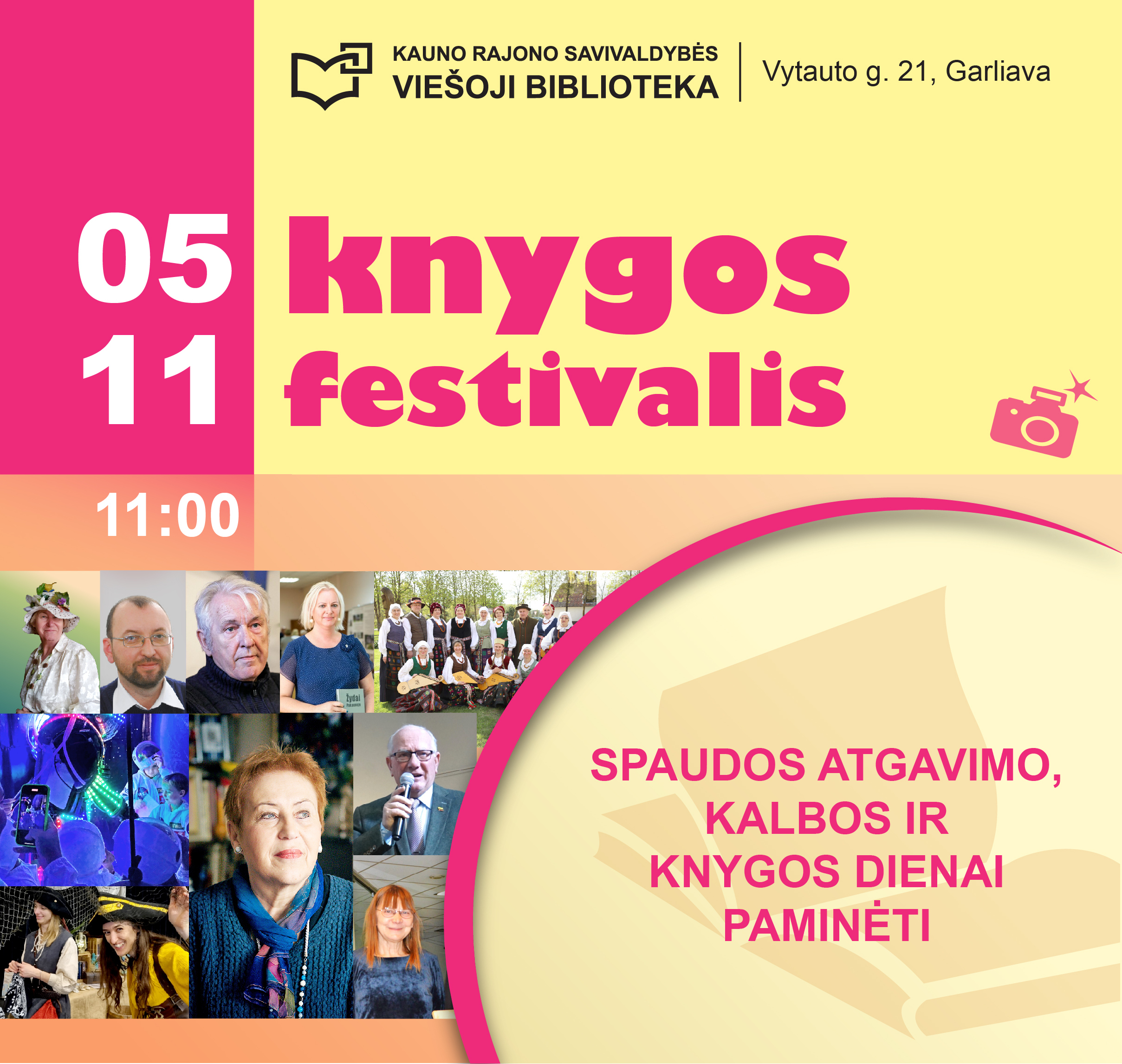 Kviečiame Jus į KNYGOS FESTIVALĮ – didžiausią knygų šventę Kauno rajone! Gausi ir įdomi literatūrinė programa, nenuspėjami ir atviri pašnekesiai su Kauno rajono rašytojais, edukacinės, pramoginės bei interaktyvios veiklos vyks visą dieną. Šventę užbaigs dainininkės Vaidos Genytės, aktorės Sandros Daukšaitės ir pianistės Gražinos Zalatorienės literatūrinė-muzikinė programa „Muzikos ir poezijos keliais“.