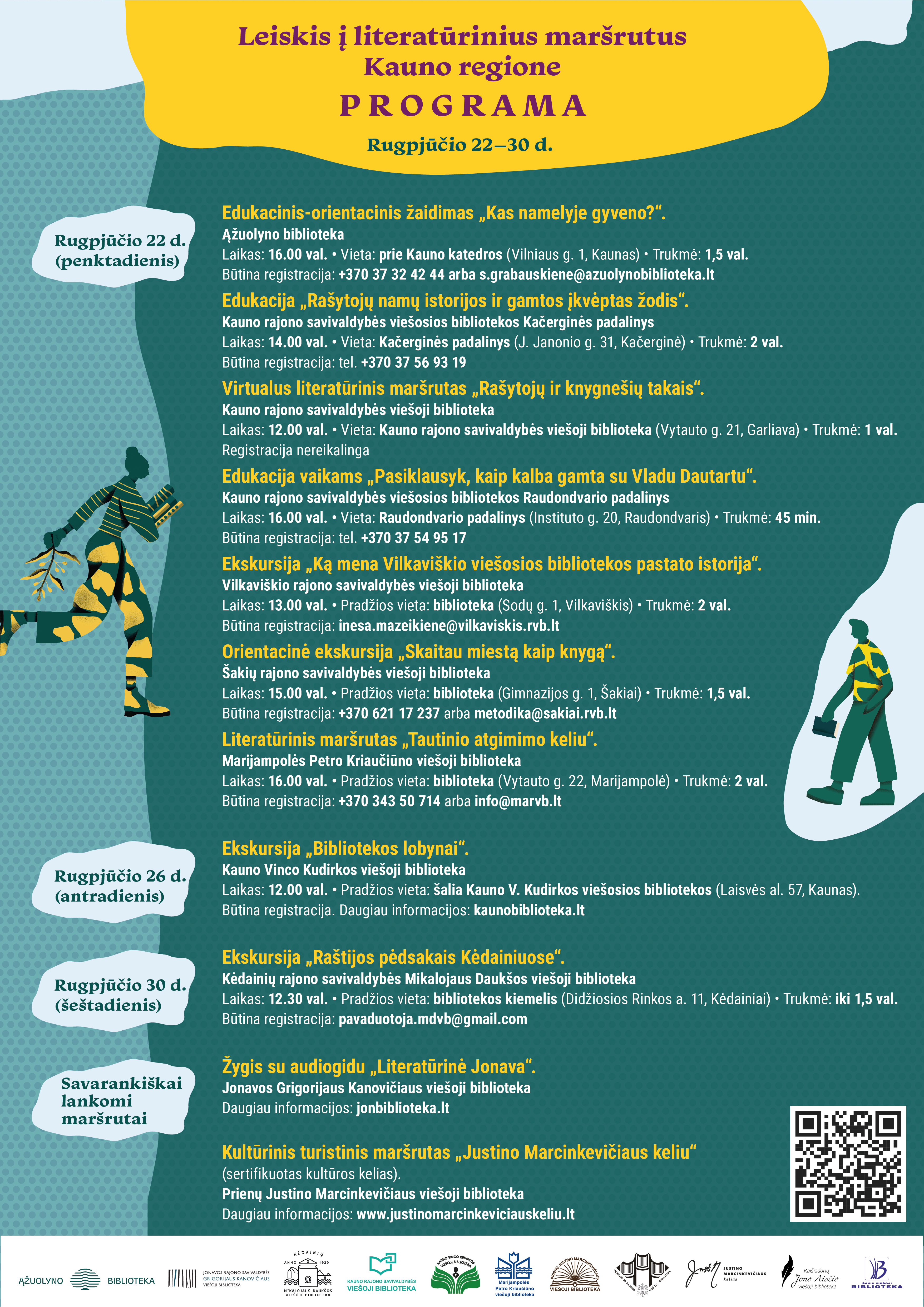 Palydėkime vasarą aktyviai ir prasmingai! Rugpjūčio 22–30 d. leiskimės į kelionę Kauno regiono bibliotekų sukurtais literatūriniais maršrutais, atversiančiais bibliotekų pastatų ir rašytojų gyvenimų istorijos puslapius. Taip pat laukia orientaciniai žaidimai ir įvairios edukacinės veiklos. Kviečiame susipažinti su programa.