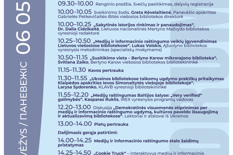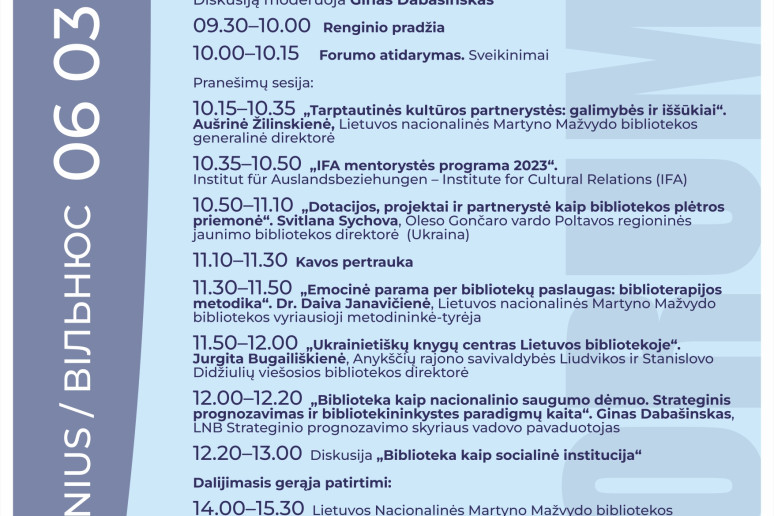 Vilniaus, Panevėžio, Kupiškio bibliotekose tarptautinio forumo dalyviai dalinsis patirtimi, diskutuos bibliotekų vadybos, medijų informacinio raštingumo, kultūros paveldo išsaugojimo ir aktualizavimo, bendruomenių įtraukimo, paslaugų prieinamumo, emocinio atsparumo temomis.