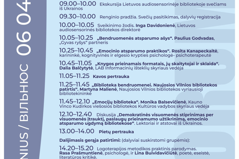 Bus pristatytas į ukrainiečių kalbą išversta dr. Daivos Janavičienės parengta biblioterapijos metodika, skirta padėti spręsti pažeidžiamų visuomenės grupių psichologines problemas. Tikimasi, kad Ukrainos bibliotekininkams leidinys suteiks praktinių žinių apie biblioterapijos taikymo galimybes karą išgyvenančiose bendruomenėse.