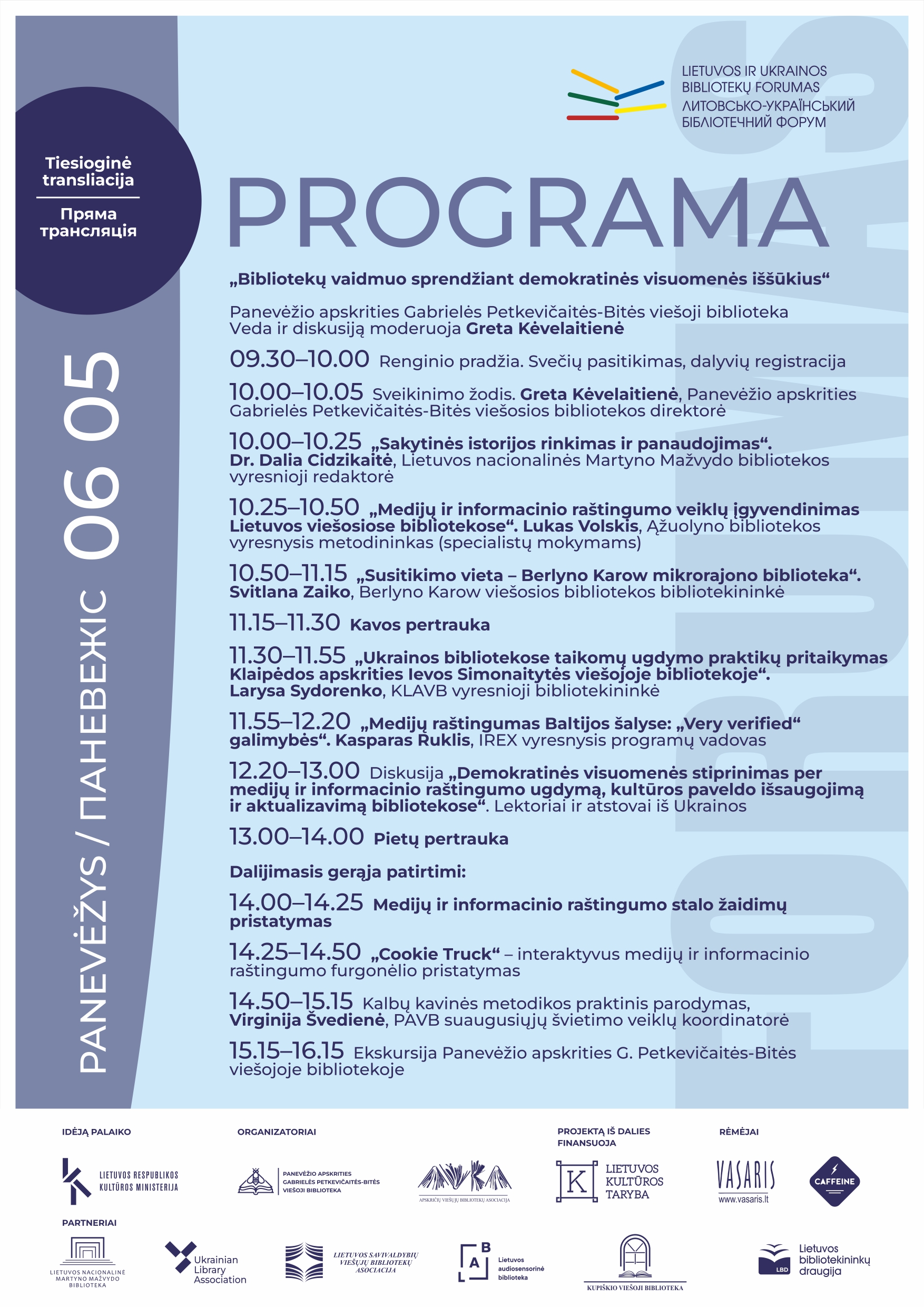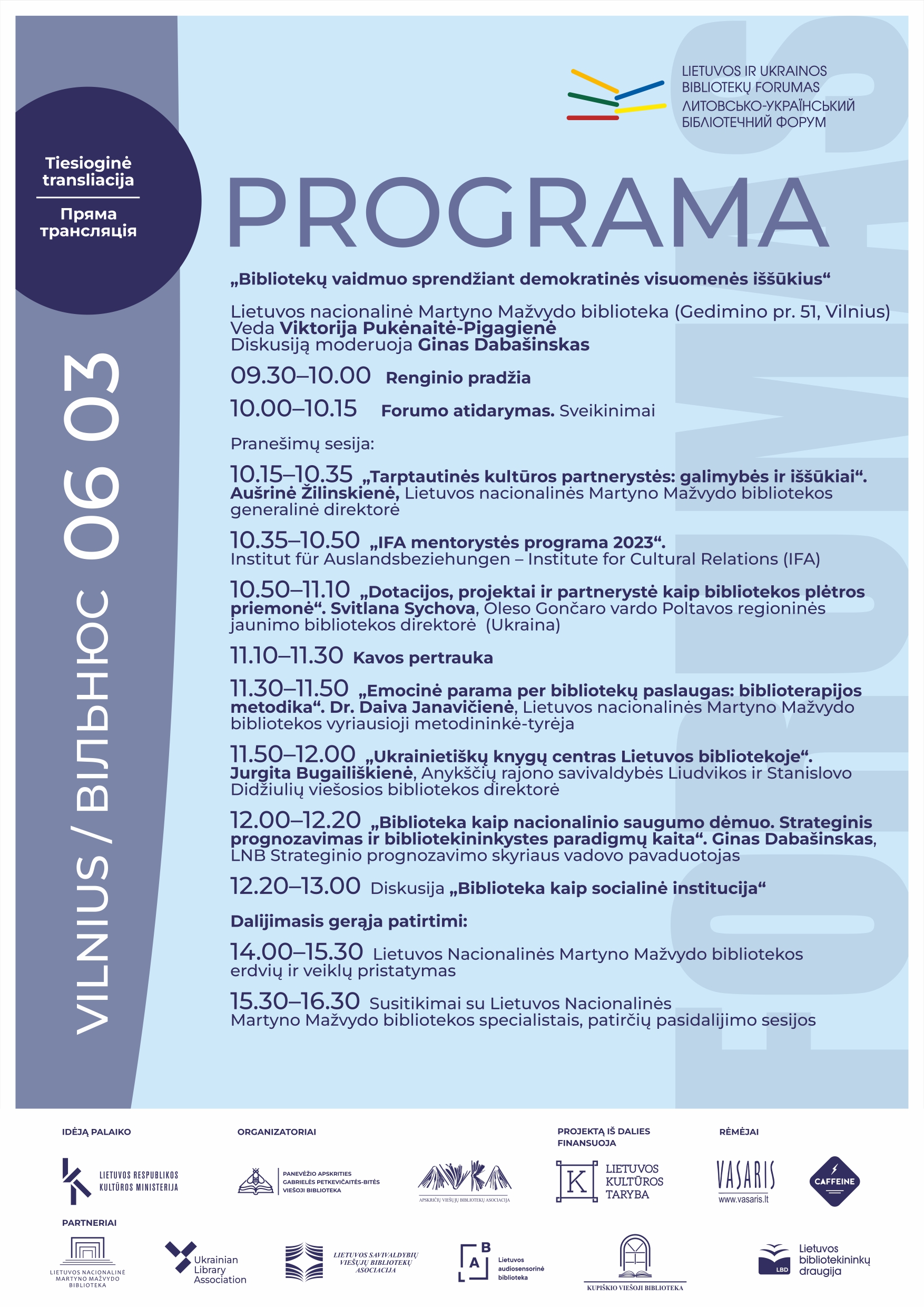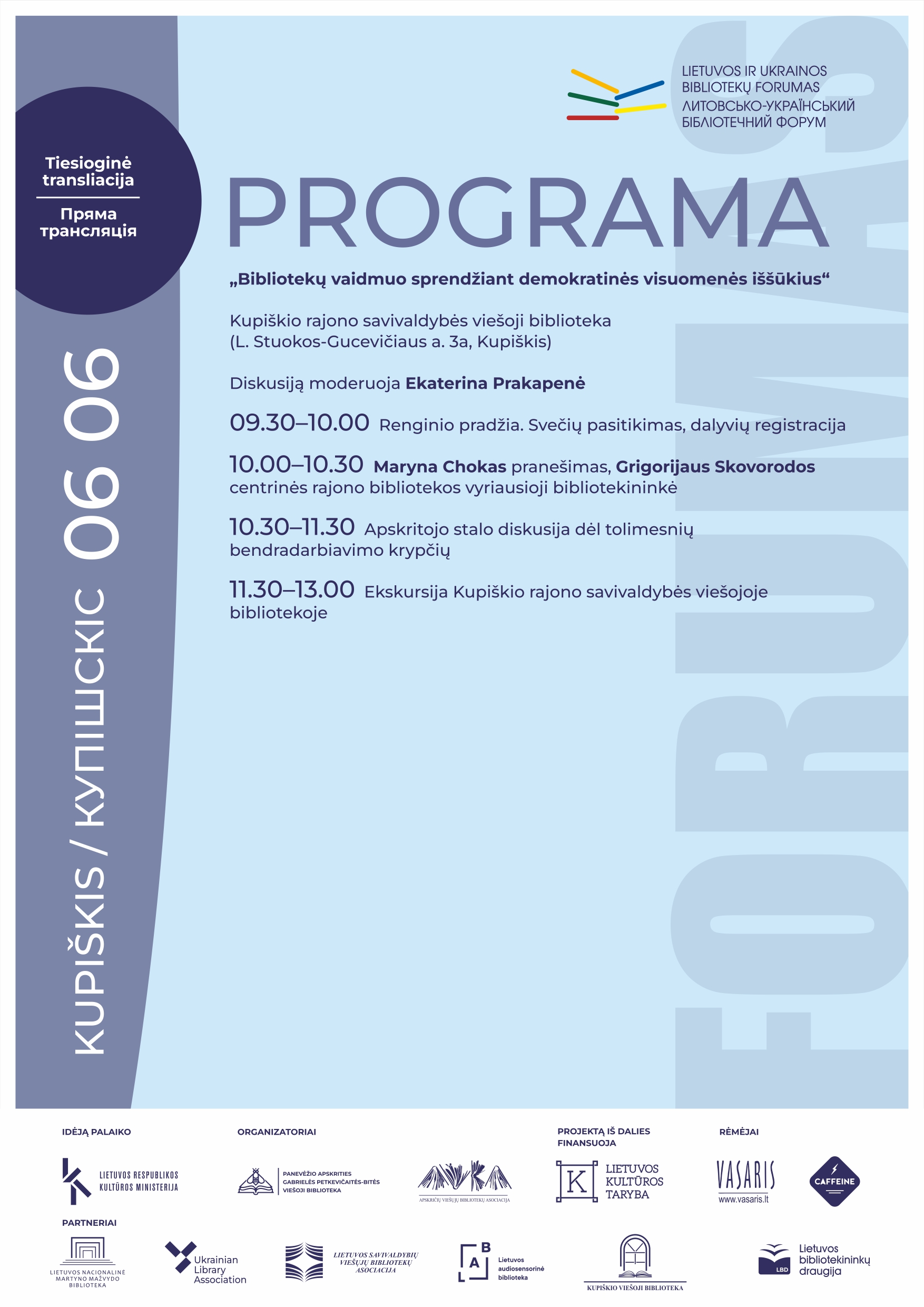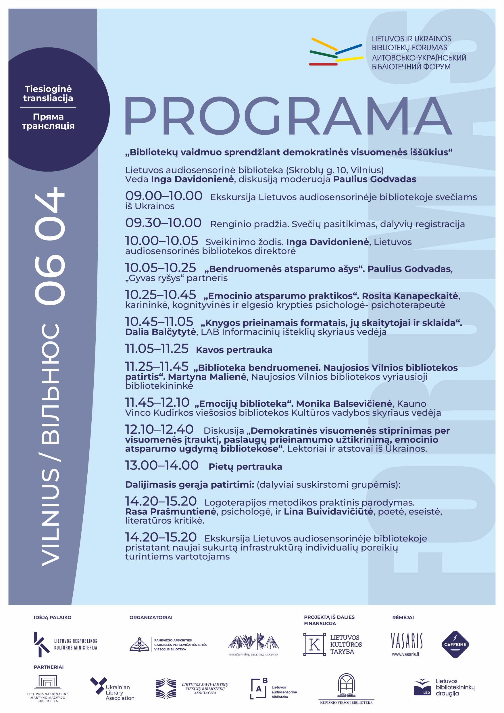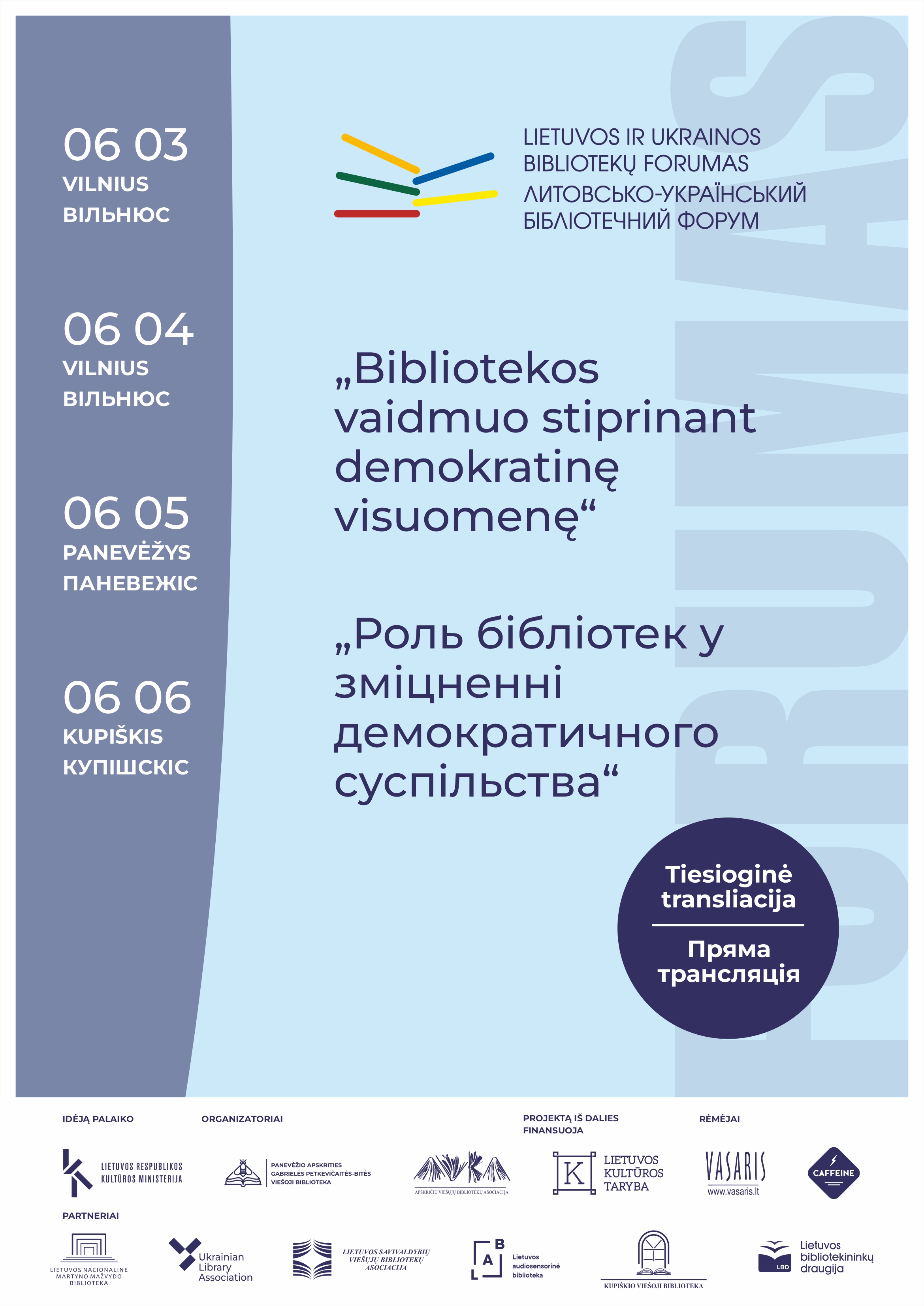 Forume dalyvaus Ukrainos bibliotekininkai, Lietuvos bibliotekų specialistai, vietos bendruomenių atstovai. Vilniaus, Panevėžio ir Kupiškio bibliotekose vyksiantis renginys visuomenei bus tiesiogiai transliuojamas internetu.
