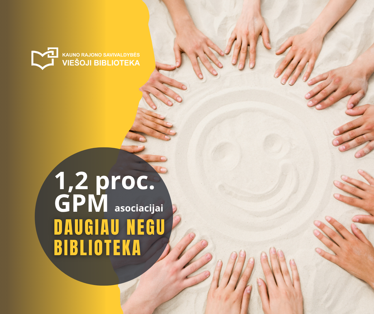 Kviečiame skirti 1,2 proc. gyventojų pajamų mokesčio (GPM) Kauno rajono savivaldybės viešosios bibliotekos ir padalinių inovatyvioms veikloms vykdyti, moksleivių atostogų užimtumo programoms įgyvendinti, kultūriniams renginiams organizuoti. Bibliotekininkų ir bibliotekos veikloms neabejingų, aktyvių, bendruomeniškų asmenų įsteigta asociacija „Daugiau negu biblioteka“ – verta Jūsų pasitikėjimo. Prašymą (FR0512 forma) pateikite elektroniniu būdu per VMI elektroninio deklaravimo sistemą iki 2026 m. gegužės 4 d.