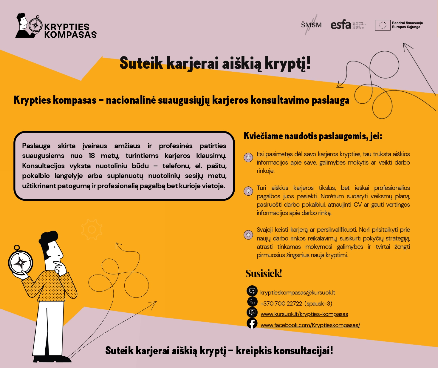Konsultacijos vyksta nuotoliniu būdu – telefonu, el. paštu, pokalbio langelyje arba suplanuotų nuotolinių sesijų metu, todėl paslauga yra patogi ir prieinama nepriklausomai nuo gyvenamosios vietos. Taip pat kviečiame sekti „Krypties kompaso“ „Facebook“ paskyrą (https://www.facebook.com/Kryptieskompasas/), kur reguliariai dalinamasi praktine informacija ir karjeros patarimais.