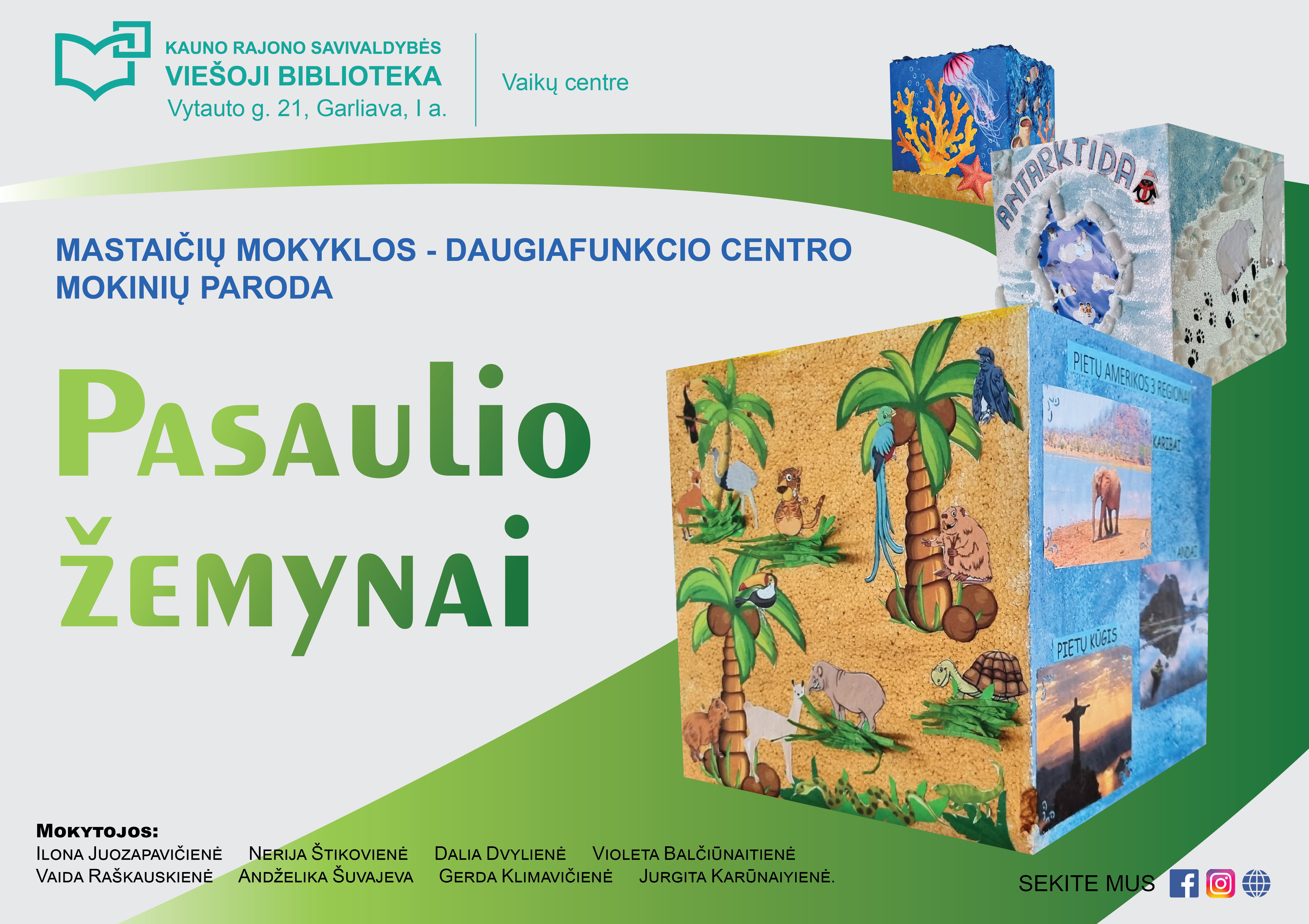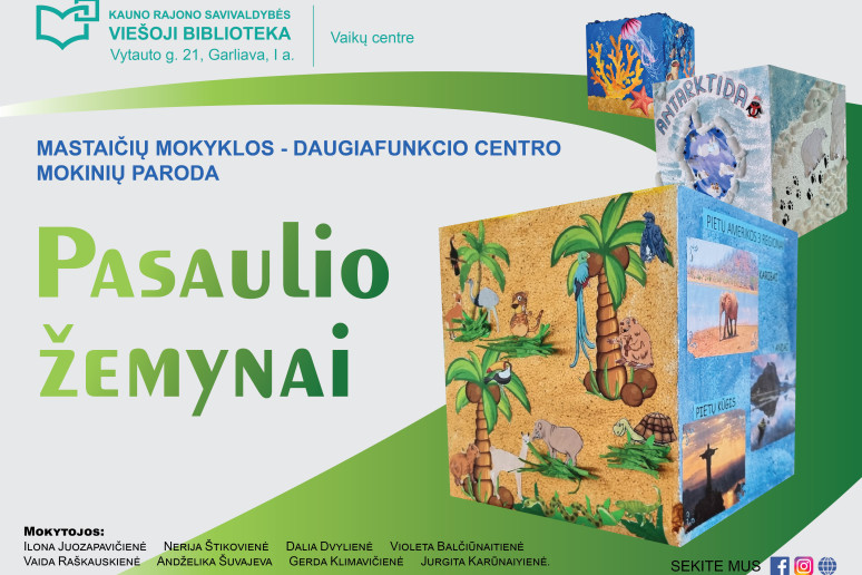 Vaikštinėdami bibliotekos I aukšte, Vaikų centre, tarp knygų lentynų, žvilgtelėkite viršun – maloniai nustebsite išvydę originalią ir itin kūrybišką Mastaičių mokykla - daugiafunkcis centras ikimokyklinio ir priešmokyklinio ugdymo ugdytinių ir mokytojų darbų parodą „Pasaulio žemynai“. Kviečiame pasigrožėti.