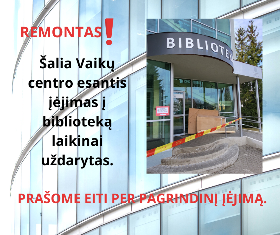Informuojame bibliotekos lankytojus, jog dėl bibliotekos keltuvo remonto darbų laikinai uždarytas įėjimas į biblioteką, esantis šalia Vaikų centro durų. Atsiprašome už laikinus nepatogumus. Rekomenduojame eiti per pagrindinį bibliotekos įėjimą (pro knygomatą).