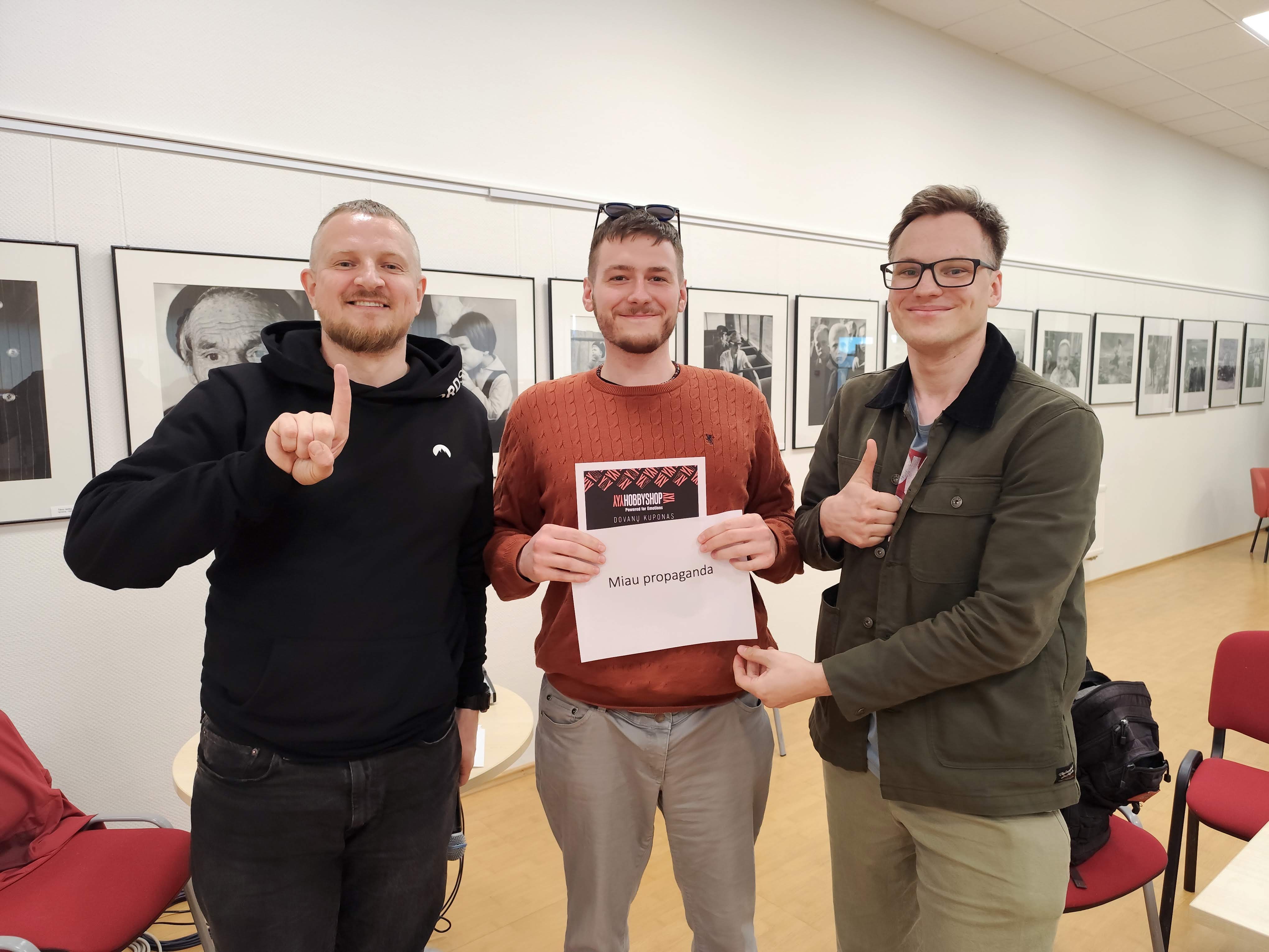 Trims geriausiai pasirodžiusioms komandoms atiteko stalo žaidimų ir galvosūkių parduotuvės dovanų čekiai, o puikių įspūdžių ir naujų žinių namo parsinešė bene visi vakaro dalyviai. Pirmą vietą užėmusi komanda „Miau propaganda“ turės galimybę kovoti superfinale Medijų ir informacinio raštingumo savaitės metu.