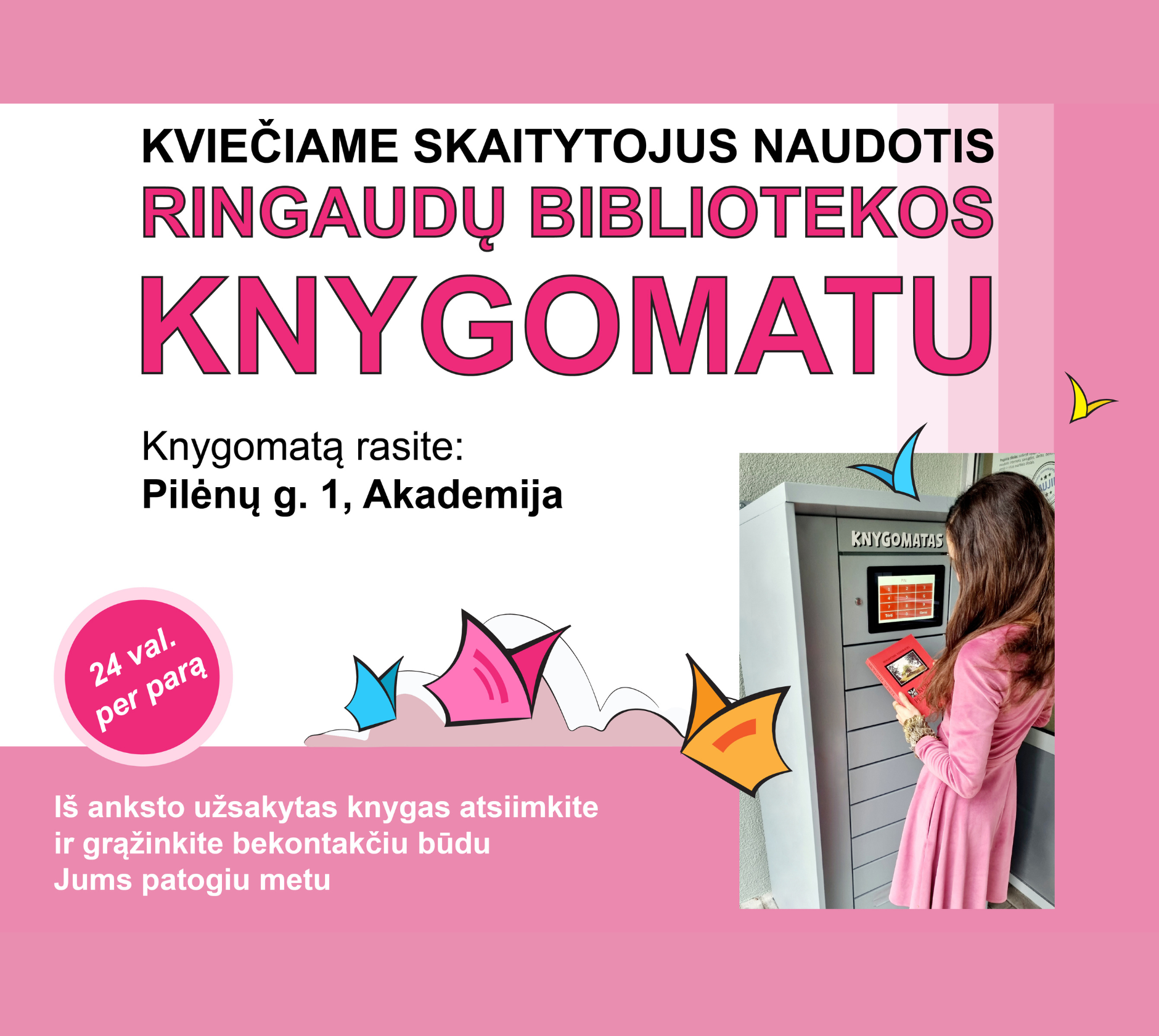 Kauno rajono savivaldybės viešoji biblioteka siekia padaryti Jūsų draugystę su knyga dar sklandesnę ir malonesnę! Akademijoje, Pilėnų g. 1, pradeda veikti naujas KNYGOMATAS. Pasinaudokite galimybe iš Ringaudų bibliotekos iš anksto užsakytas knygas atsiimti bekontakčiu būdu 24 val. per parą.