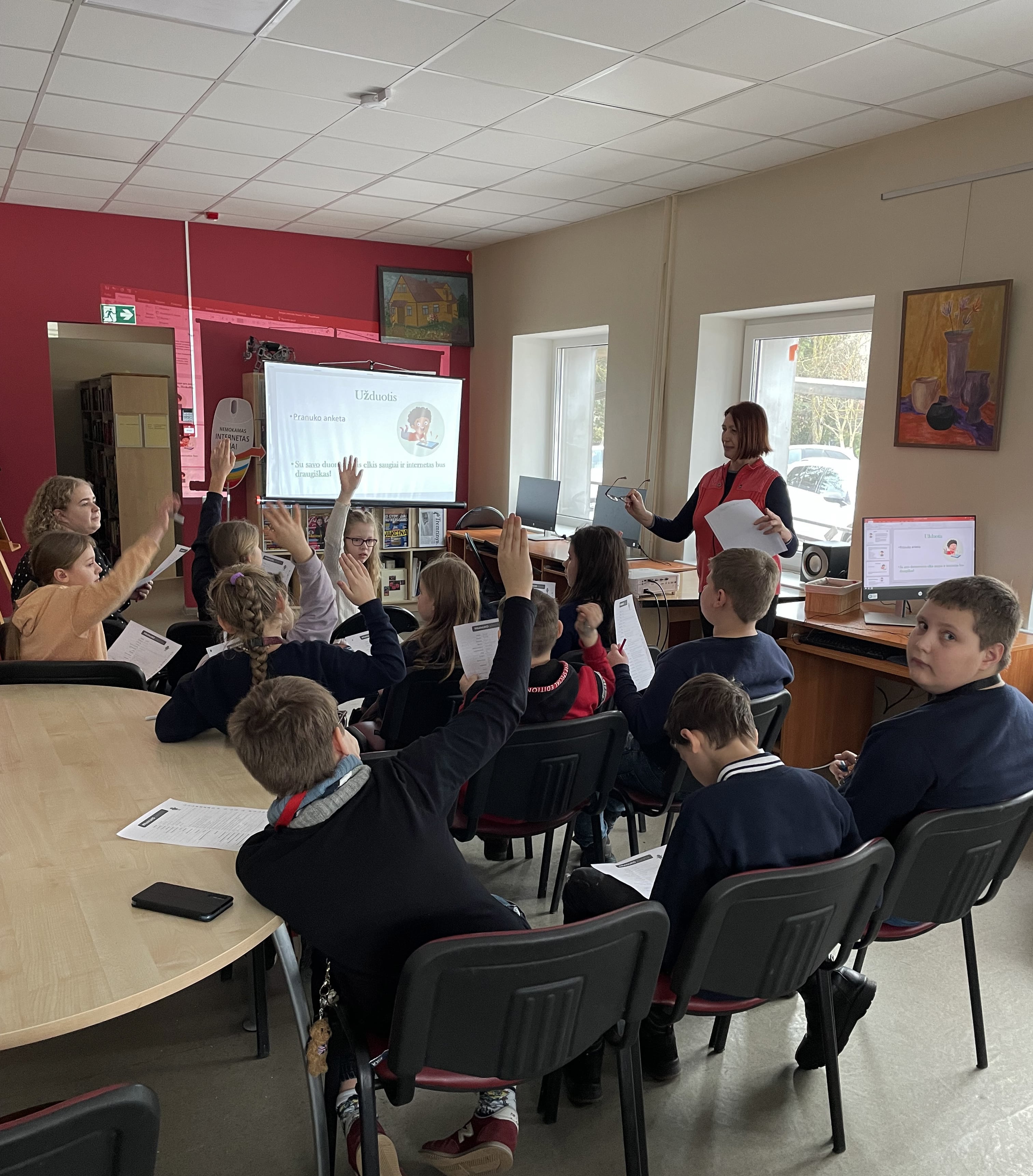 Ringaudų bibliotekoje susirinkę Ringaudų pradinės mokyklos ketvirtokai diskutavo apie saugaus naršymo internete taisykles ir slypinčius pavojus, kalbėjome apie slaptažodžių kūrimą ir kokius duomenis geriausia naudoti bendraujant bei naršant internete, ką galima skelbti, o ko griežtai ne. Taip pat daug diskutavome apie elektronines patyčias ir kur reikėtų kreiptis jas pastebėjus. Popietės pabaigoje pasitikrinti savo žinias moksleiviai galėjo dalyvaudami viktorinoje „Aš saugus internete“.