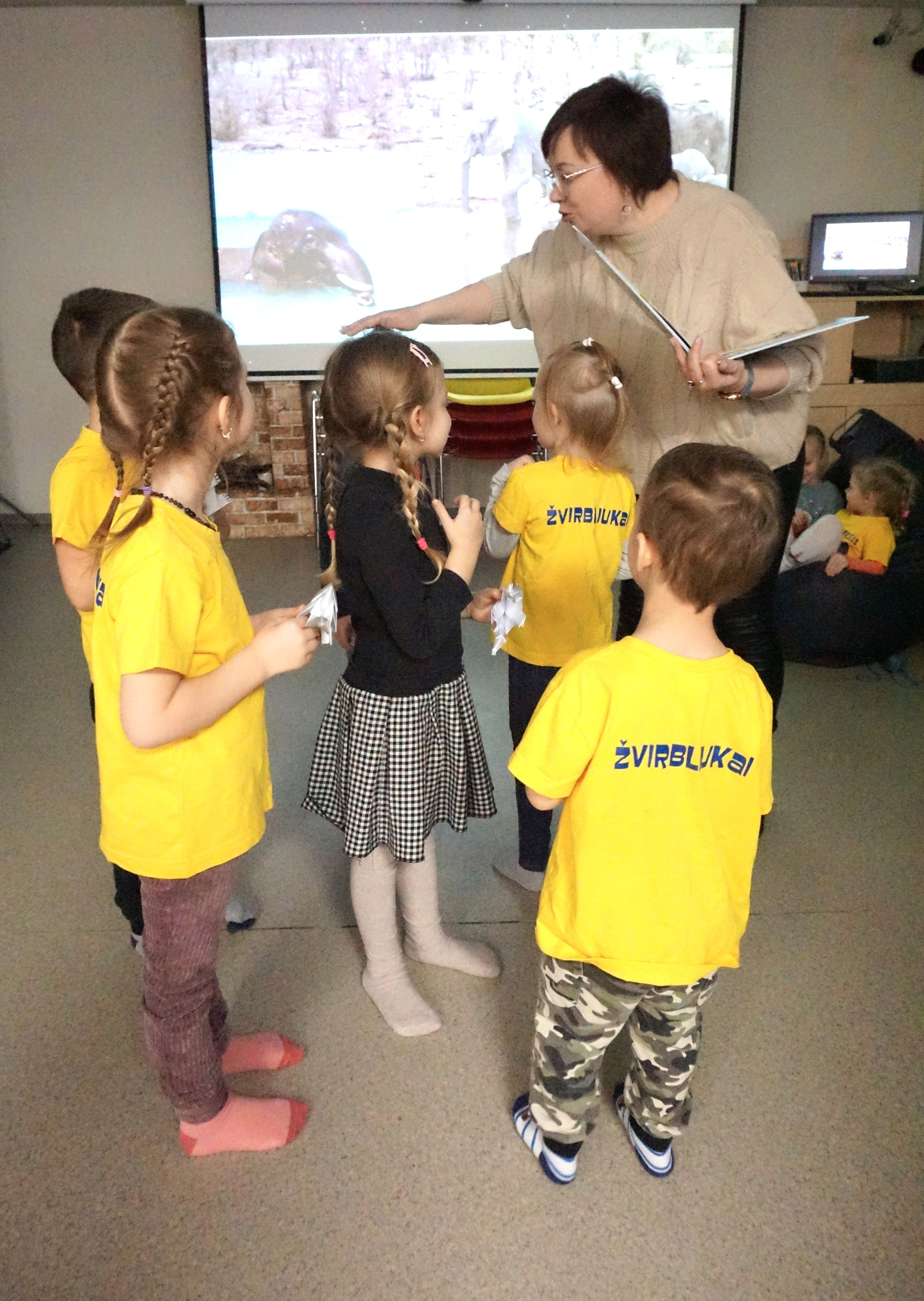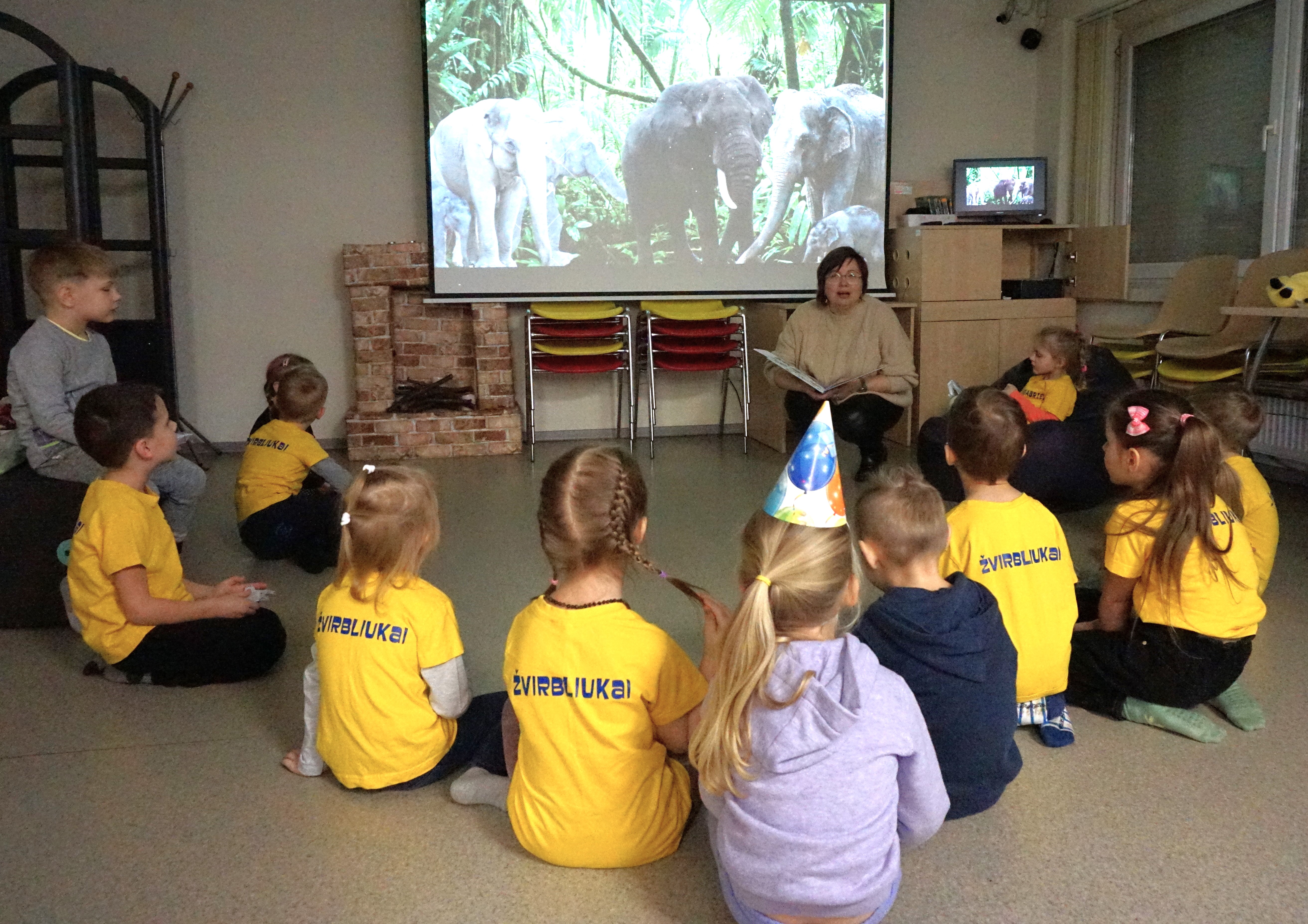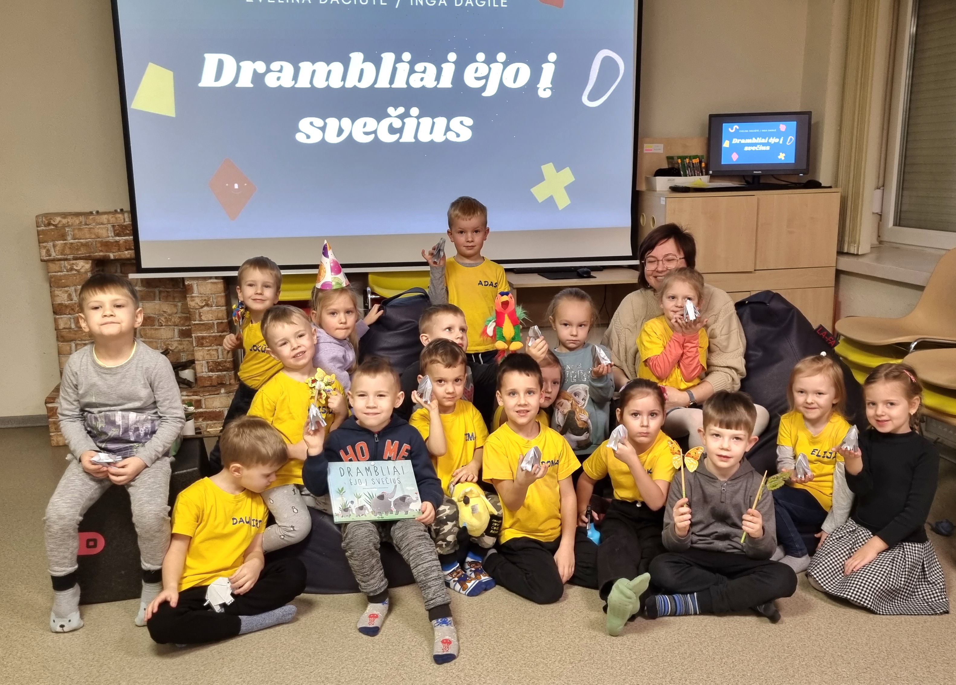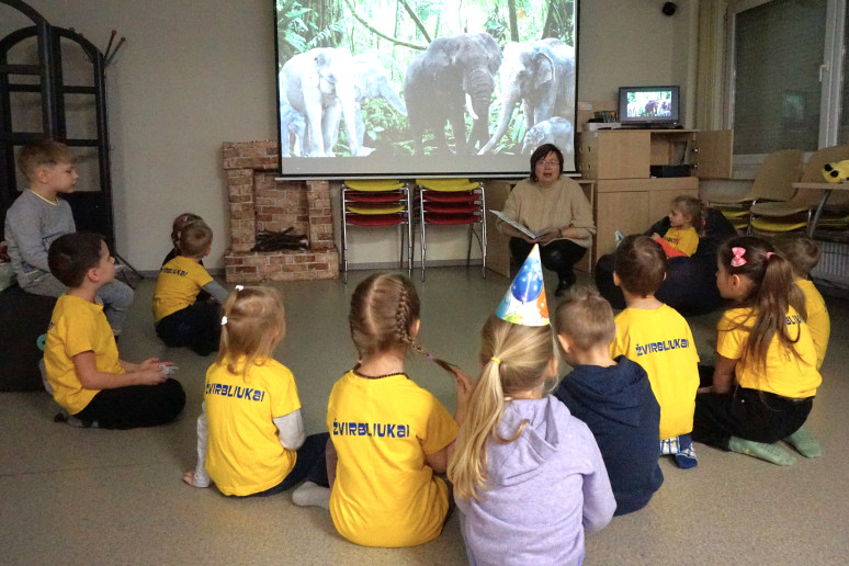 Šiandien Kauno rajono savivaldybės viešosios bibliotekos Vaikų centre lankėsi lopšelio-darželio „Obelėlė“ „Žvirbliukų“ grupė su auklėtoja Dovile. Vaikams nepamirštamų įspūdžių suteikė sensoriniai skaitymai naudojant Evelinos Daciūtės parašytą ir Ingos Dagilės iliustruotą knygą „Drambliai ėjo į svečius“.