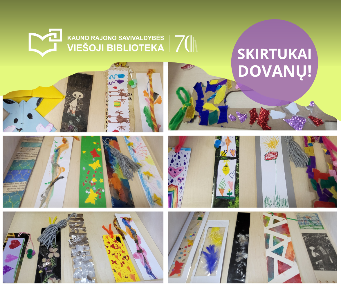 Kauno rajono savivaldybės viešosios bibliotekos skaitytojams – maloni staigmena! Kauno rajono Garliavos lopšelio-darželio „Uosiukas“ vaikai dovanoja rankų darbo knygų skirtukus, pagamintus iš antrinių žaliavų ir skatinančius tvarumą bei ekologiškai sąmoningą gyvenseną. Skirtukus rasite bibliotekos I aukšte, Vaikų centre. Išsirinkite norimą knygą, labiausiai patinkantį skirtuką ir... skriekite vaizduotės sparnais! Ačiū mažiesiems bibliotekos bičiuliams.