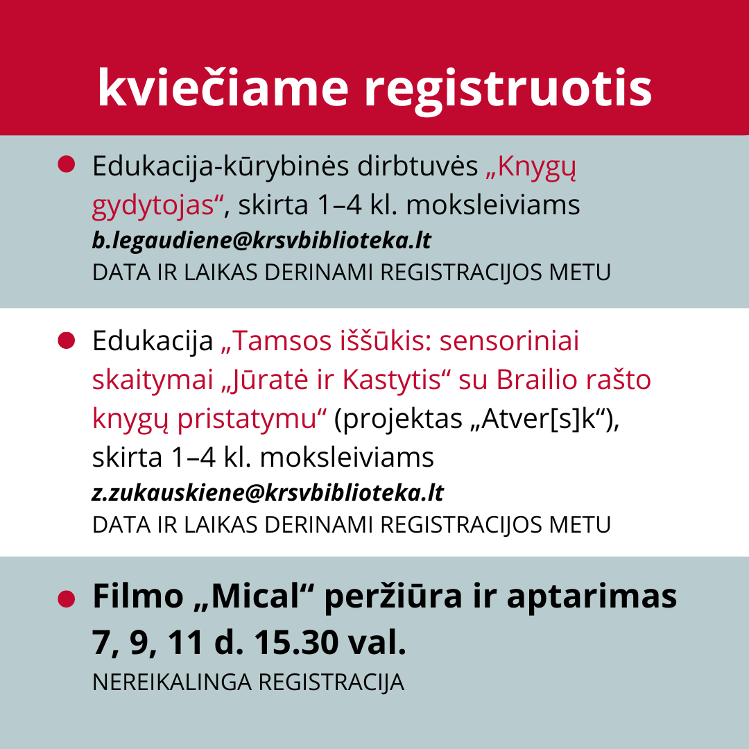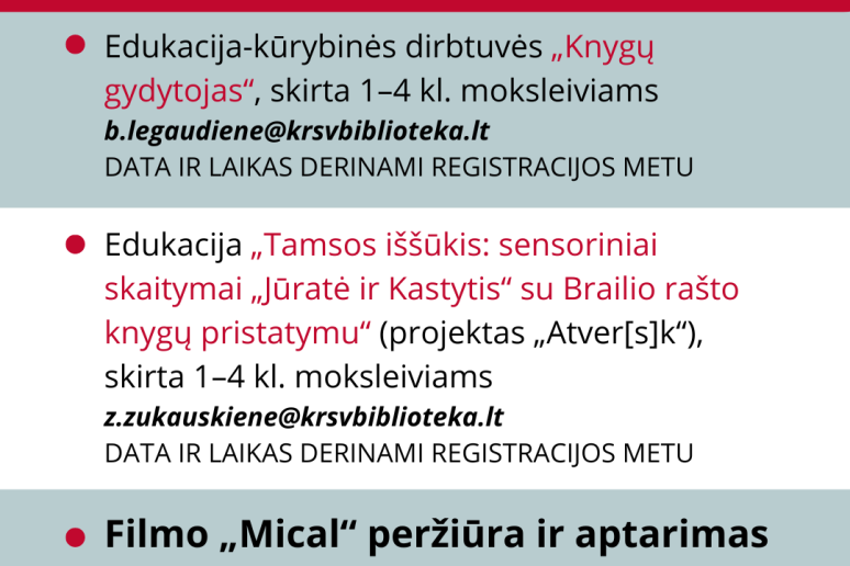 ••• Edukacija „Tamsos iššūkis: sensoriniai skaitymai „Jūratė ir Kastytis“ su Brailio rašto knygų pristatymu“, skirtas Baltosios lazdelės dienai paminėti. Projektas „Atver[s]k“. Skirta 1–4 kl. moksleiviams