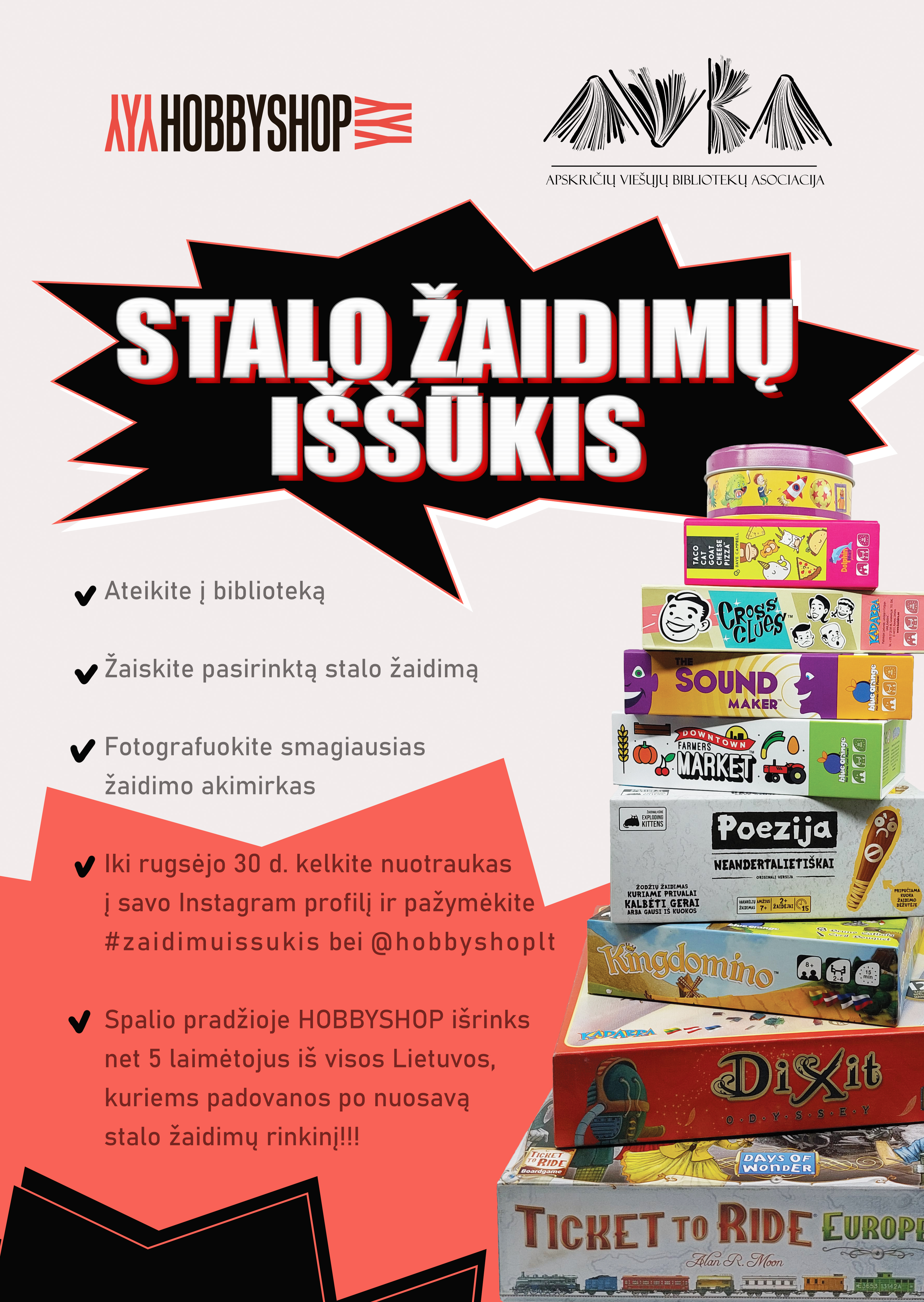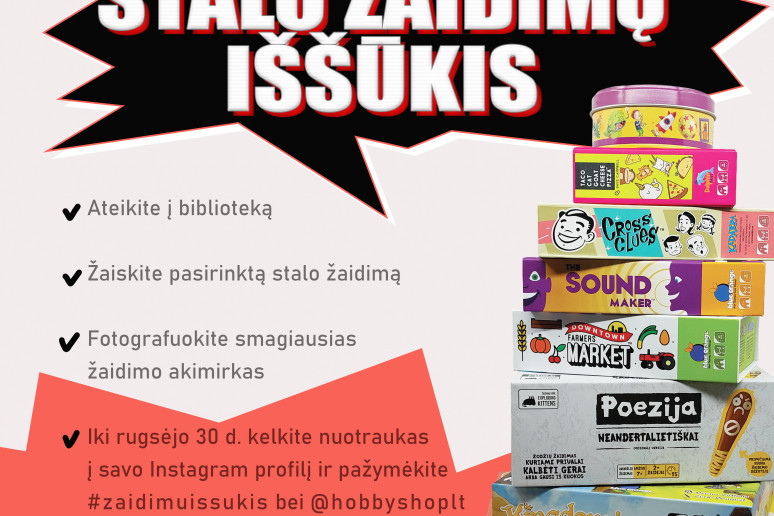 Regioninių iniciatyvų „Vasara su knyga“, „Metai su knyga“ partneris „Hobbyshop“ siūlo dalyvauti stalo žaidimų iššūkyje.