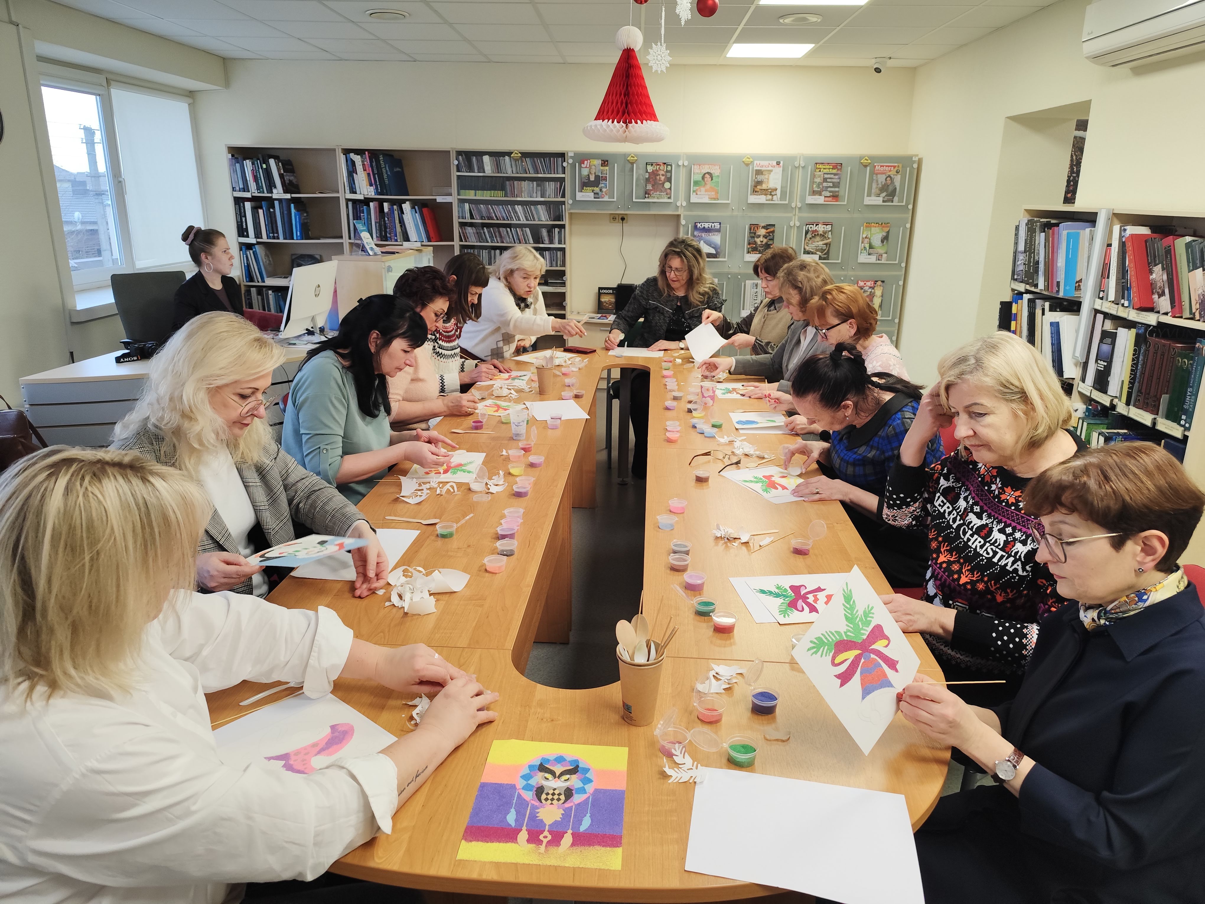 Kol mokiniai užsiėmė kūrybinėmis veiklomis, mokytojos irgi nenuobodžiavo: Kristinos Meilutės vedamose kūrybinėse dirbtuvėse „Tapyba smėliu“ įspūdingai sužibėjo kalėdiniai motyvai.