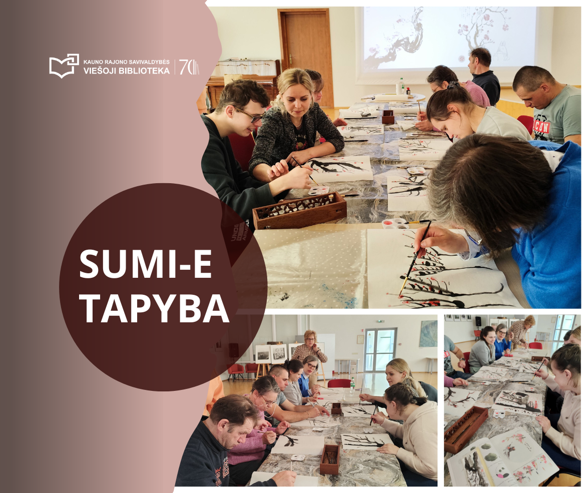 Bibliotekoje VšĮ socialinės terapijos namų „Akvila“ nariai pasinėrė į ramybės kupiną kūrybą – kartu su edukatore tapė sakuras sumi-e technika. Šie trapūs žiedai, pražystantys dar sniege, simbolizuoja tyrumą ir stiprybę. Tušu ir akvarele ant rankų darbo popieriaus gimė žydinčios šakelės – tylūs gamtos ir širdies atspindžiai. Džiaugiamės ilgamete bendryste su VšĮ socialinės terapijos namais „Akvila“ ir bibliotekos veiklomis, įtraukiančiomis kitaip galinčius žmones.