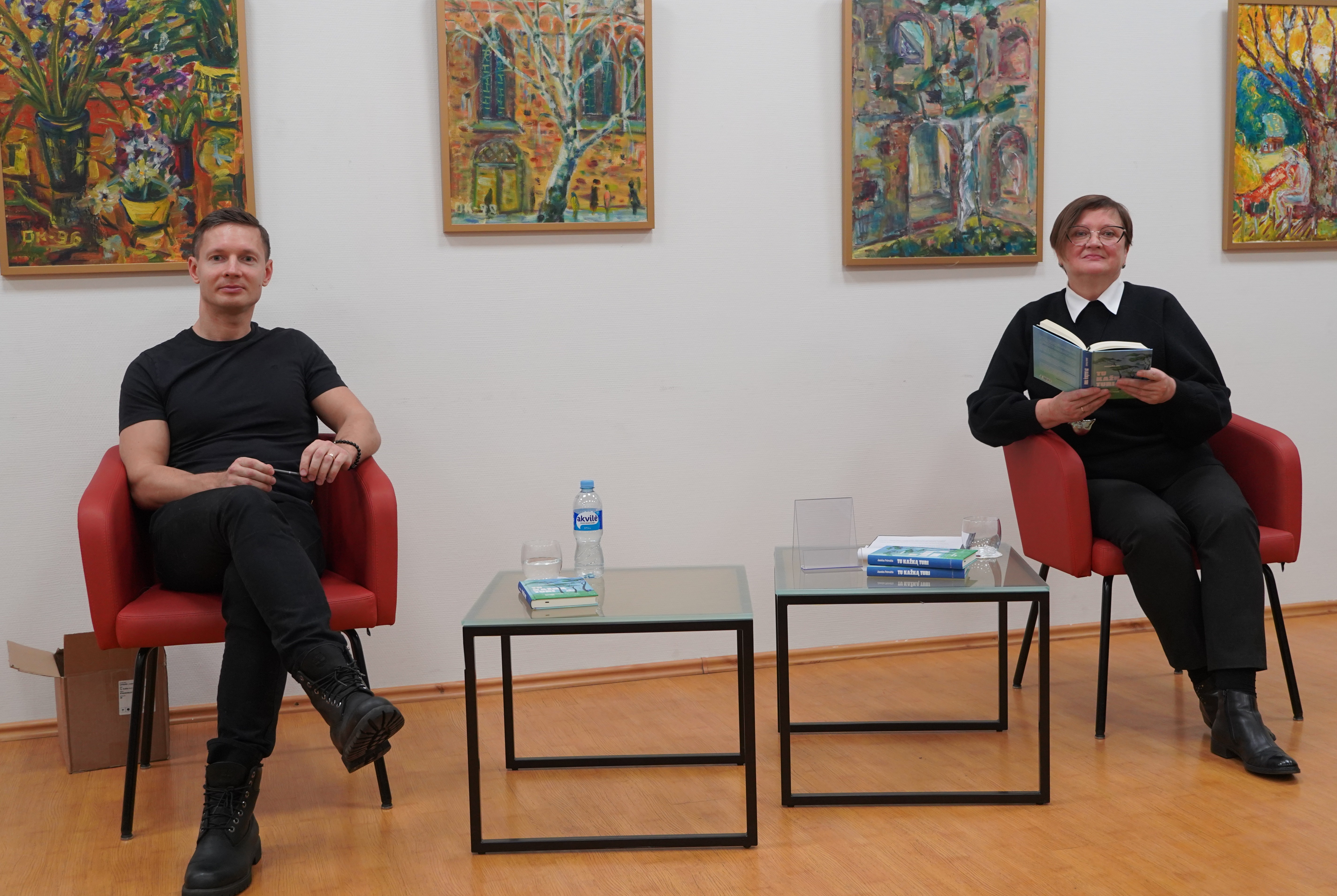 Spalvingų ir labai savitų tapybos darbų, puošiančių salę, kurioje vyko renginys, autorius – šviesaus atminimo dailininkas Olegas Karavajevas, buvęs Garliavos Jonučių gimnazijos technologijų mokytojas. Vaizdinės ir žodinės kūrybos sampynos, įtraukiantis pasakojimas, nuoširdumas, emocijų spalvingumas ir charizma – štai tokį nepaprastą vakarą praleidome bibliotekoje.
